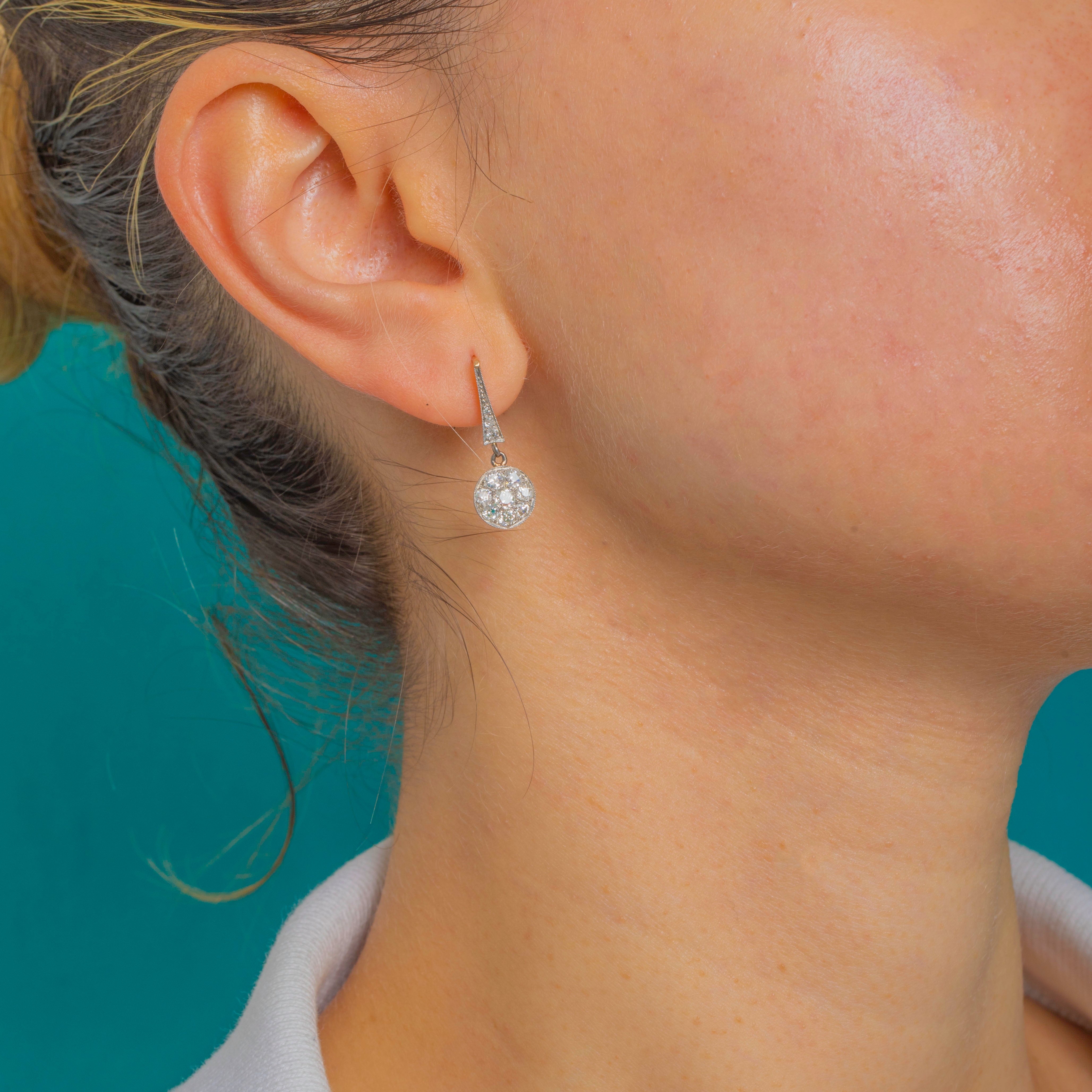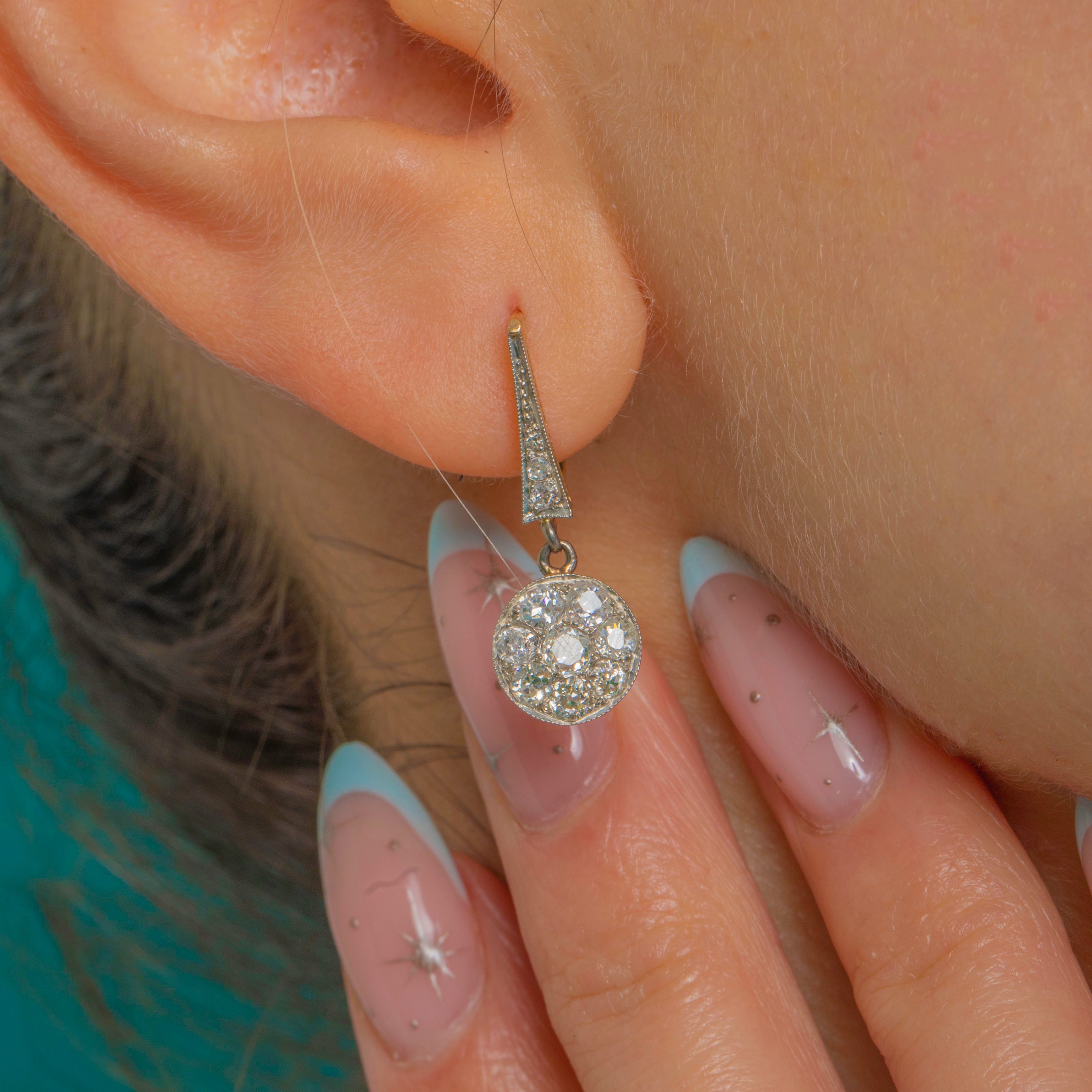 Elegant and beautifully refined, these Art Deco Diamond cluster drop earrings marry Platinum’s icy sheen with the warmth of 18ct Gold. A tapered pavé-set surmount leads to a classic round “daisy” cluster, each edge finished with fine milgrain for that exquisite early-20th-century finesse. The white-topped over yellow construction gives a subtle two‑tone glow that feels both delicate and luxurious.