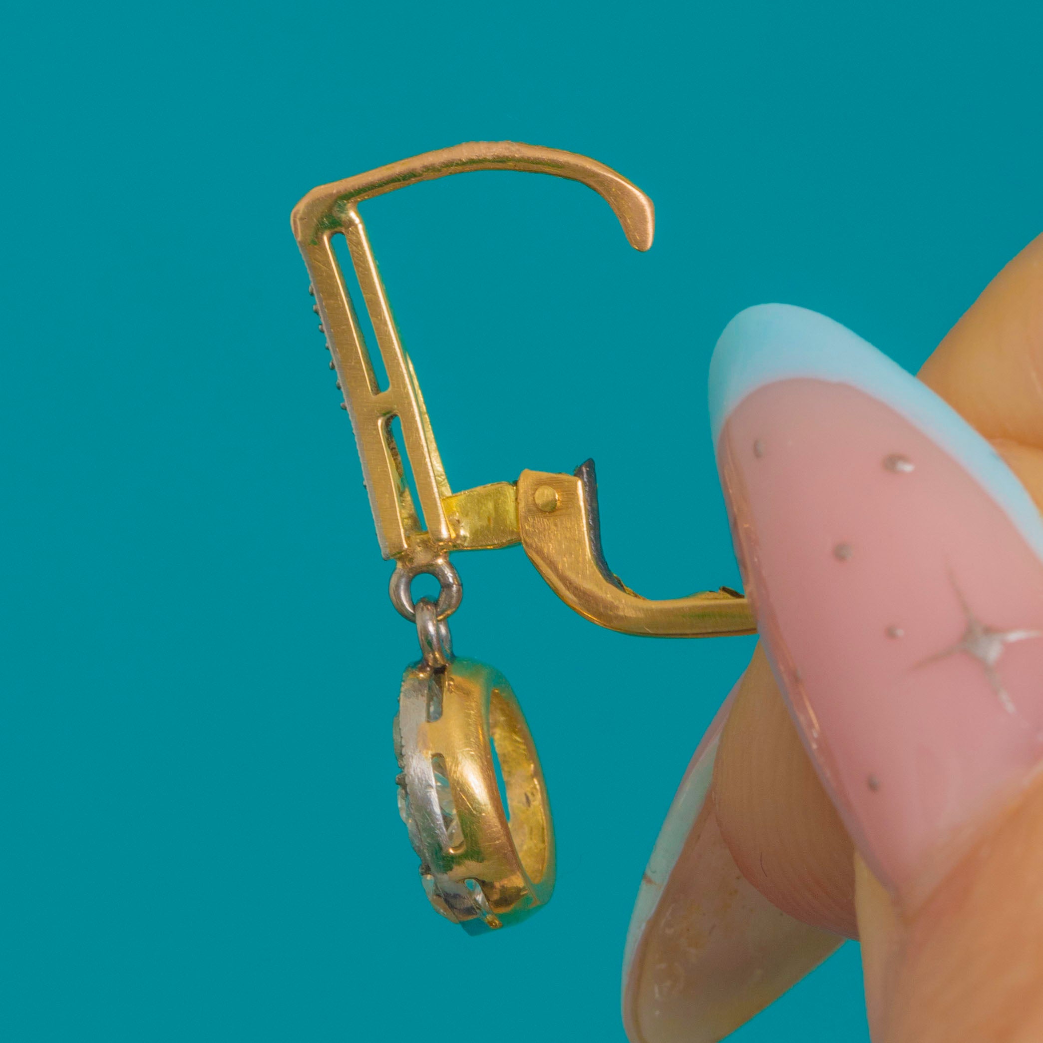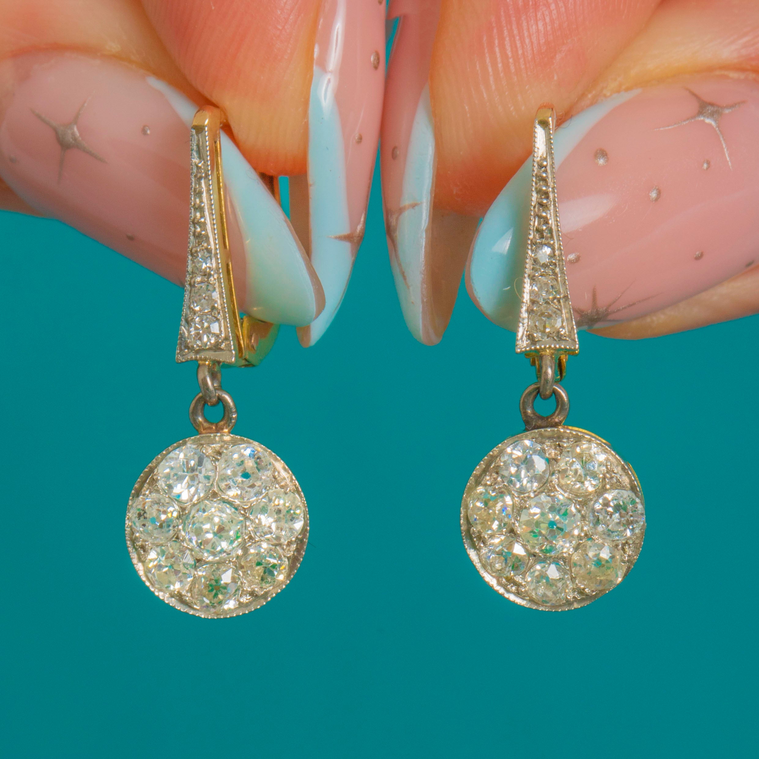 Set throughout with bright, high-crowned old mine-cut Diamonds, the earrings sparkle with a lively, antique charm. The articulated design lends graceful movement, while the crisp hand-finished settings and milgrain beading speak to the craftsmanship of the era—timeless, feminine and effortlessly wearable.