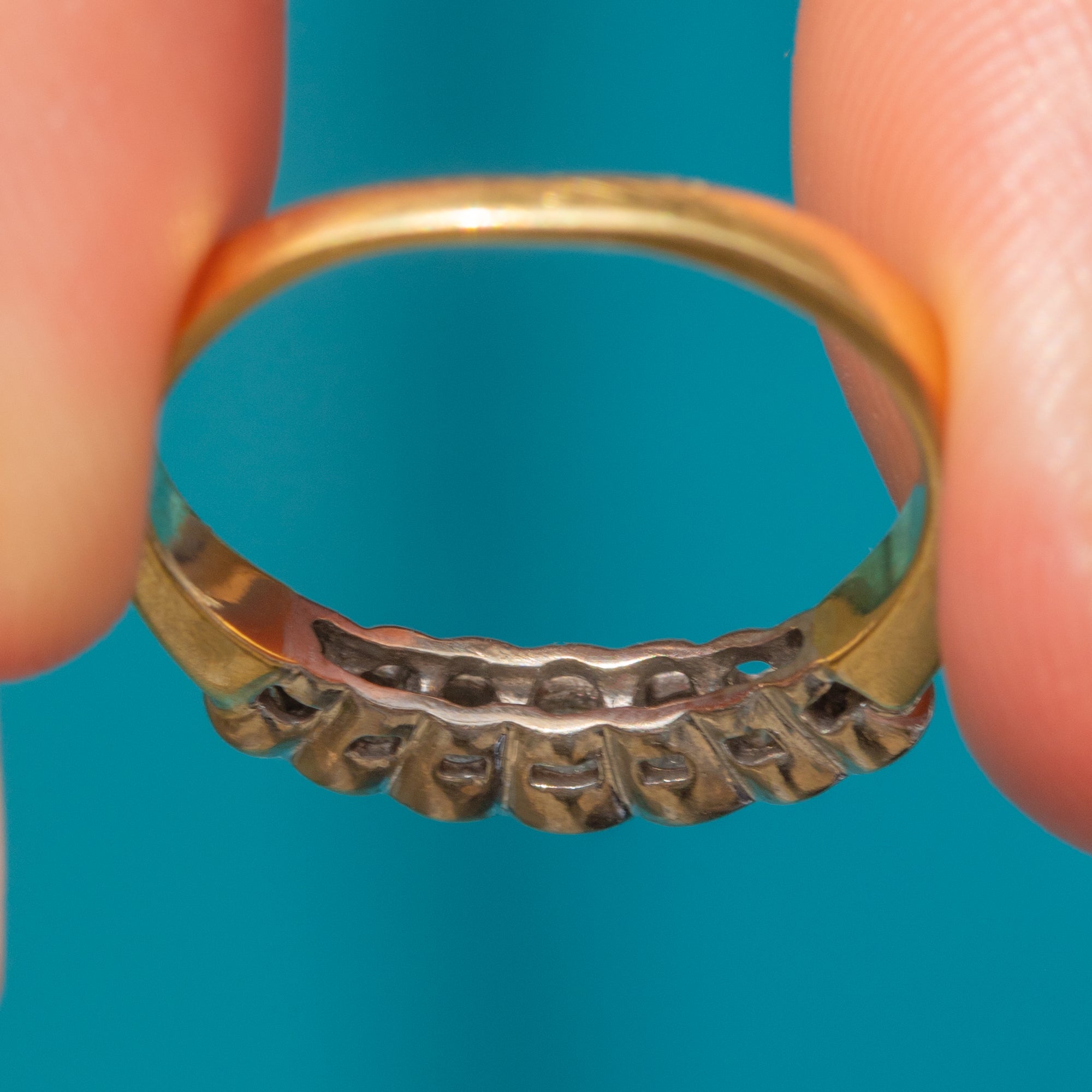 EXCELLENT: A stunning 18ct Gold Diamond ring in excellent vintage condition. All seven scintillating Diamonds are securely set and free from fleabites. The 18ct Yellow and Platinum are in glorious condition, free from dings, dents or scratches.