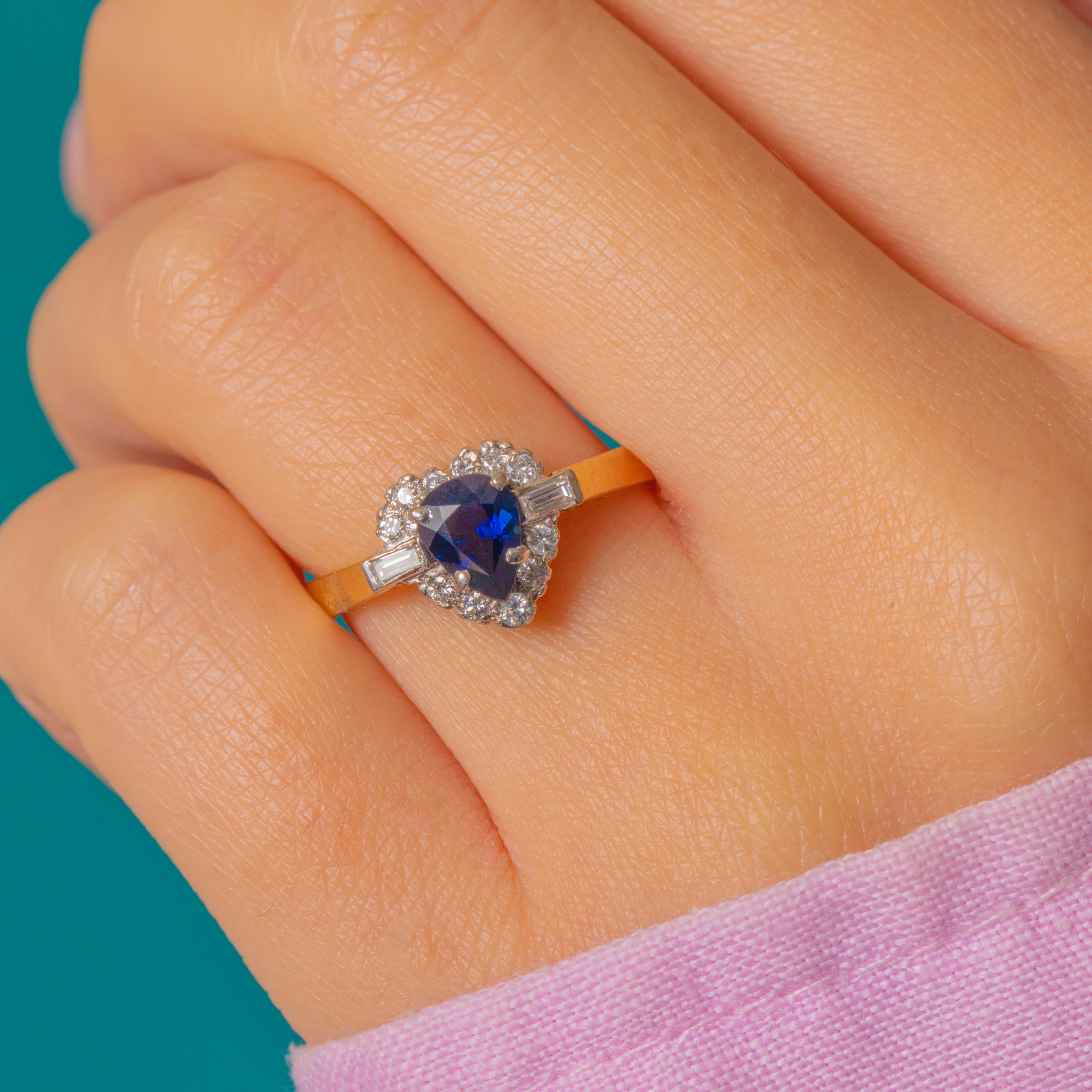 The royal blue Sapphire has been faceted wonderfully, hugged by Platinum claws and resting elegantly on a buttery 18ct Gold band. Crafted into an adorable romantic heart shape, this vintage Sapphire and Diamond ring would make the perfect choice for a unique engagement ring!