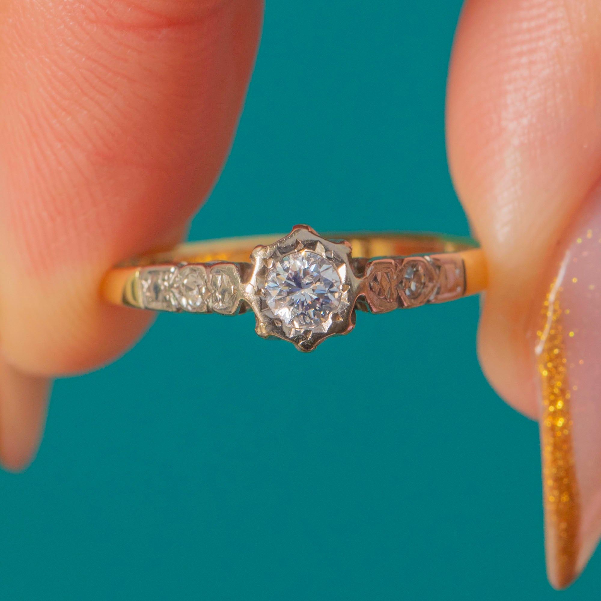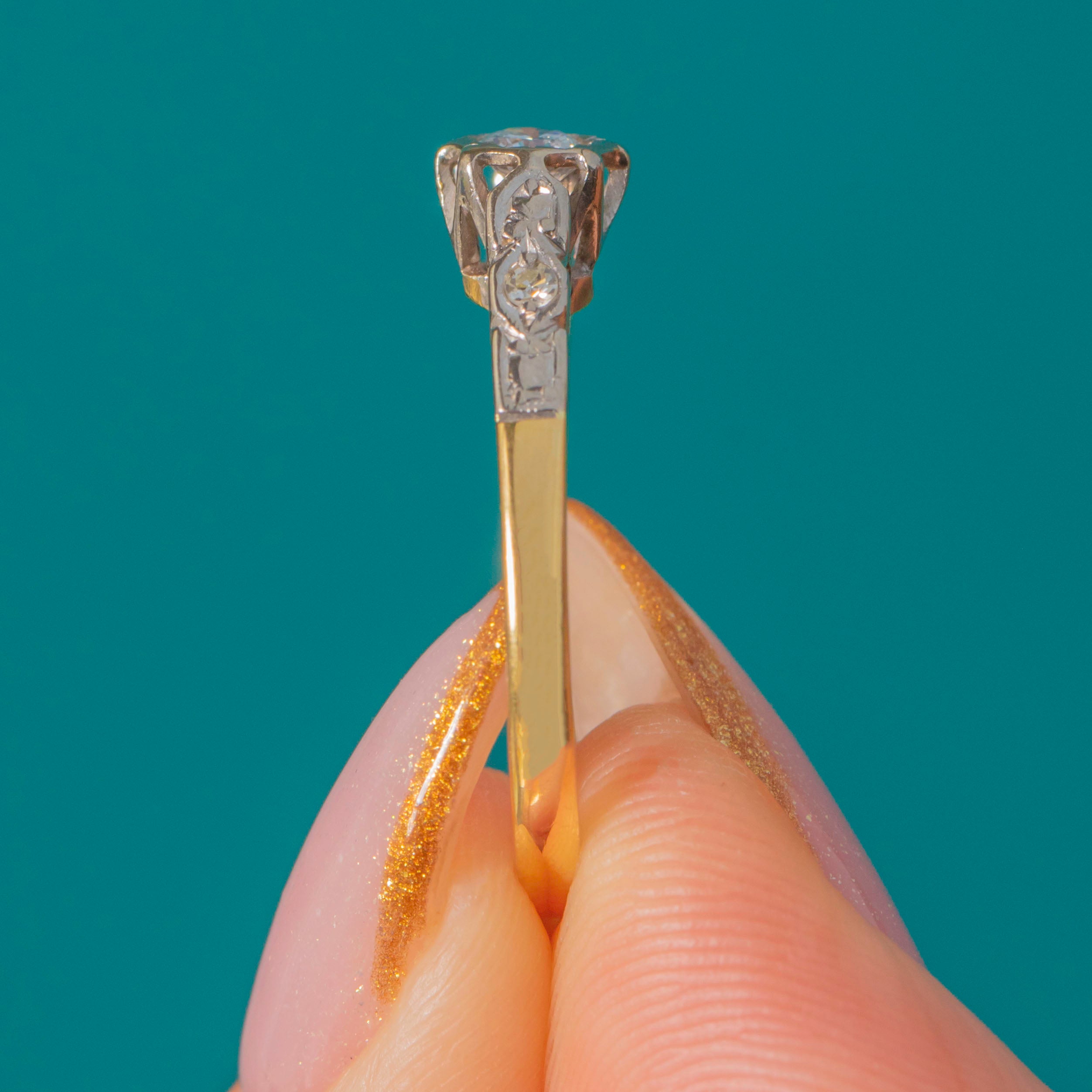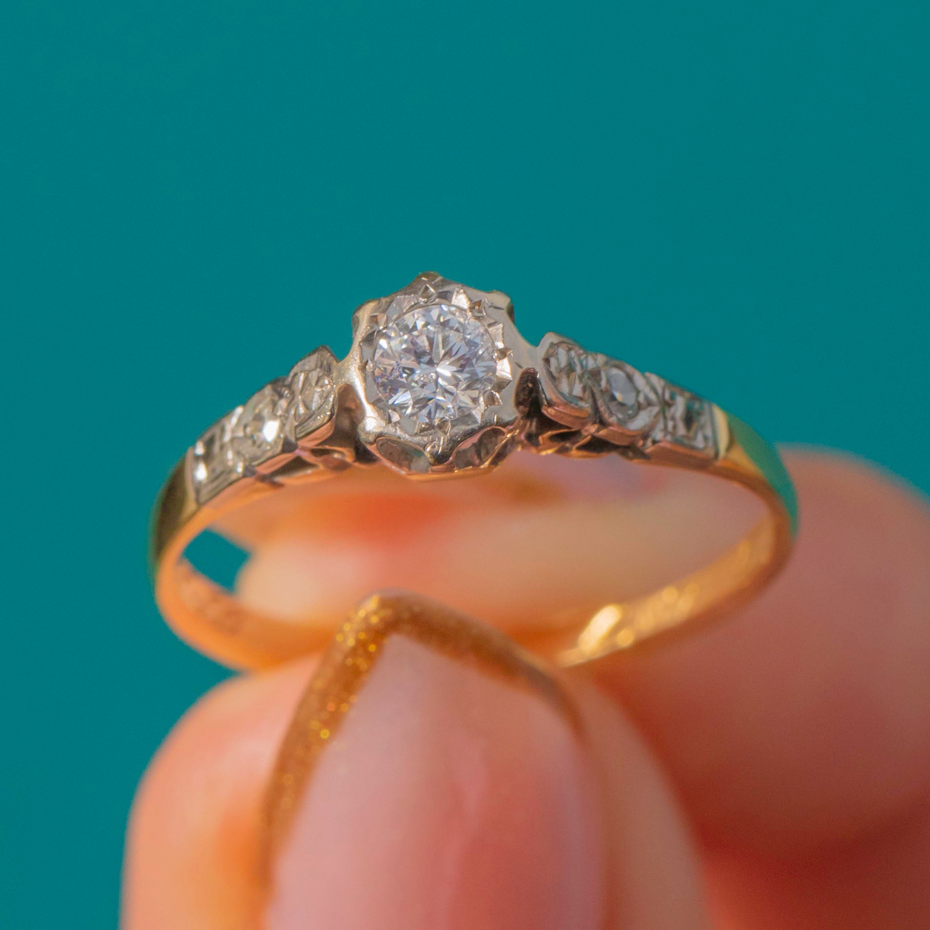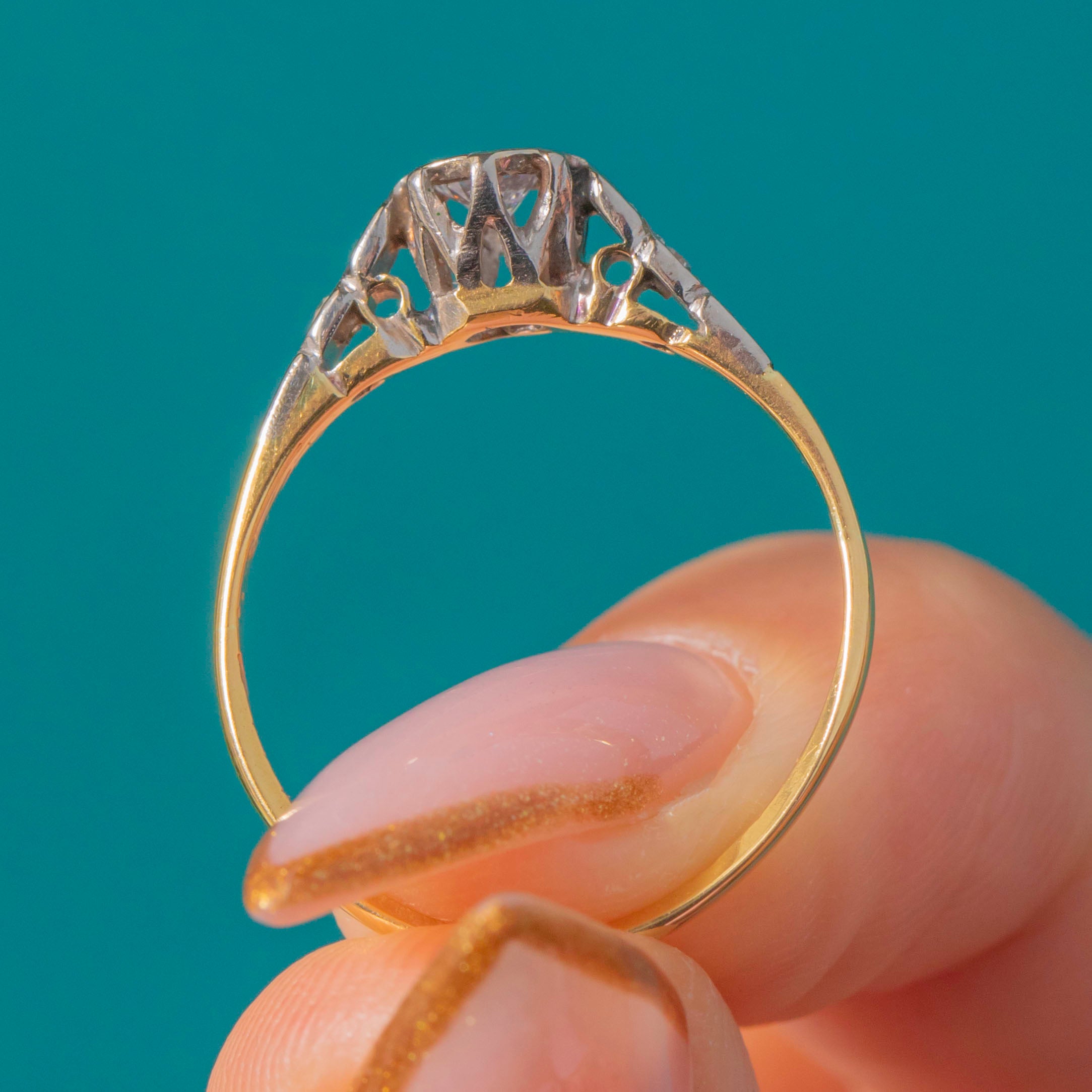 This beautiful vintage 18ct Gold Diamond ring blends timeless elegance with subtle sparkle. A bright 0.10ct central Diamond in a starry-style setting catches the light effortlessly, flanked by glamorous Diamond accents on each shoulder for an added touch of brilliance. The Diamonds are set in a refined white Gold crown, contrasting perfectly against the warm 18ct Yellow Gold band.