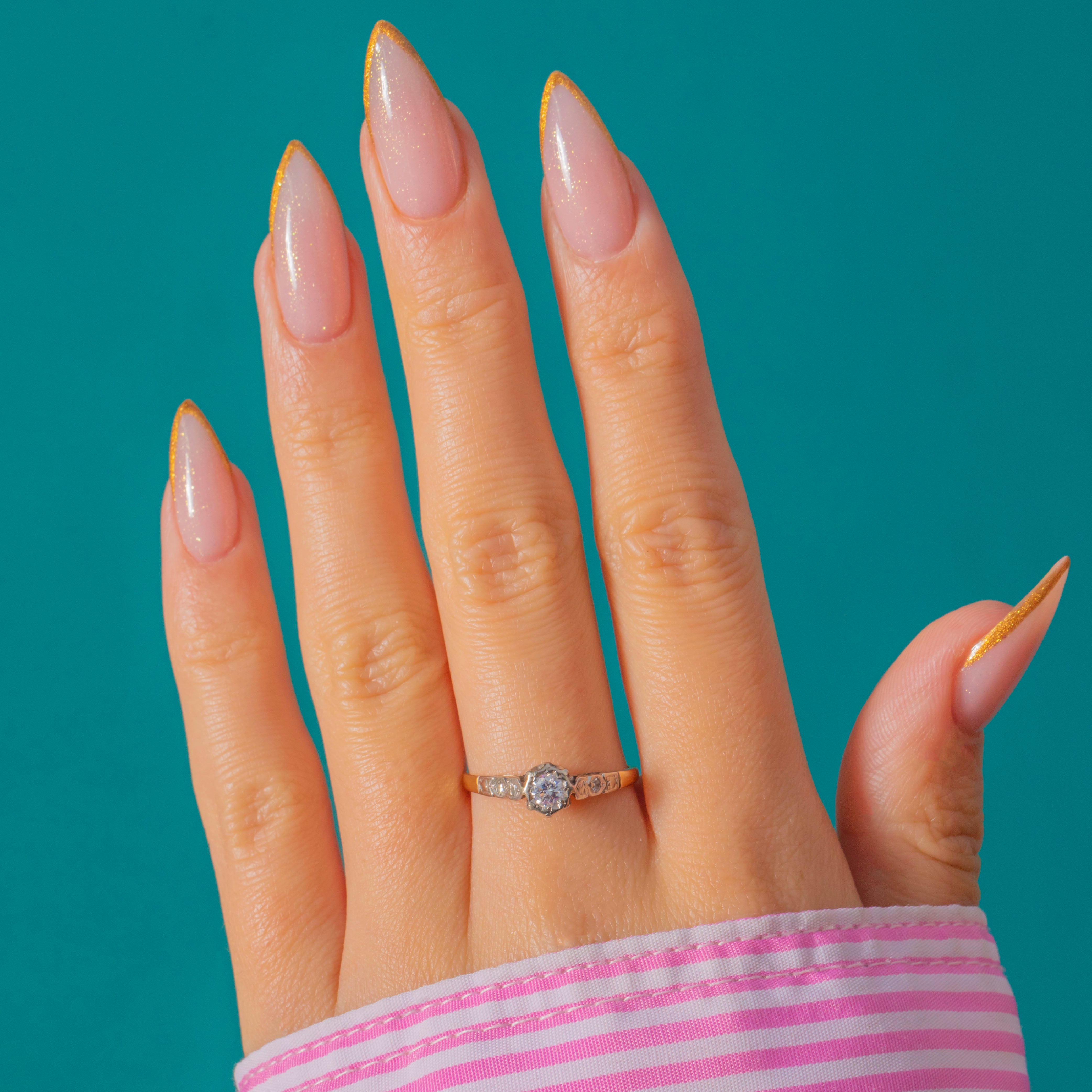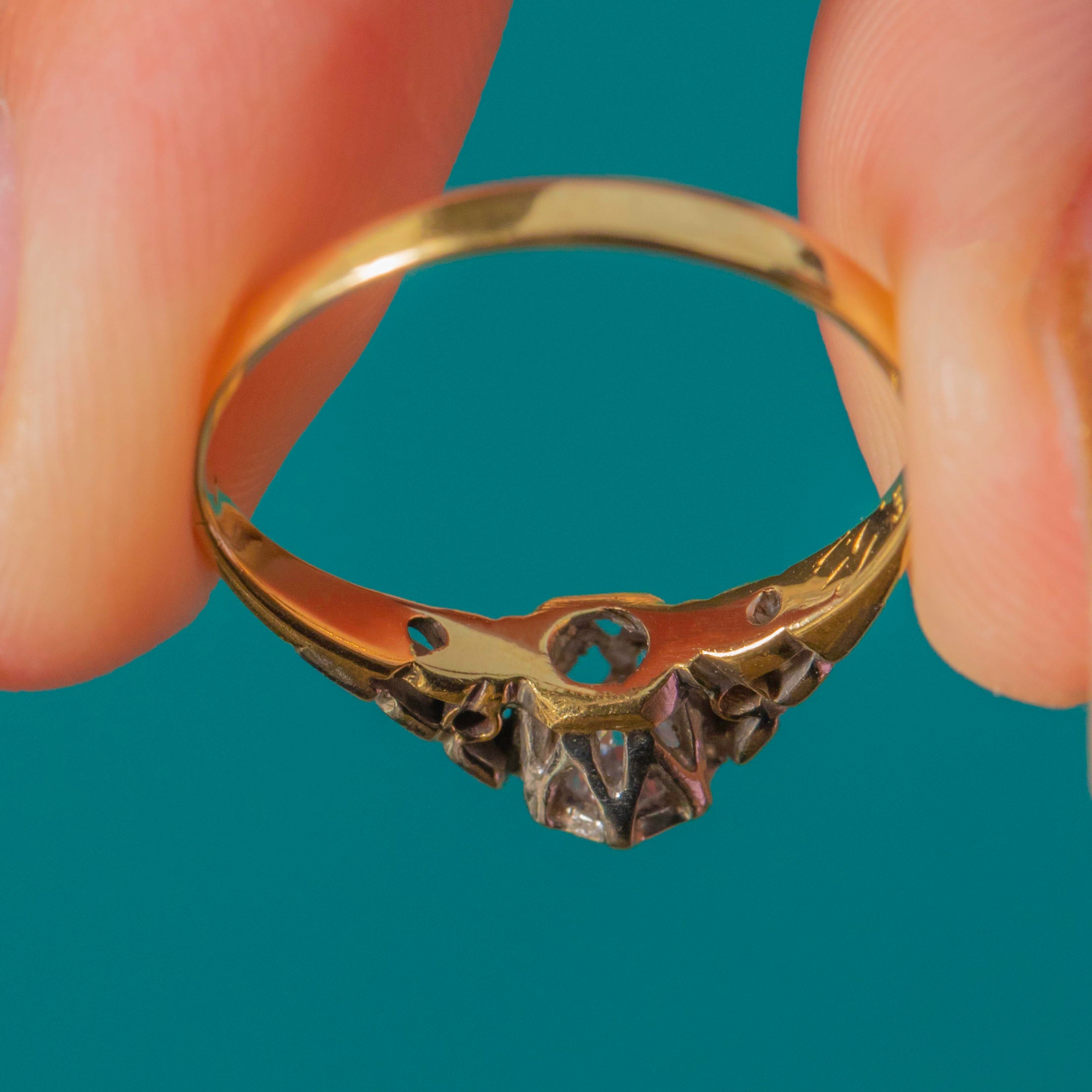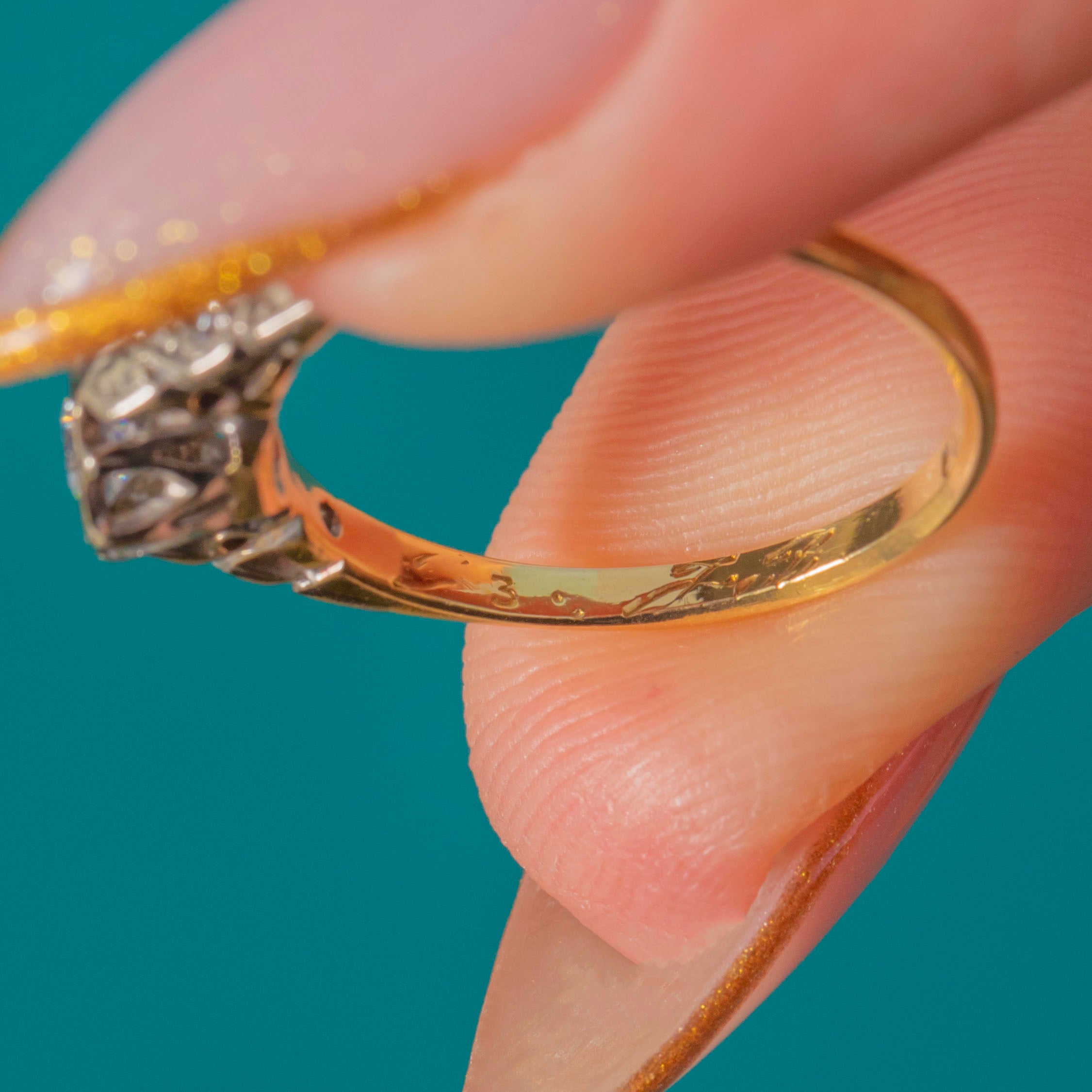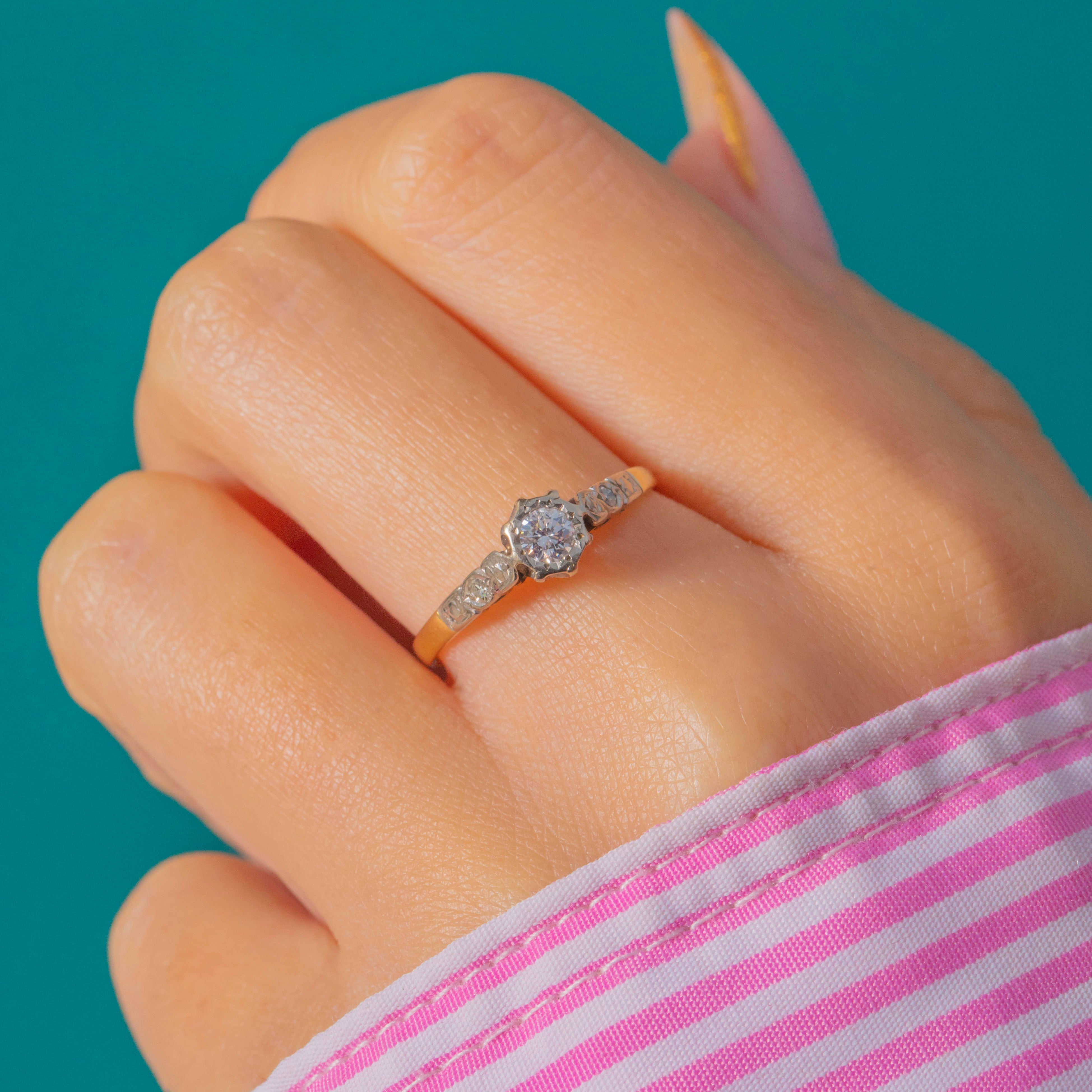 This beautiful vintage 18ct Gold Diamond ring blends timeless elegance with subtle sparkle. A bright 0.10ct central Diamond in a starry-style setting catches the light effortlessly, flanked by glamorous Diamond accents on each shoulder for an added touch of brilliance. The Diamonds are set in a refined white Gold crown, contrasting perfectly against the warm 18ct Yellow Gold band.