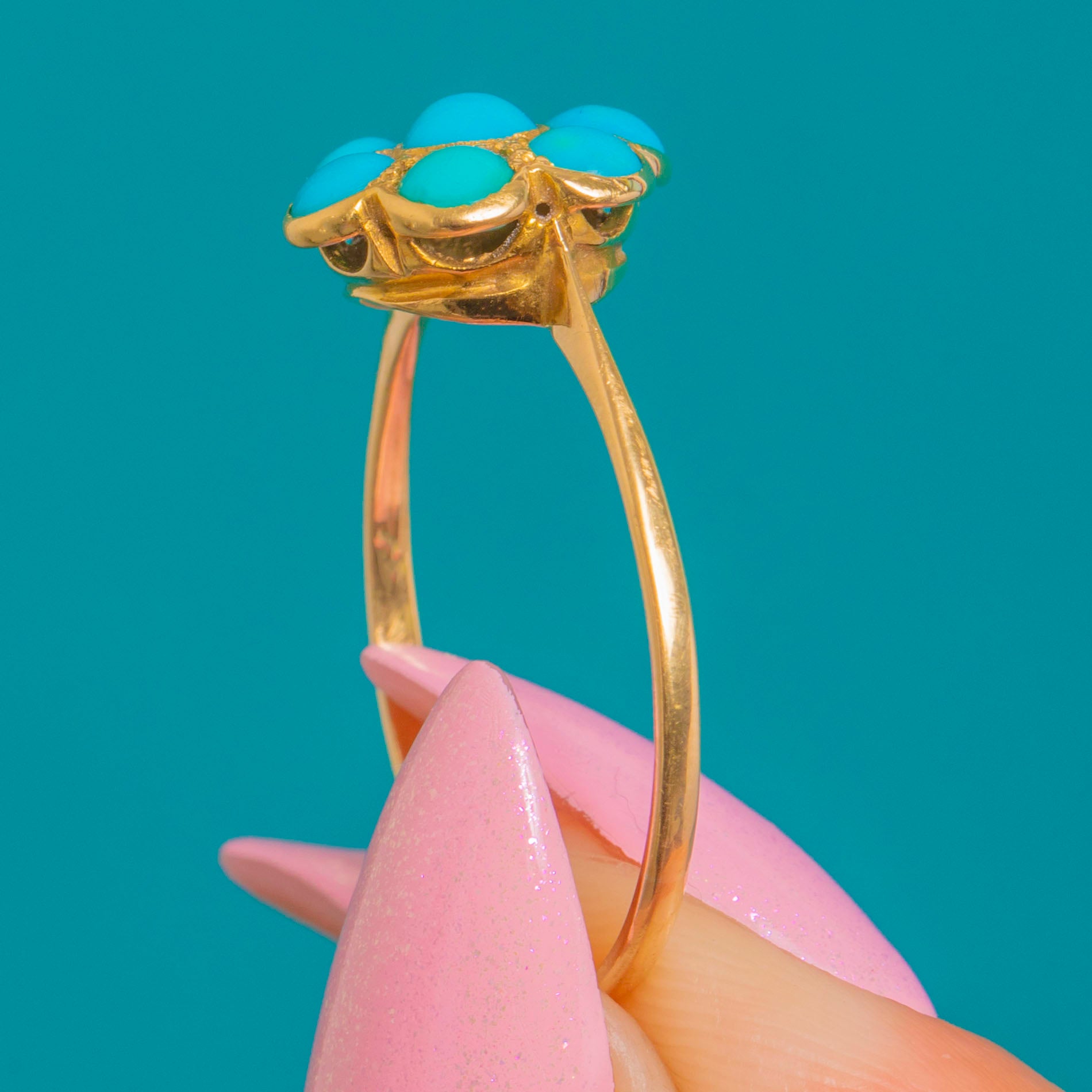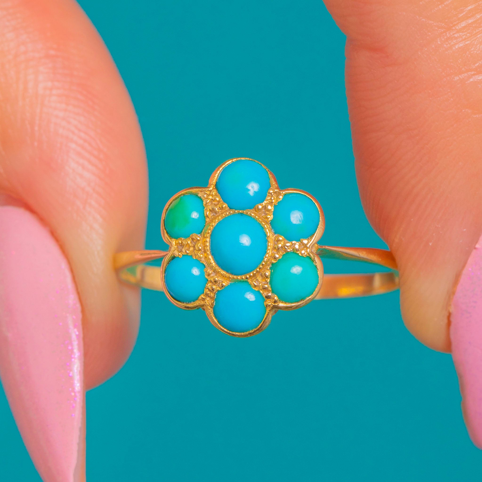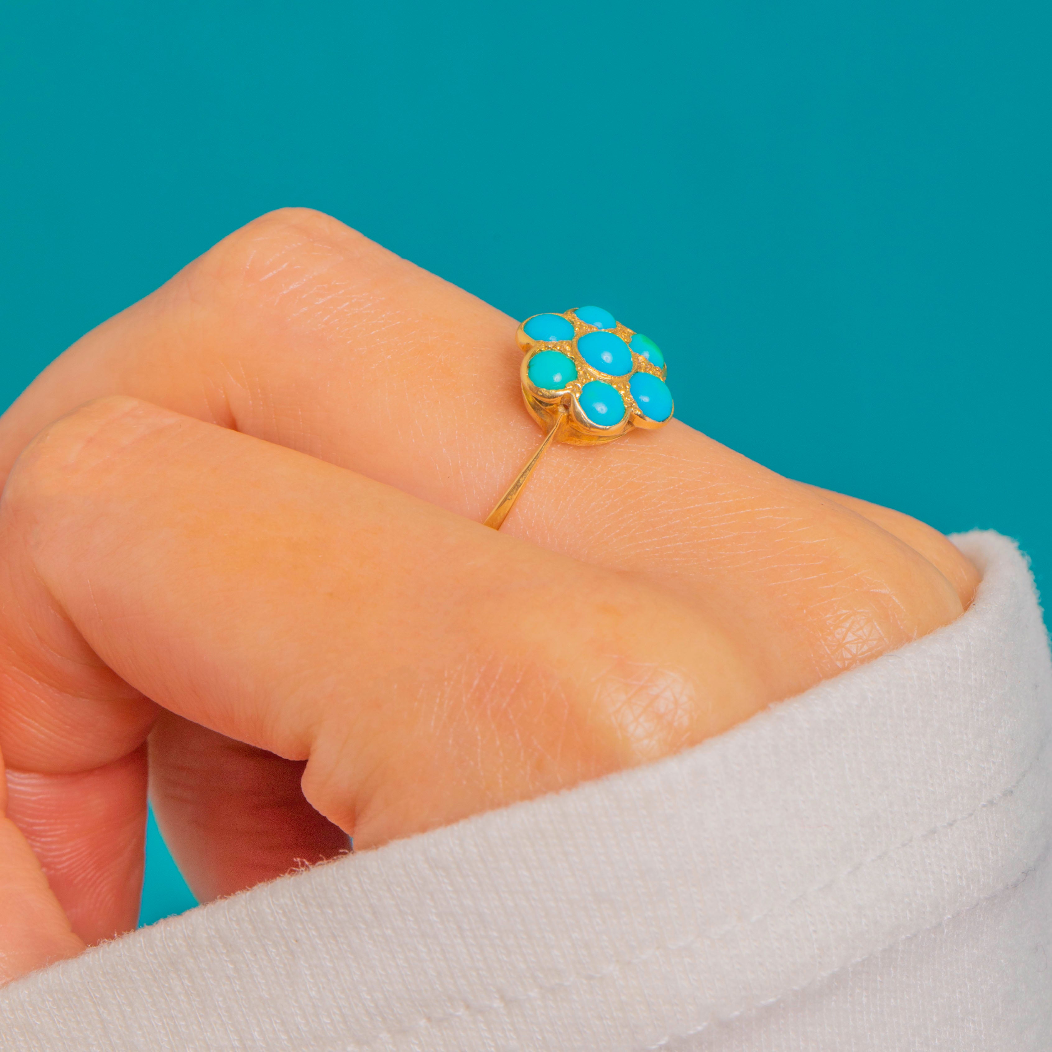 A dainty Victorian Turquoise flower cluster ring crafted in glowing 18ct Gold. Seven domed Turquoise cabochons form a sweet petalled bloom, their vivid blue-green tones beautifully framed by fine bezel settings. Subtle granulated accents between the stones and a scalloped under-gallery lend delicate, period-perfect detail.