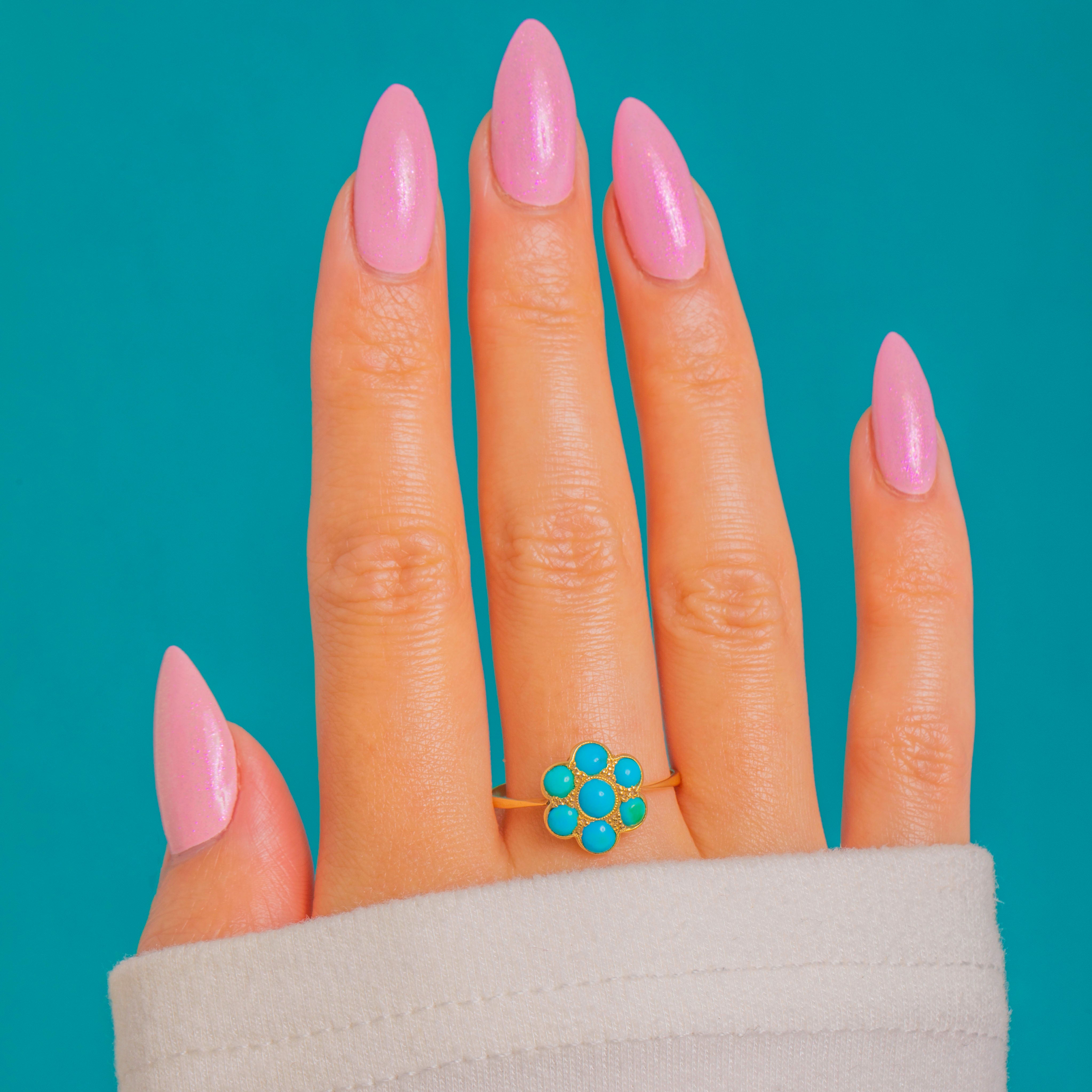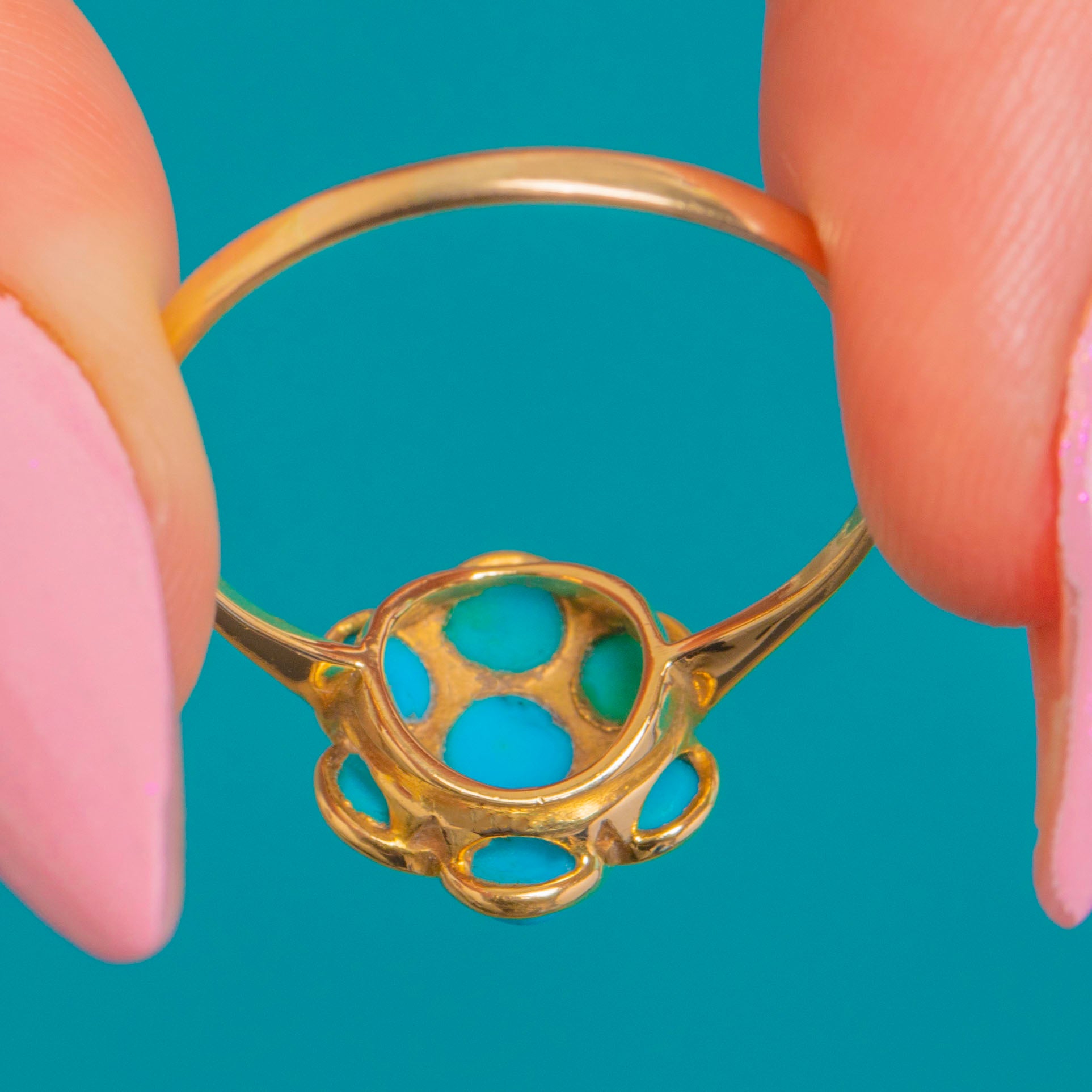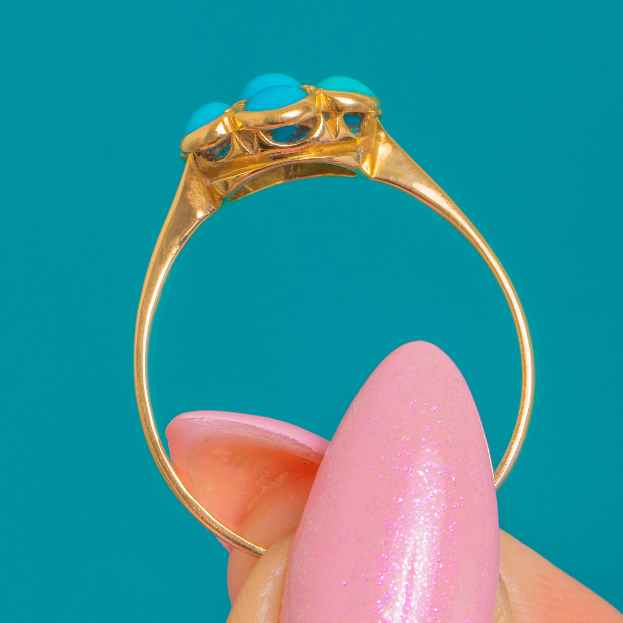 A dainty Victorian Turquoise flower cluster ring crafted in glowing 18ct Gold. Seven domed Turquoise cabochons form a sweet petalled bloom, their vivid blue-green tones beautifully framed by fine bezel settings. Subtle granulated accents between the stones and a scalloped under-gallery lend delicate, period-perfect detail.