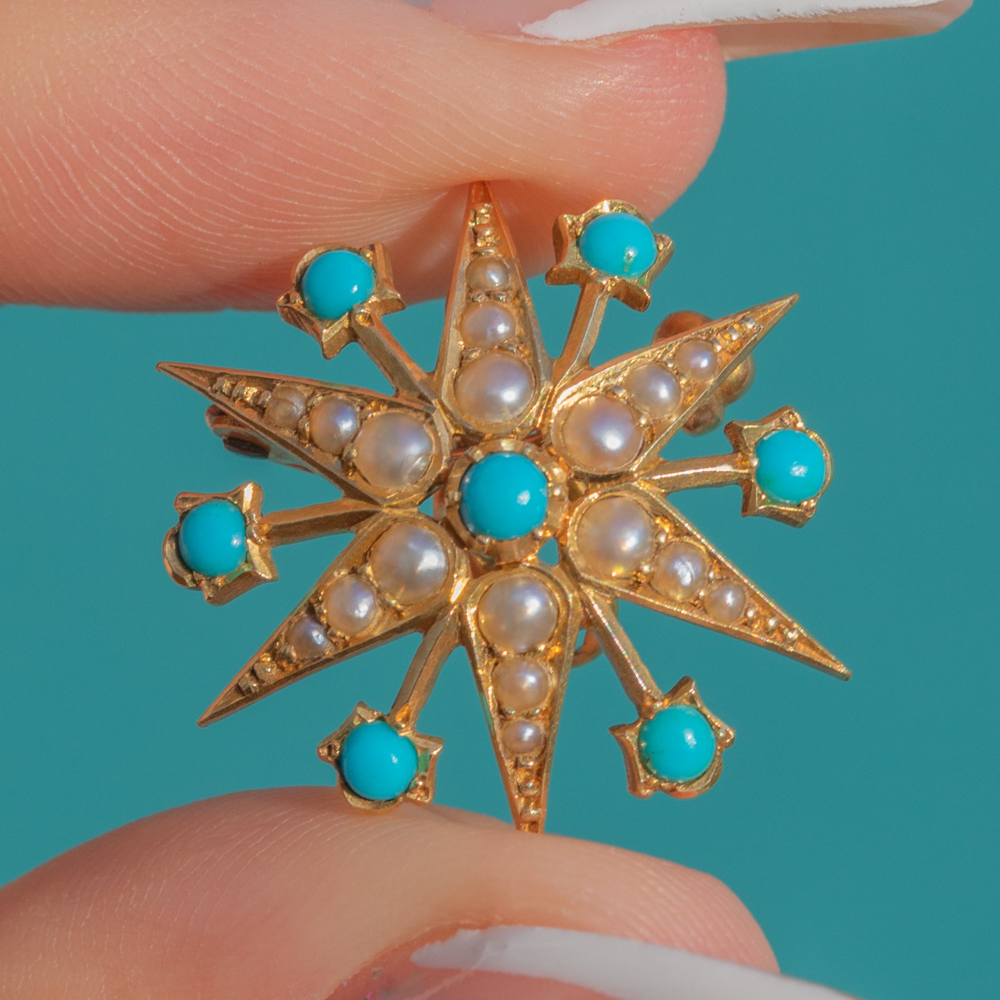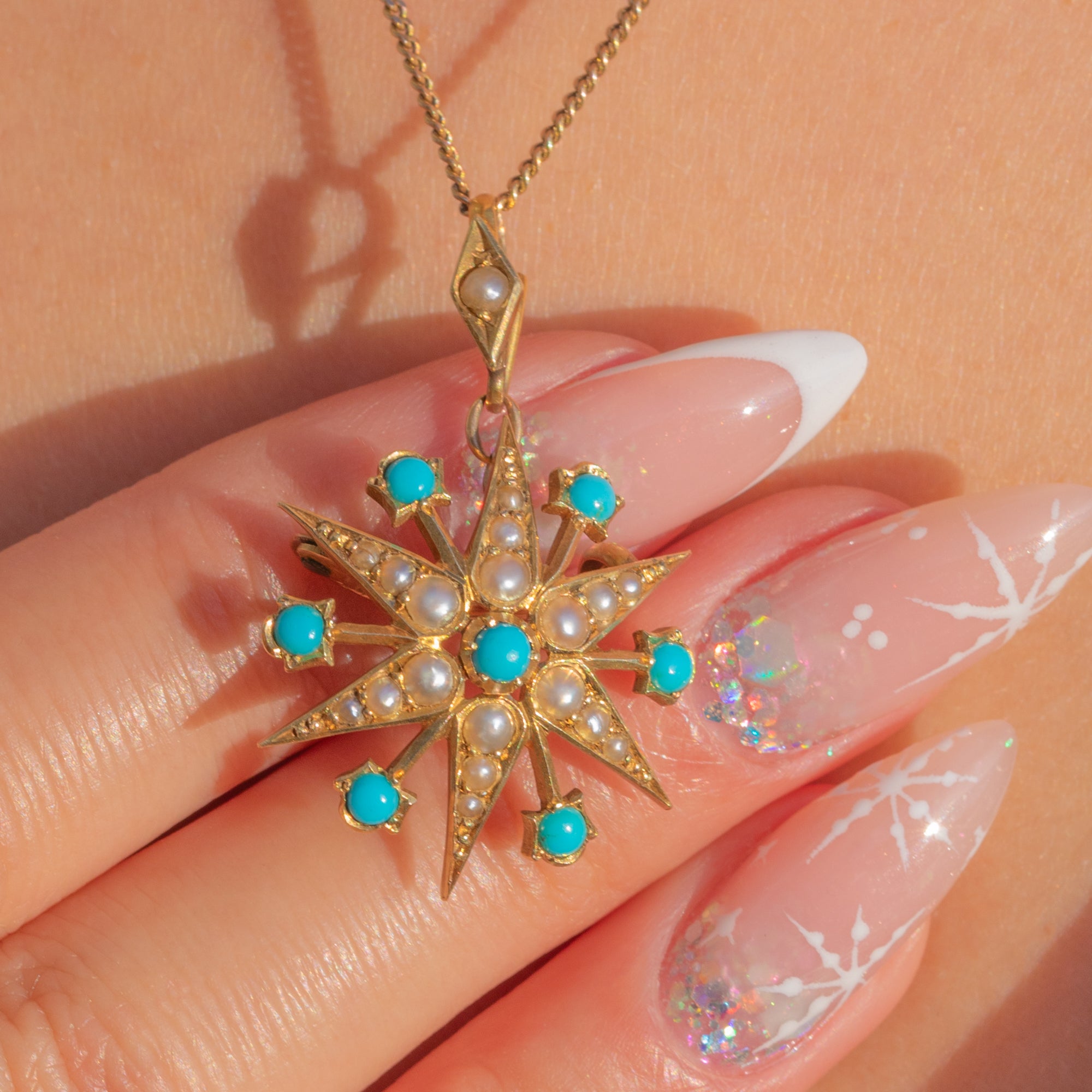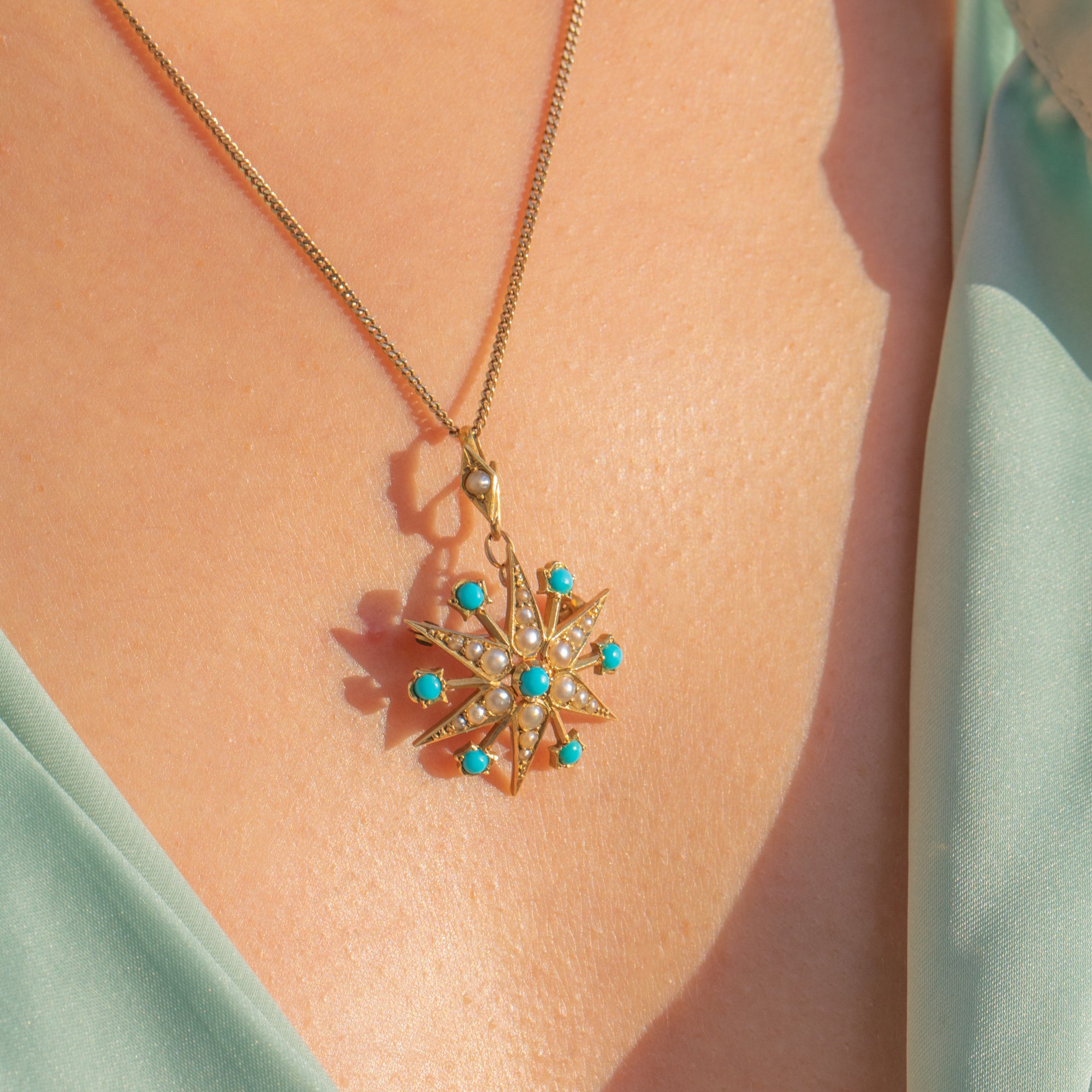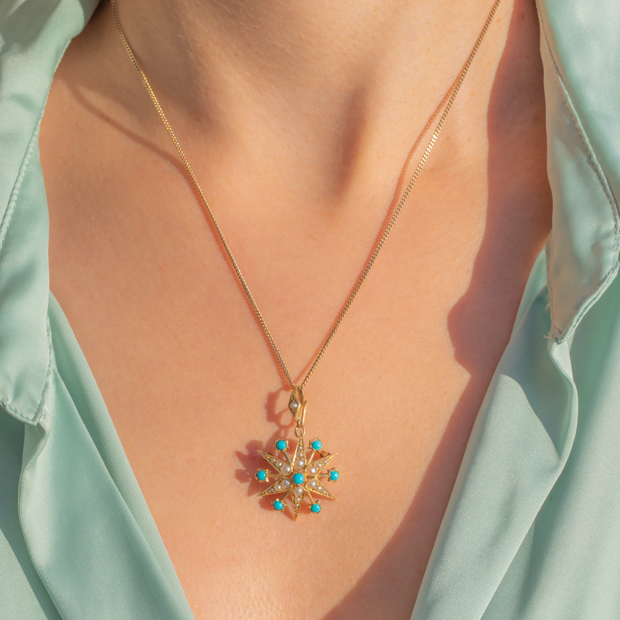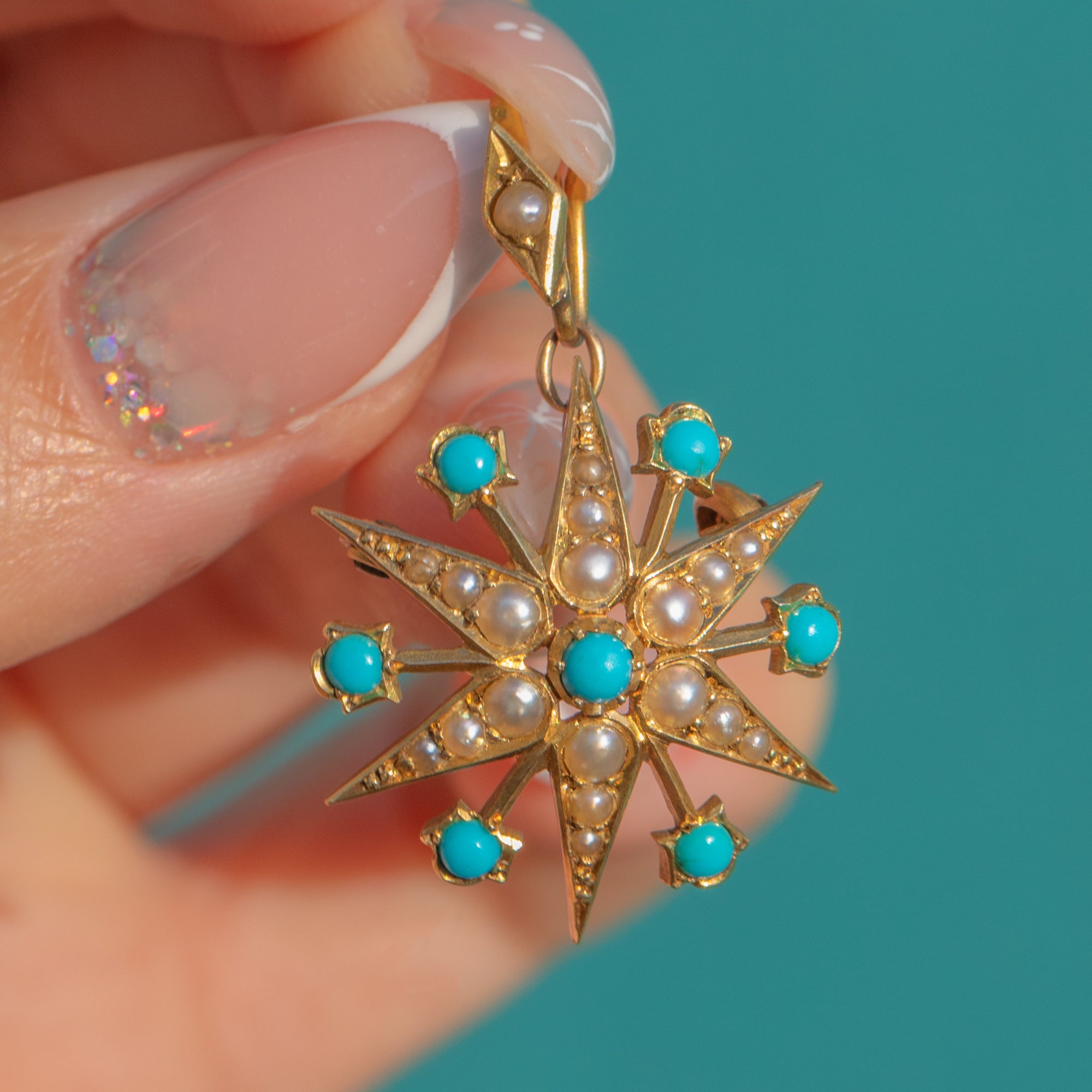 A gloriously vibrant Victorian starburst pendant set with bright Turquoise cabochons and shimmering natural Pearls. Crafted in rich 18ct Gold, the design combines crisp geometry with soft colour, creating a piece that feels both joyful and elegant on the skin.