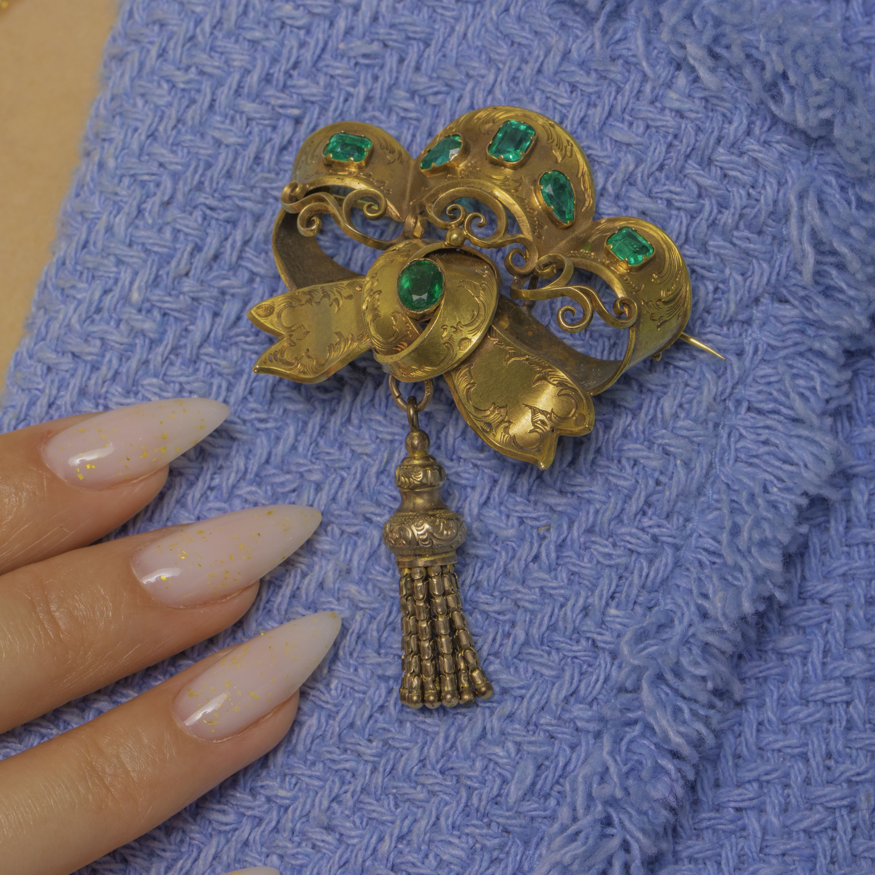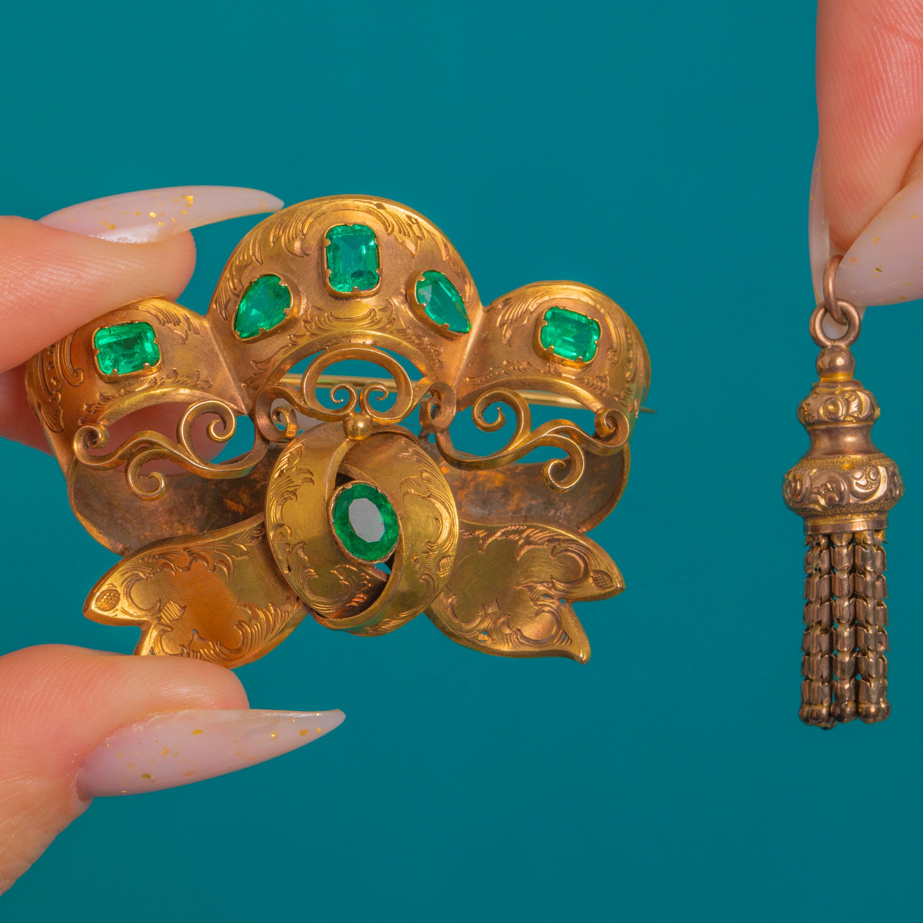Richly ornate and irresistibly romantic, this Victorian bow brooch unfurls in sumptuous 18ct Gold, chased with foliate scrolls and enlivened by vivid Emeralds. A parade of emerald-cut and pear-cut Emeralds glows across the sculptural bow, while an oval Emerald nestles below, leading the eye to an articulated tassel that sways with every movement. The domed ribbons, applied wire scrolls and engraved panels evoke the finest mid‑19th century craftsmanship, with a warm antique patina to match.