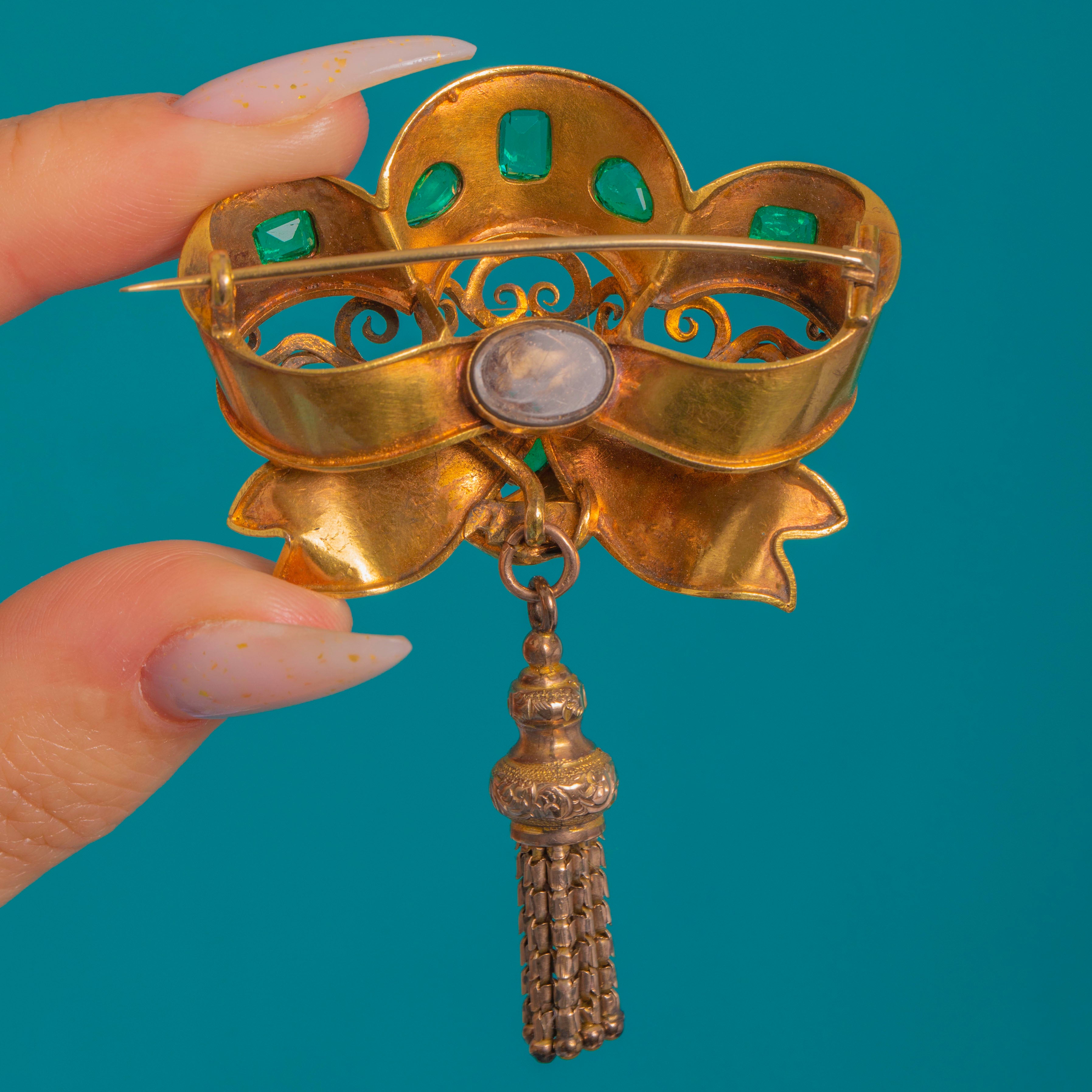 18ct Gold Victorian Emerald Bow Tassel Brooch, c.1860