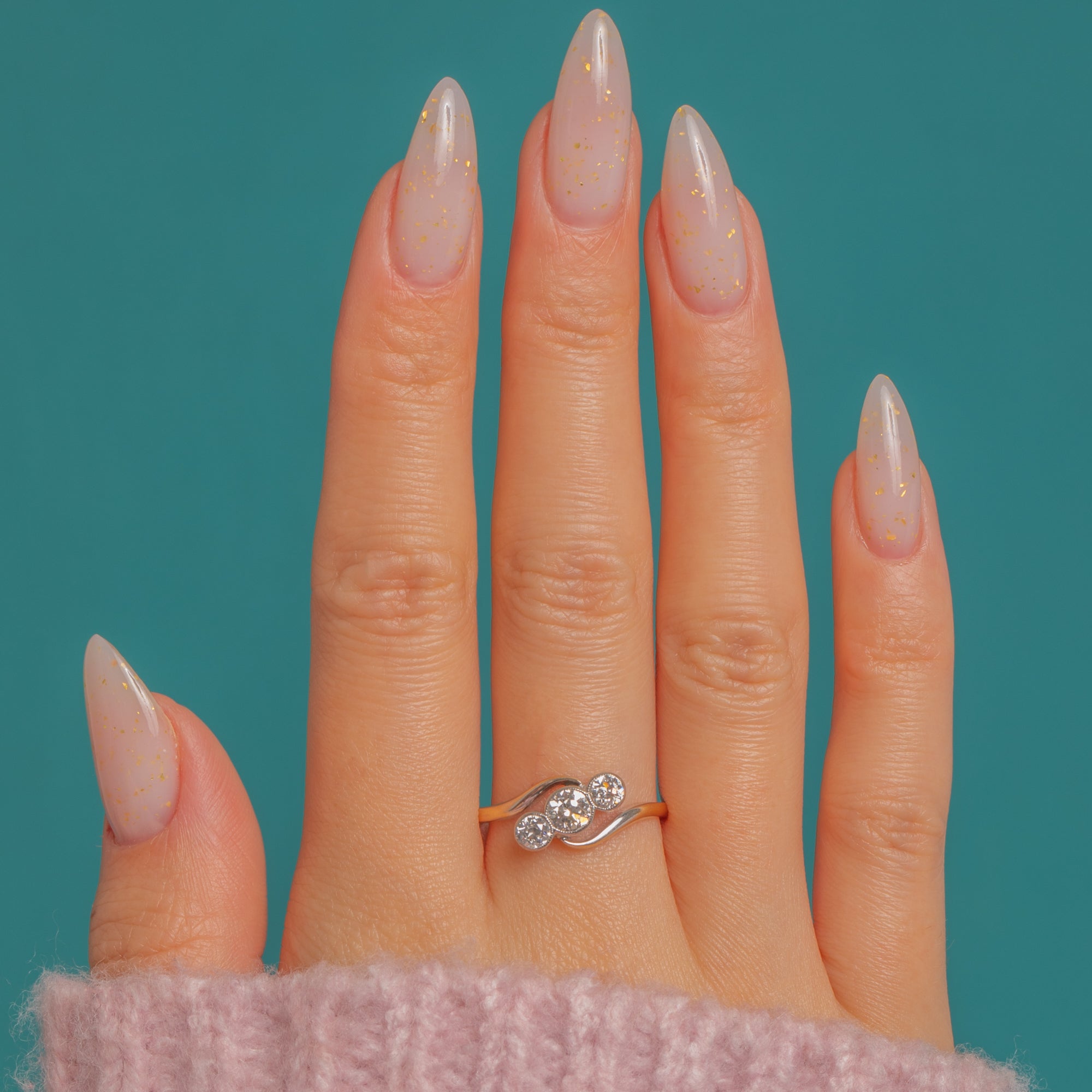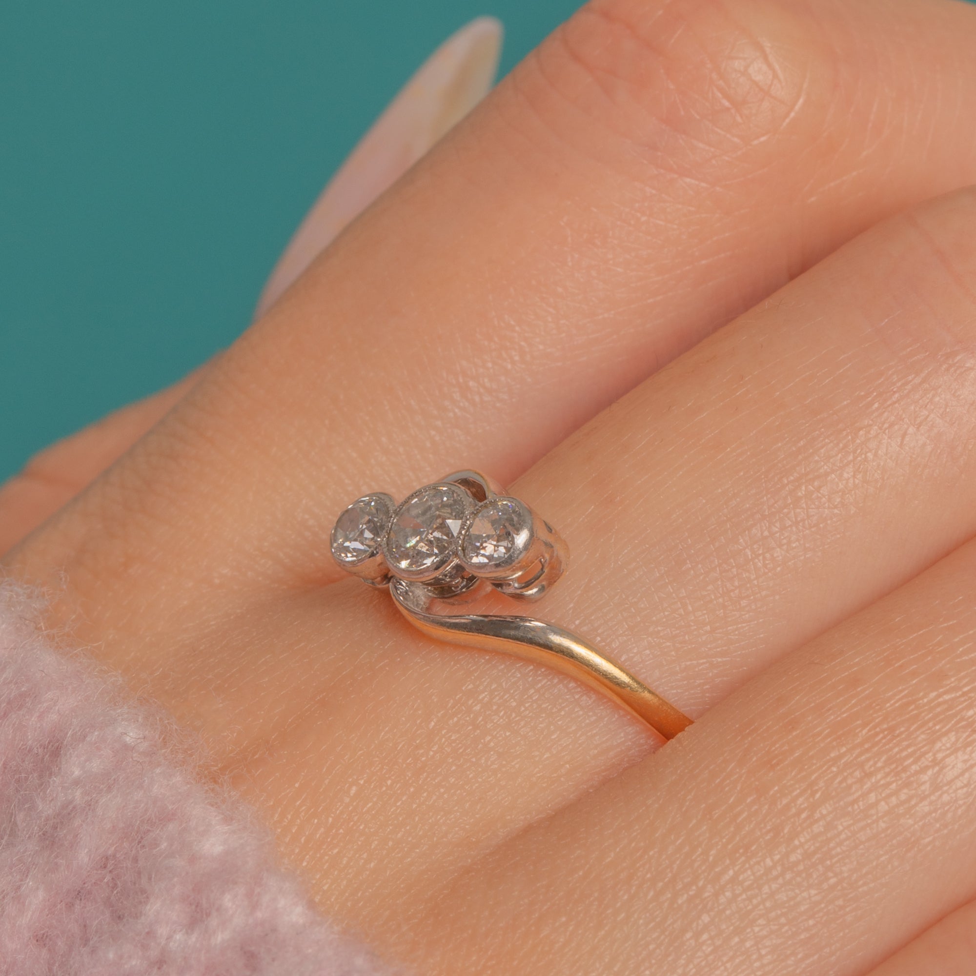 A refined Art Deco Diamond trilogy crossover ring, crafted in two-tone 18ct Gold with Platinum settings. Three bright Diamonds glide in a gentle S-curve across the finger, each secured in fine milgrained rubover collets with open backs and a beautifully pierced under-gallery. With a low, graceful profile and flowing crossover shoulders, it’s an elegant study in balance and light, offering approximately 0.45cts of scintillation.