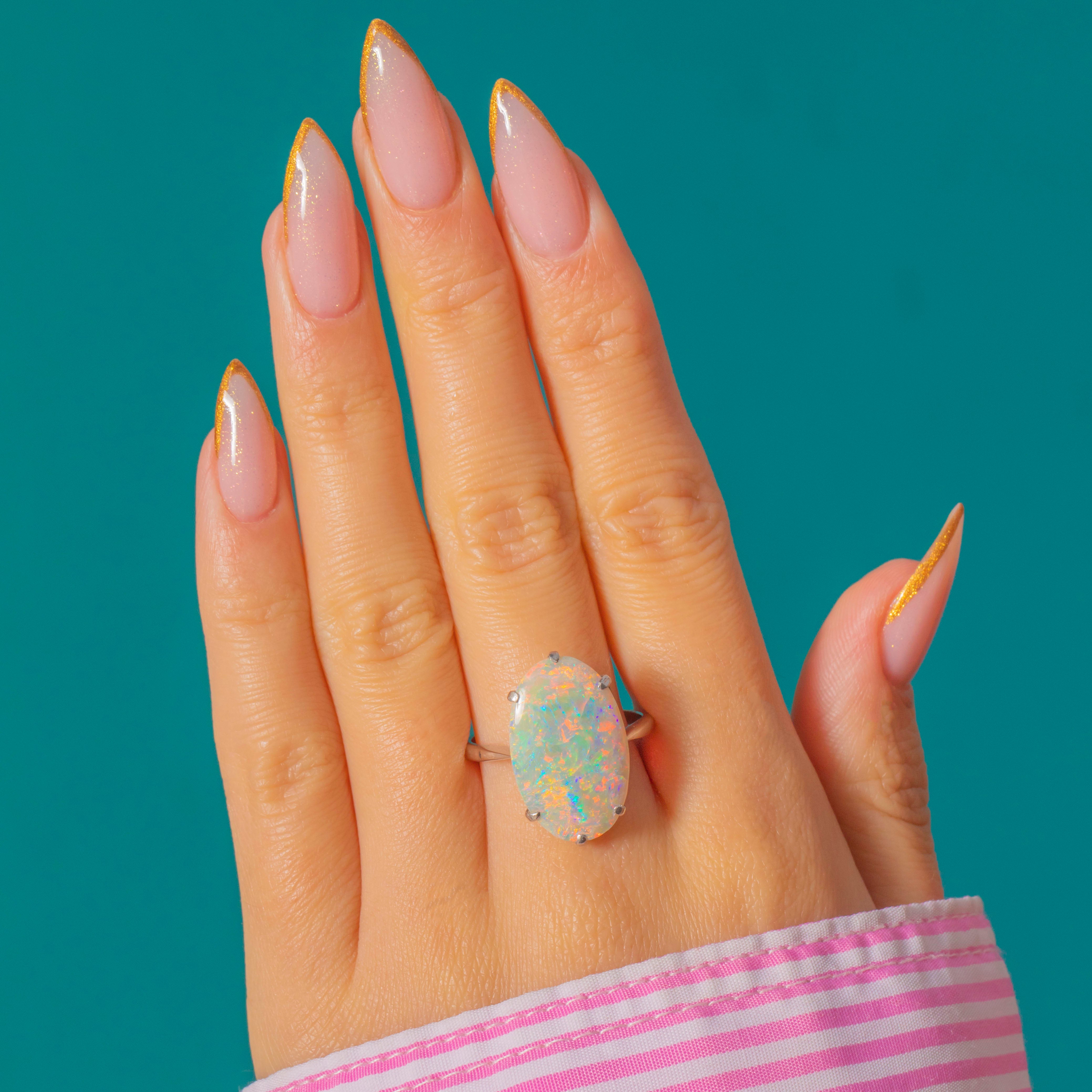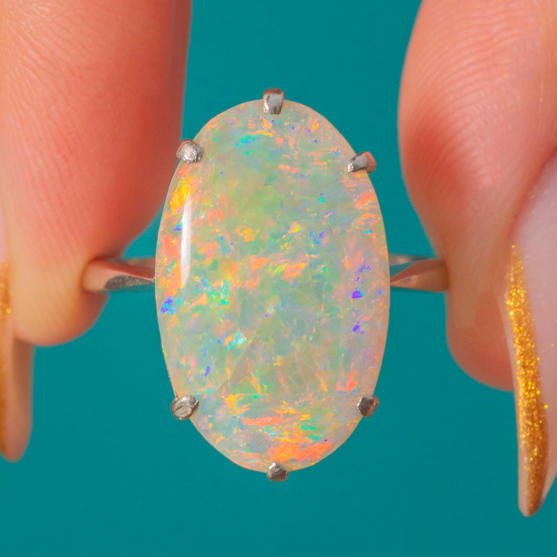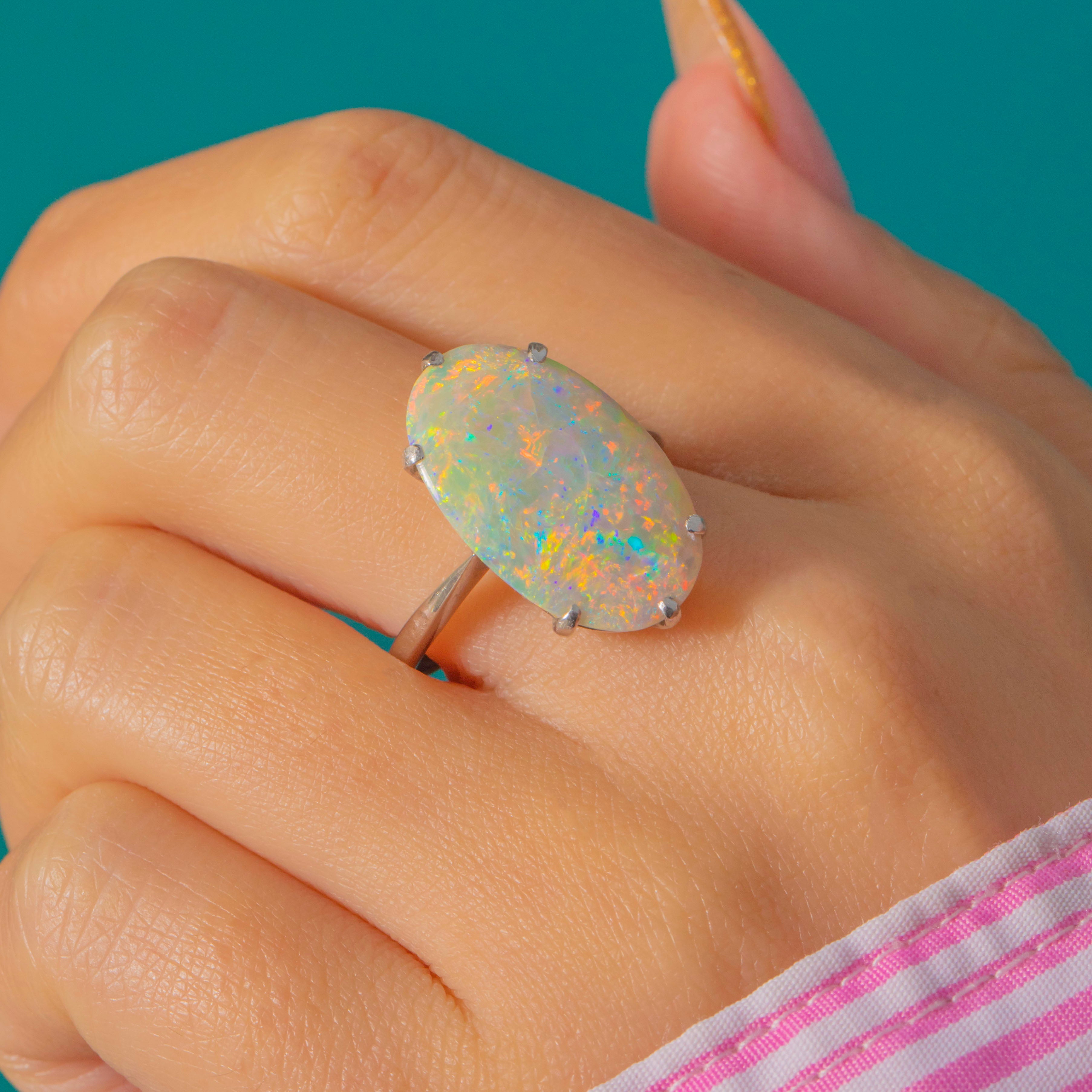This vintage Opal solitaire is pure magic. The large 3.80ct oval cabochon flashes with lively confetti-like colours—greens, oranges, pinks and electric blues—captured in a classic six-claw setting. The platinum setting and simple tapered shoulders let the gem take centre stage, making a luminous statement on the hand.