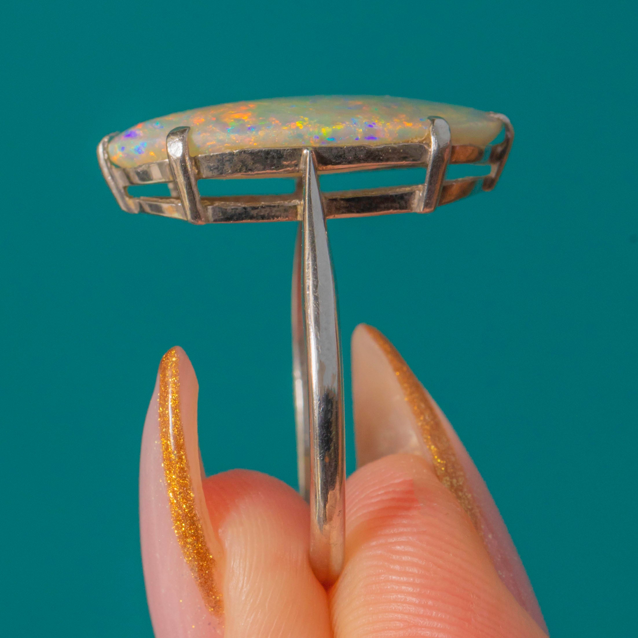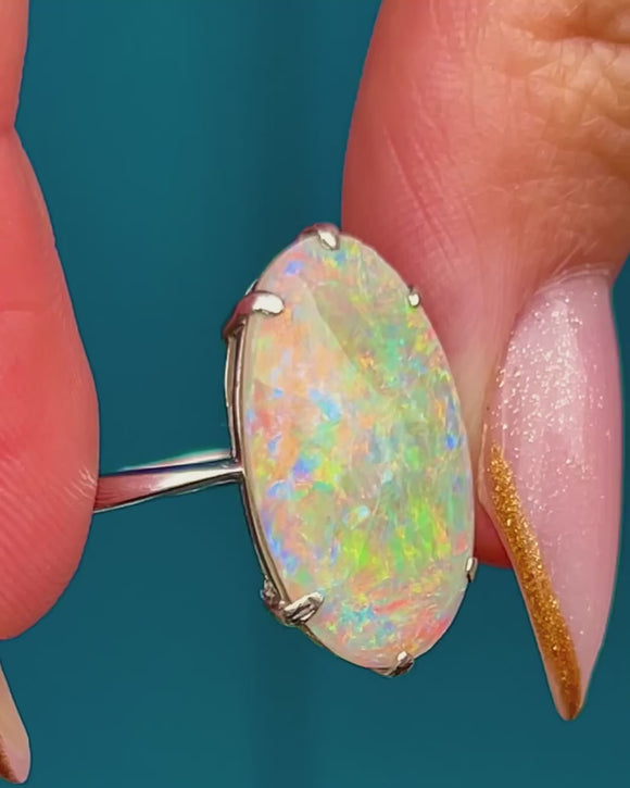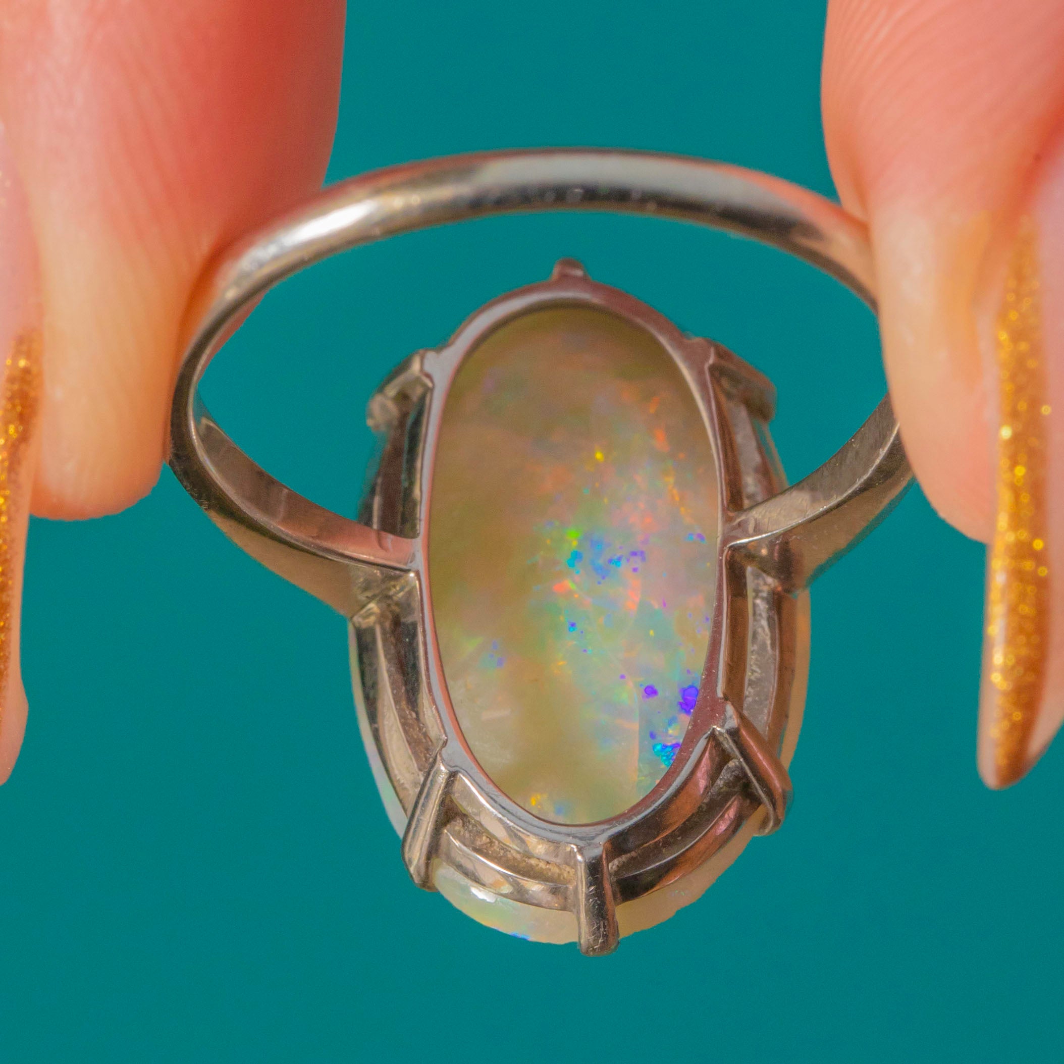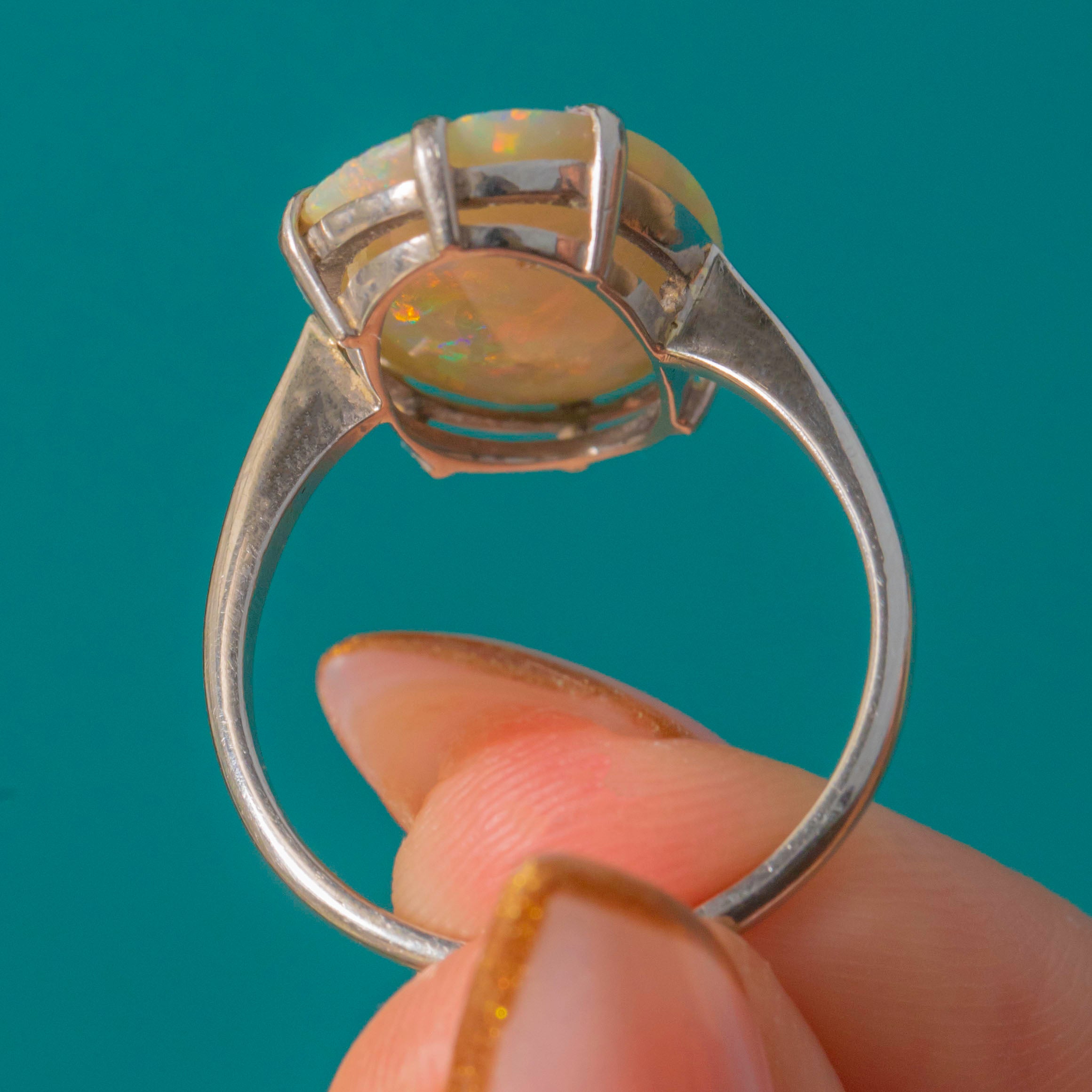 EXCELLENT: The Opal is bright with strong play-of-colour and no chips visible. The six-claw white Gold setting is secure with a smooth, well-shaped shank showing only light wear consistent with gentle use.