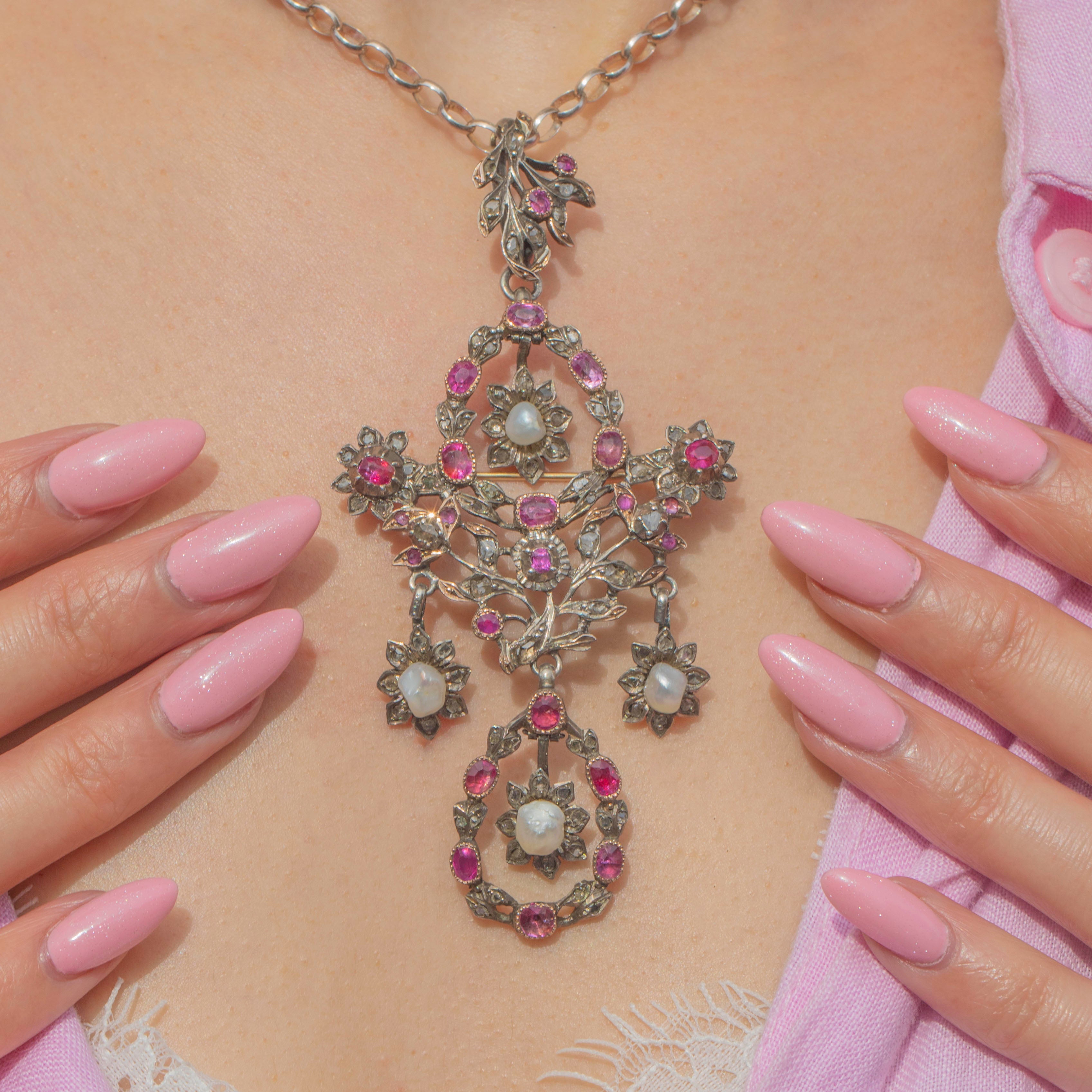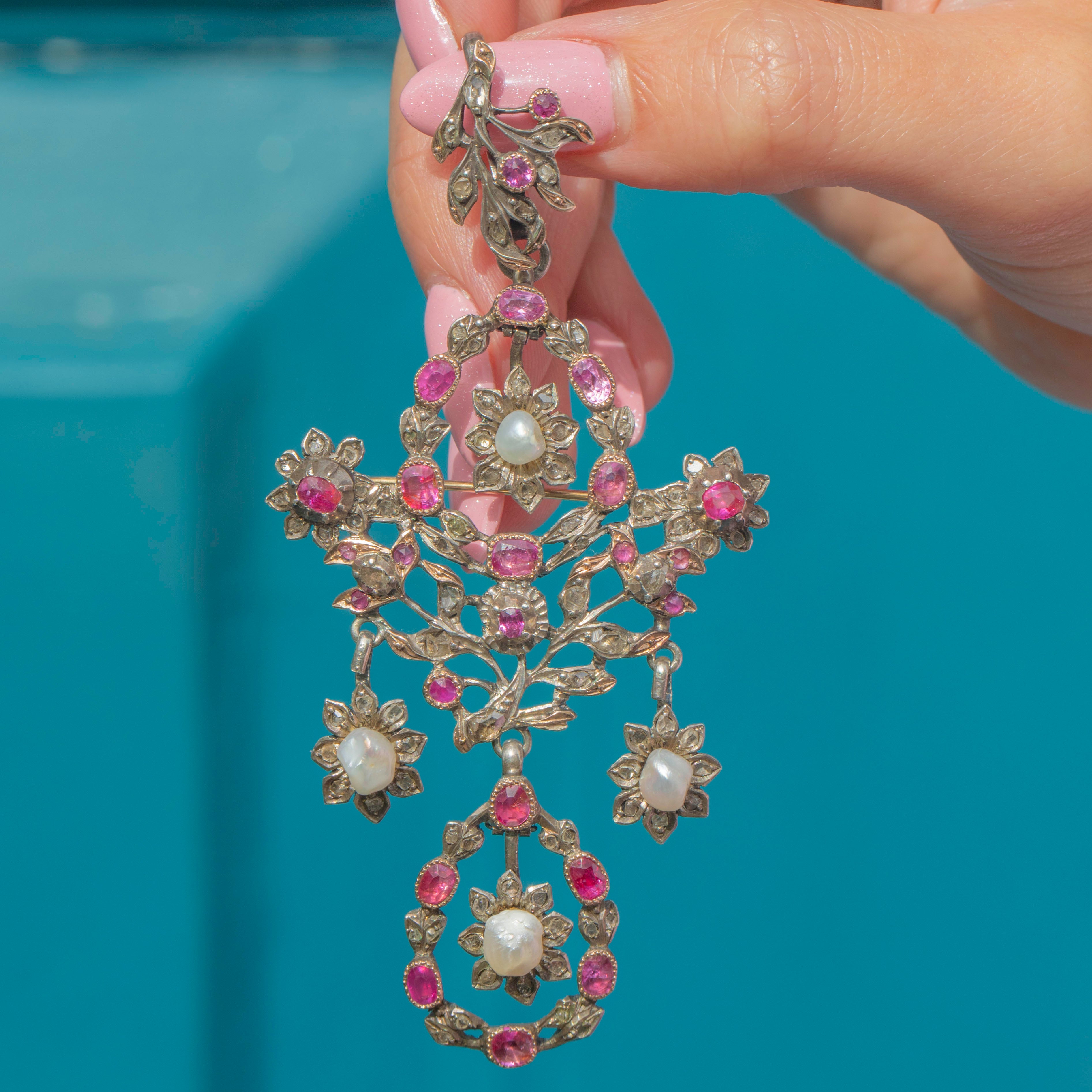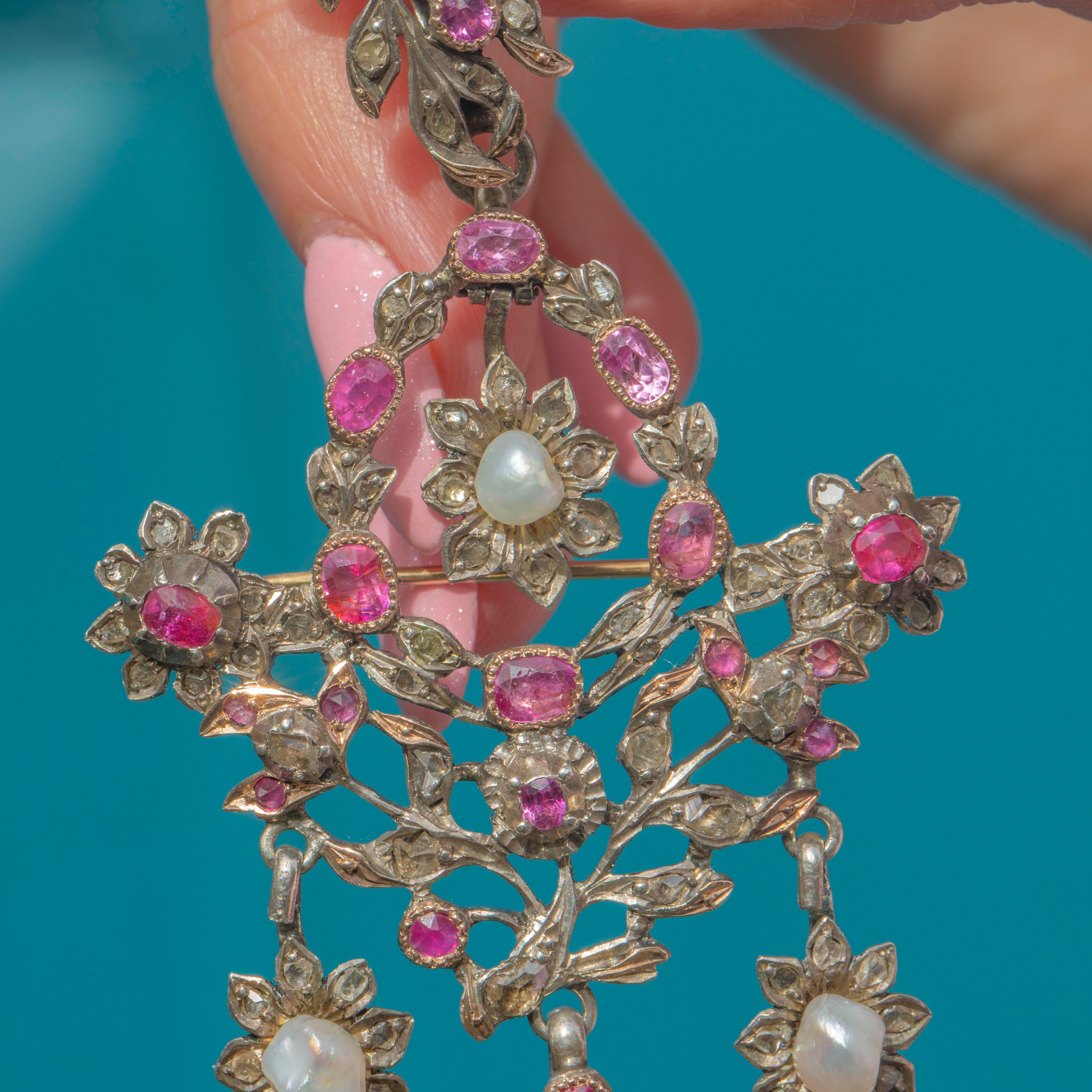 EXCELLENT. This 18th century Georgian Iberian Ruby Diamond Pearl pendant is in excellent condition. Given the age of this piece, it's in remarkable condition. The pendant has beautiful subtly pink-toned Rubies, as well as rose-cut Diamonds and Baroque Pearls. The only wear to note is to the back of the piece, where the Silver has worn down throughout its more than 250 year lifespan, exposing the backs of some of the Rubies, but they remain secure. The brooch fitting works perfectly and the bottom drop and detachable pendant function work beautifully together to give you the utmost versatility in wear.