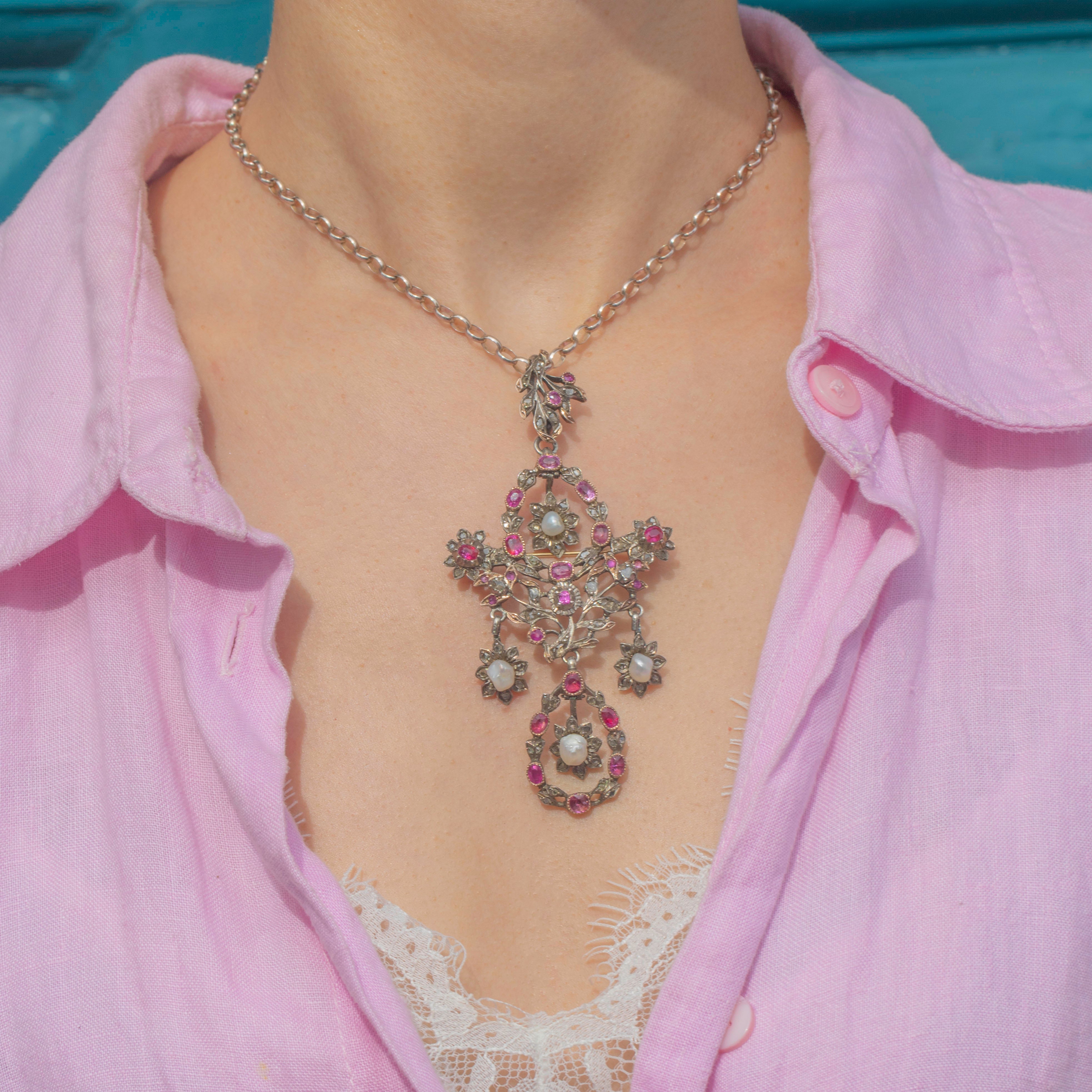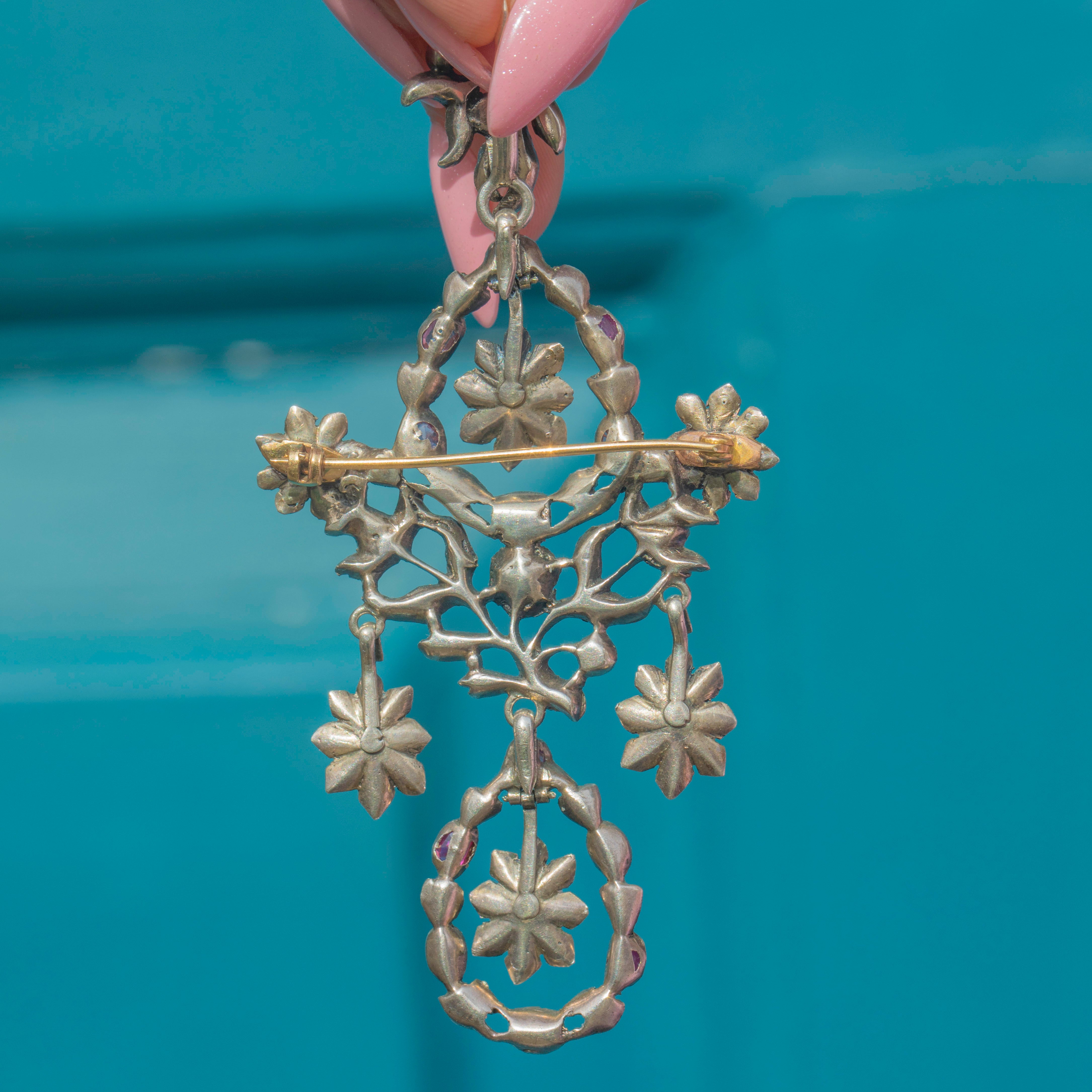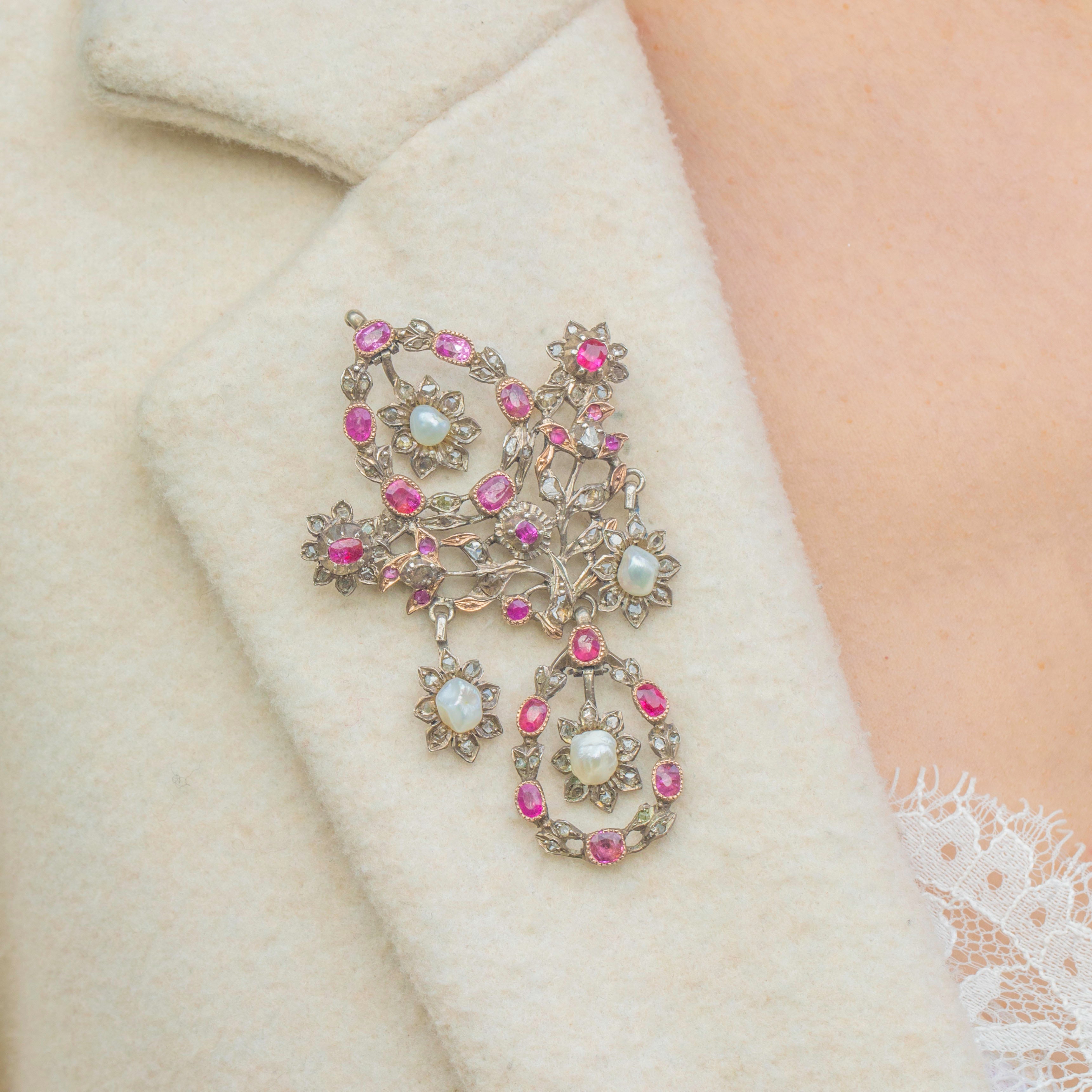 EXCELLENT. This 18th century Georgian Iberian Ruby Diamond Pearl pendant is in excellent condition. Given the age of this piece, it's in remarkable condition. The pendant has beautiful subtly pink-toned Rubies, as well as rose-cut Diamonds and Baroque Pearls. The only wear to note is to the back of the piece, where the Silver has worn down throughout its more than 250 year lifespan, exposing the backs of some of the Rubies, but they remain secure. The brooch fitting works perfectly and the bottom drop and detachable pendant function work beautifully together to give you the utmost versatility in wear.