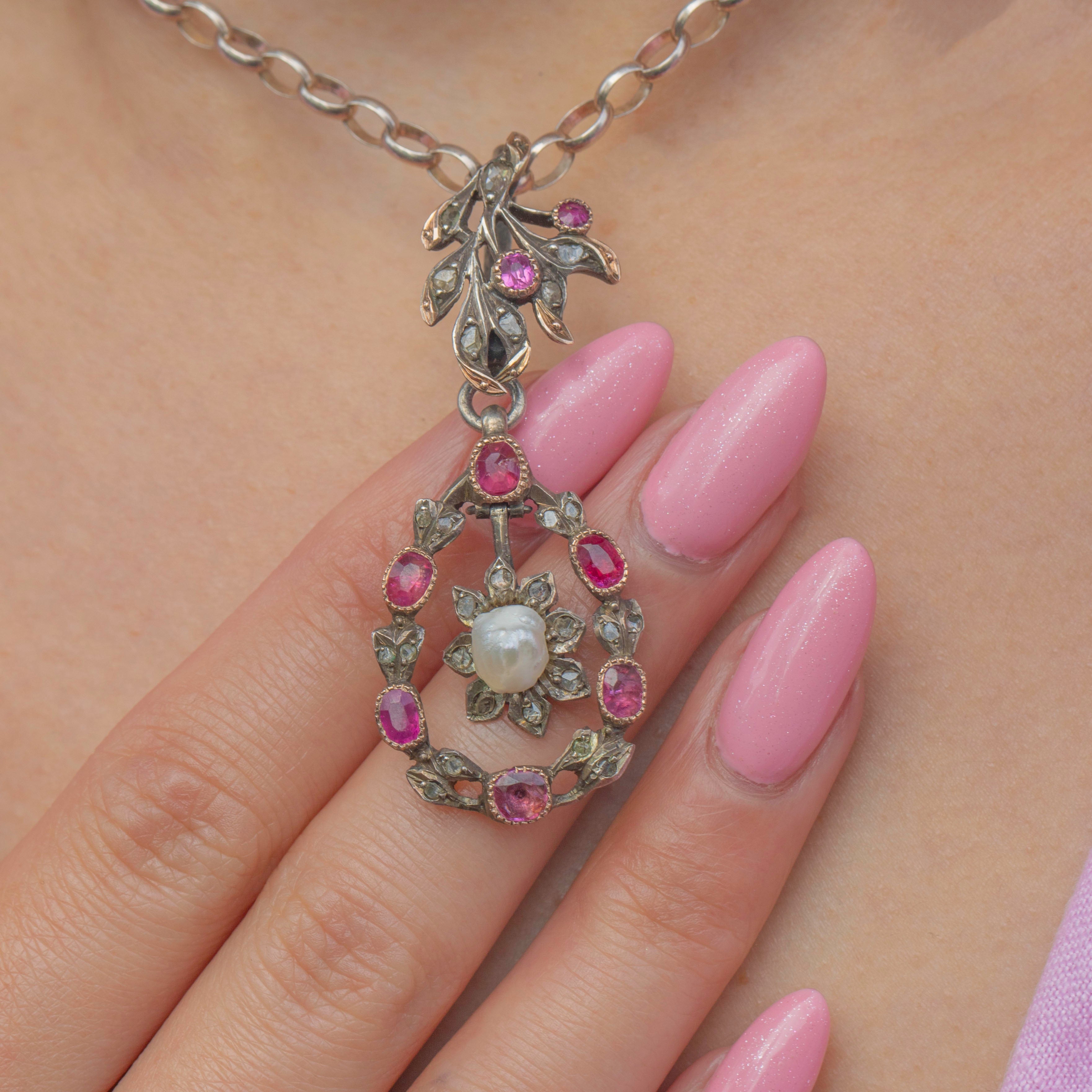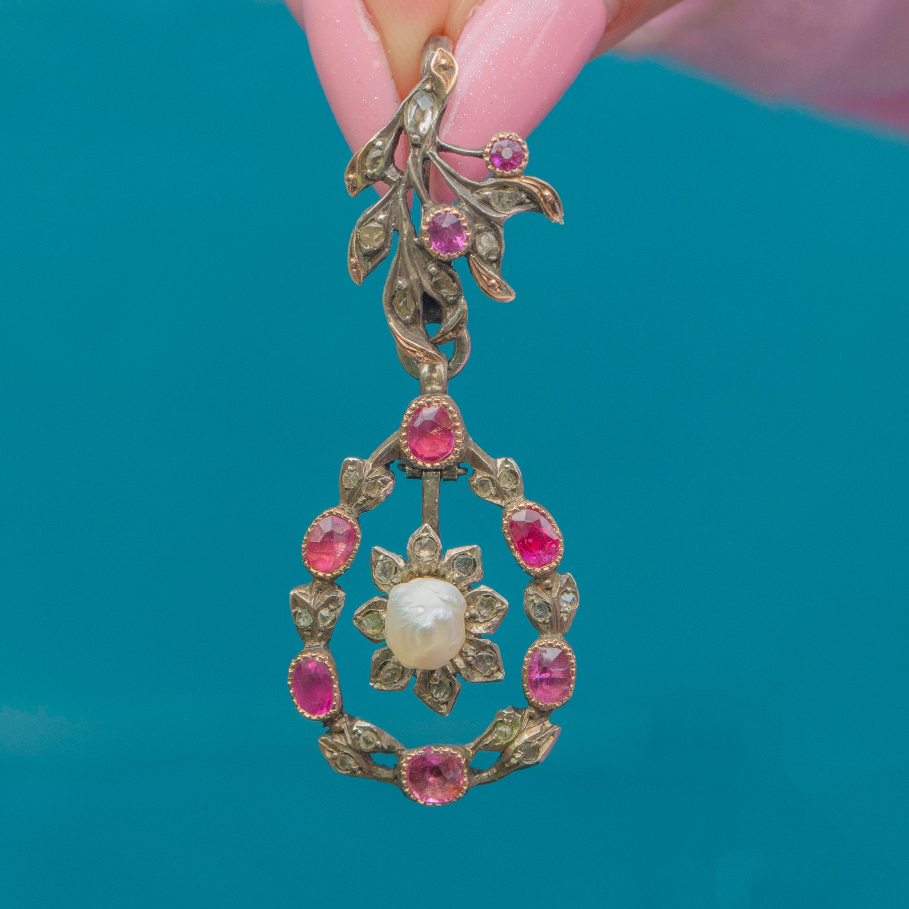 Fall in love with the alluring history of this 18th-century Georgian Iberian Ruby Diamond Pearl pendant! This exquisite piece was crafted during the latter half of the 18th century, circa 1750-1780, and has been inlaid with 4.95cts of natural fuchsia Rubies, rose-cut Diamonds, and Baroque Pearls.