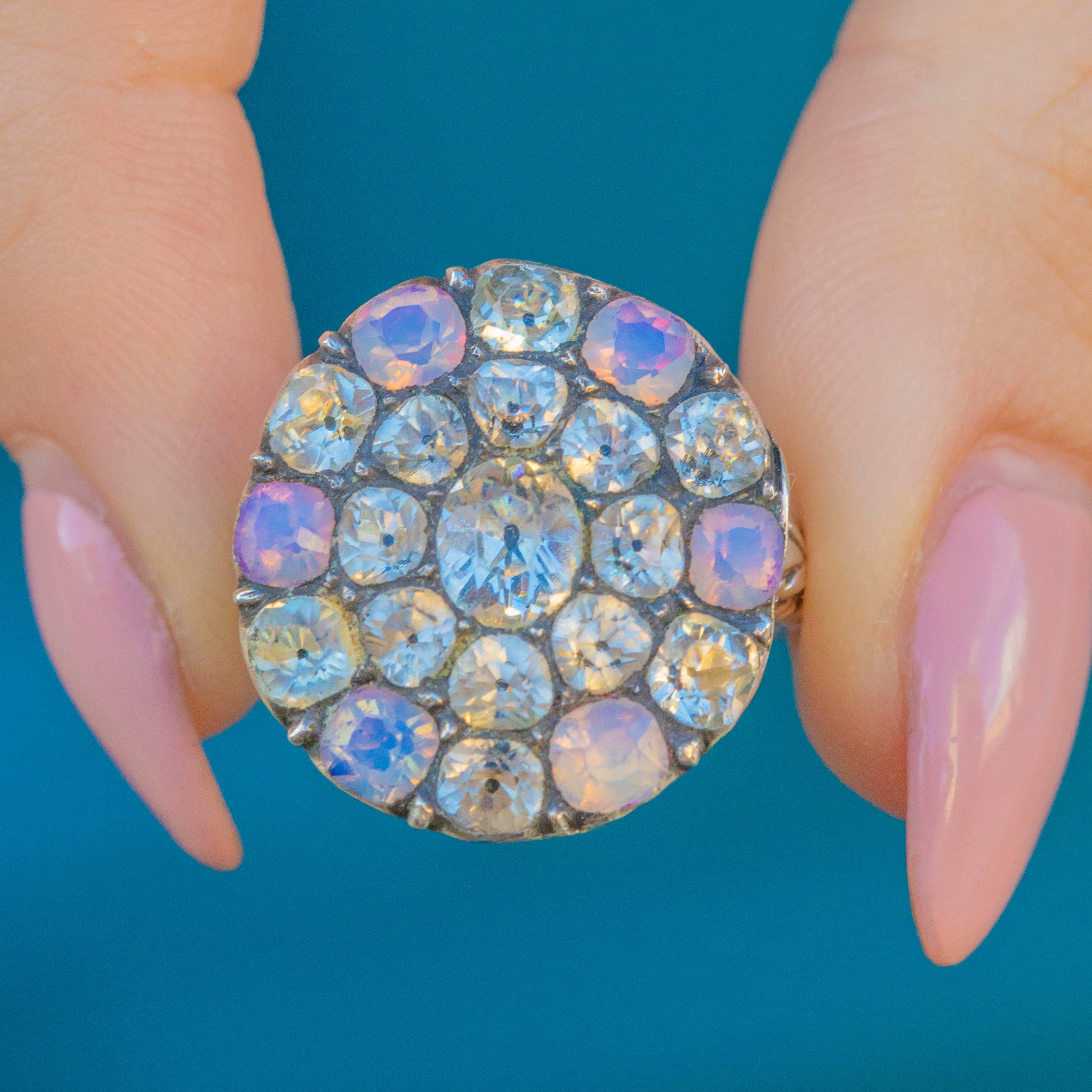 EXCELLENT. This Georgian Opaline and Paste cluster ring is in wonderful condition, particularly given its venerable age. The gemstones are free from chips or scratches and the Silver is bright and tidy.
