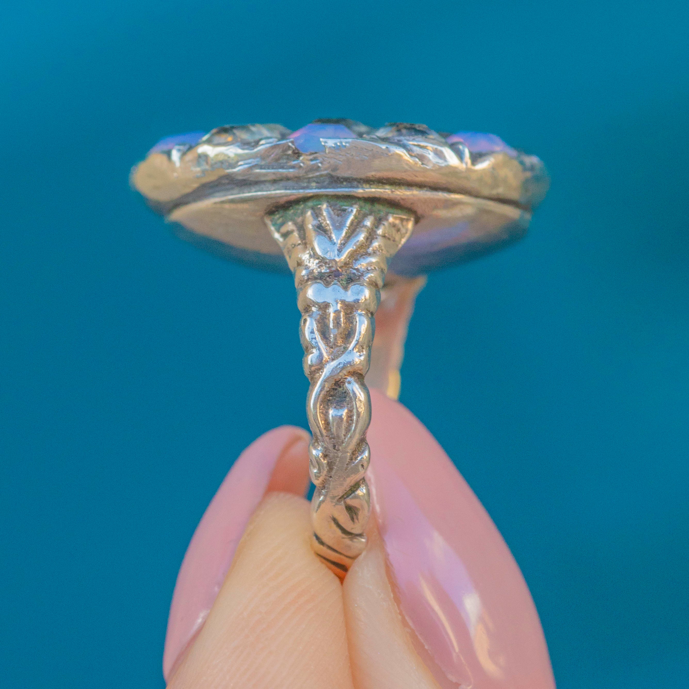 This beautiful Georgian Opaline and Paste cluster ring is set in Silver with a wonderfully detailed shank that is a later addition from the Arts and Crafts period.