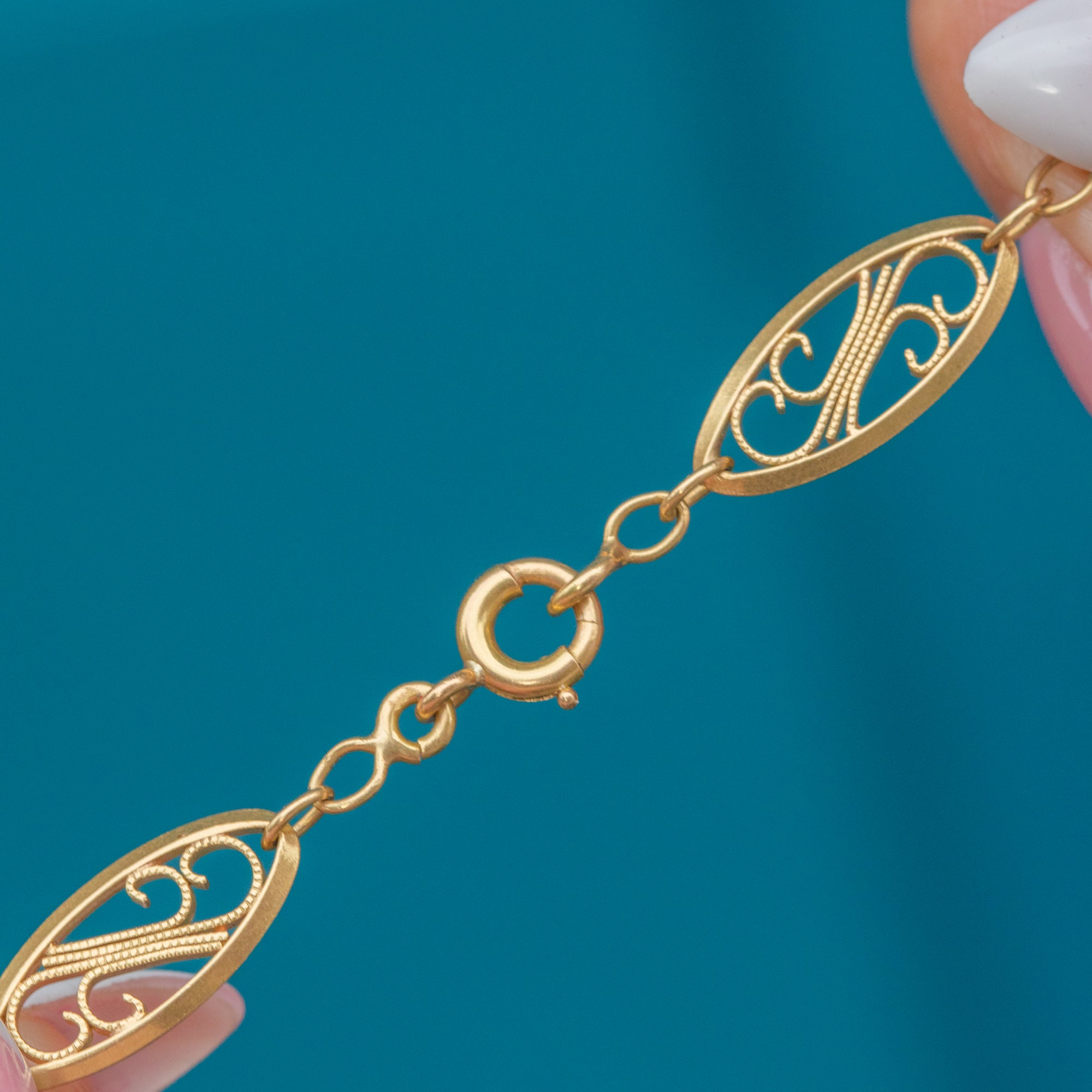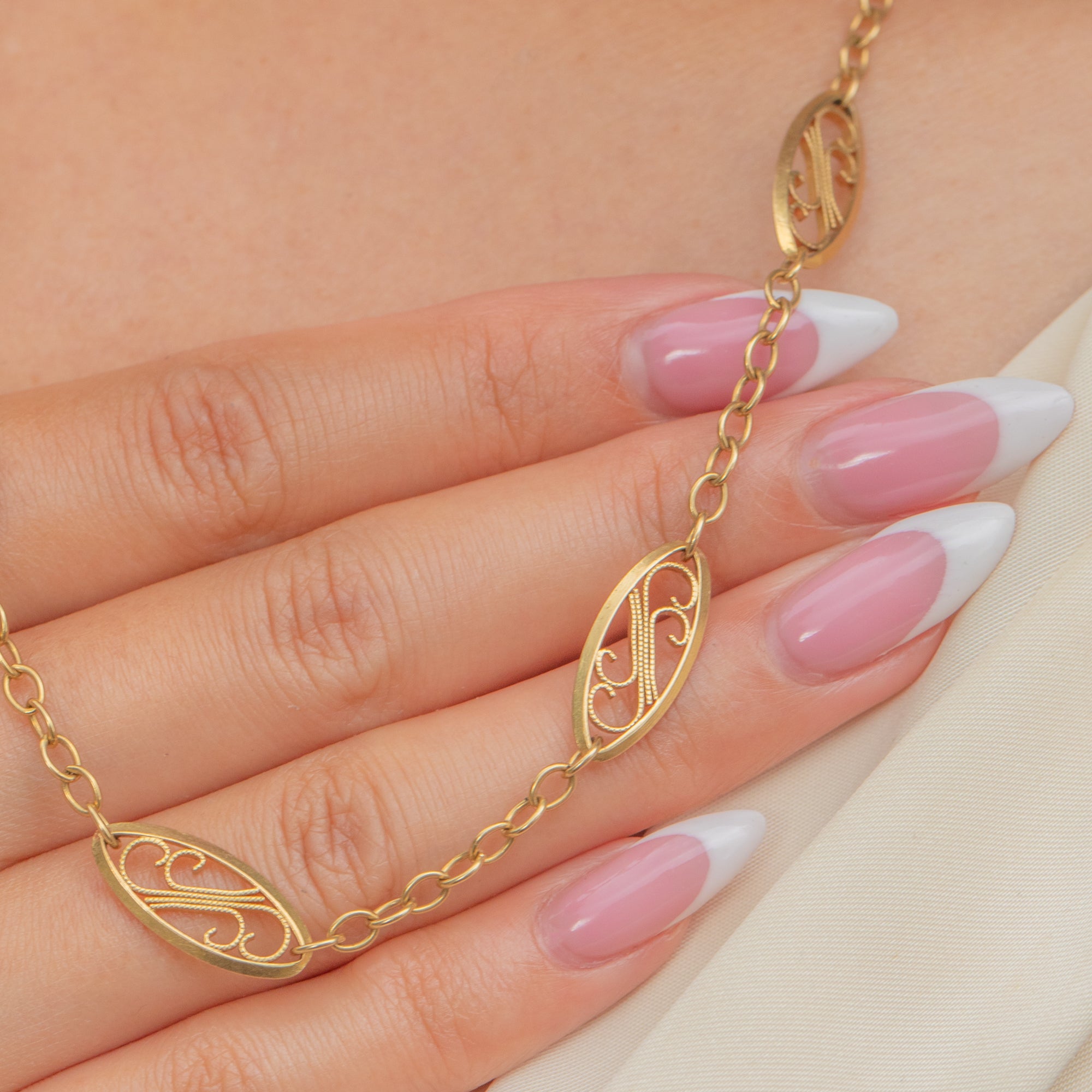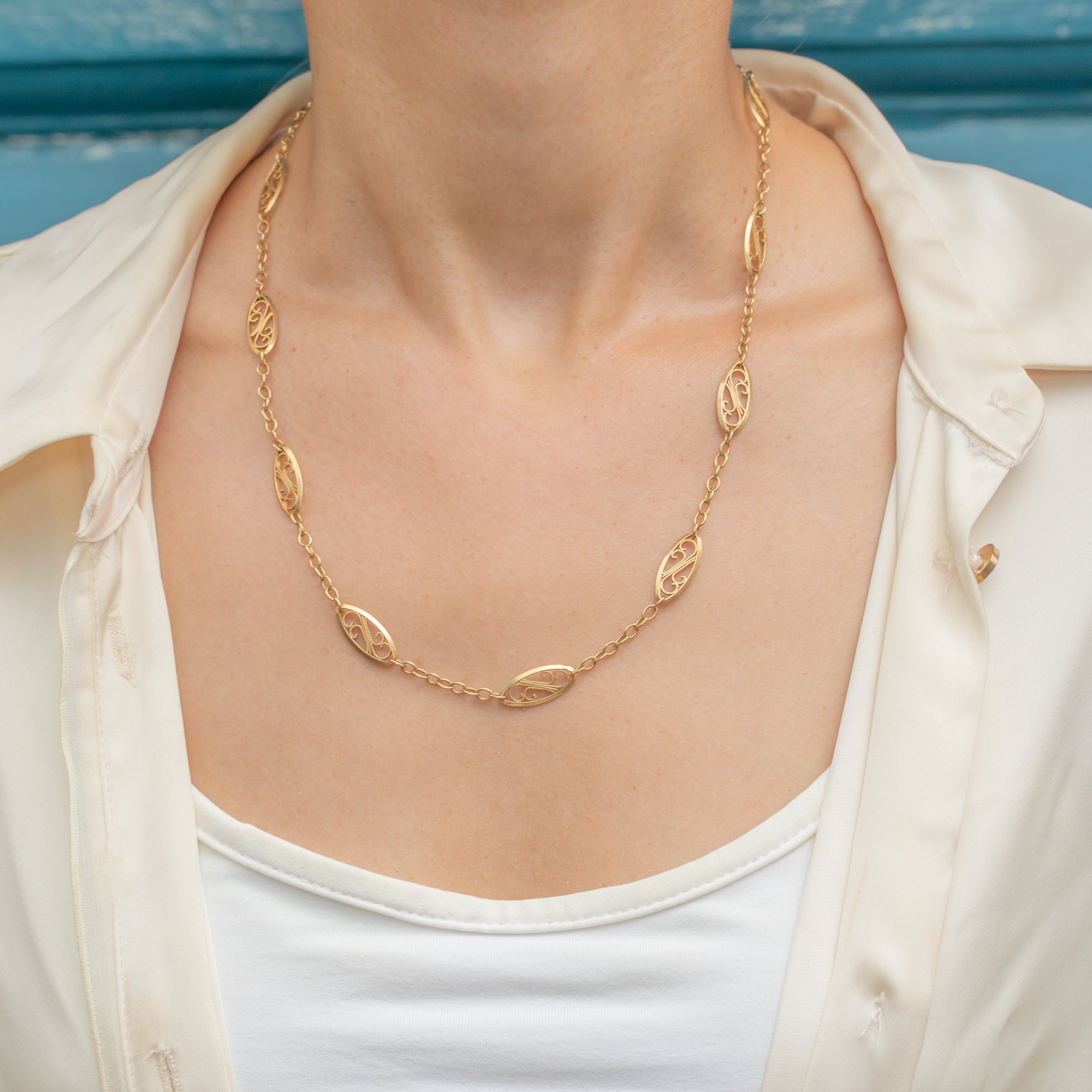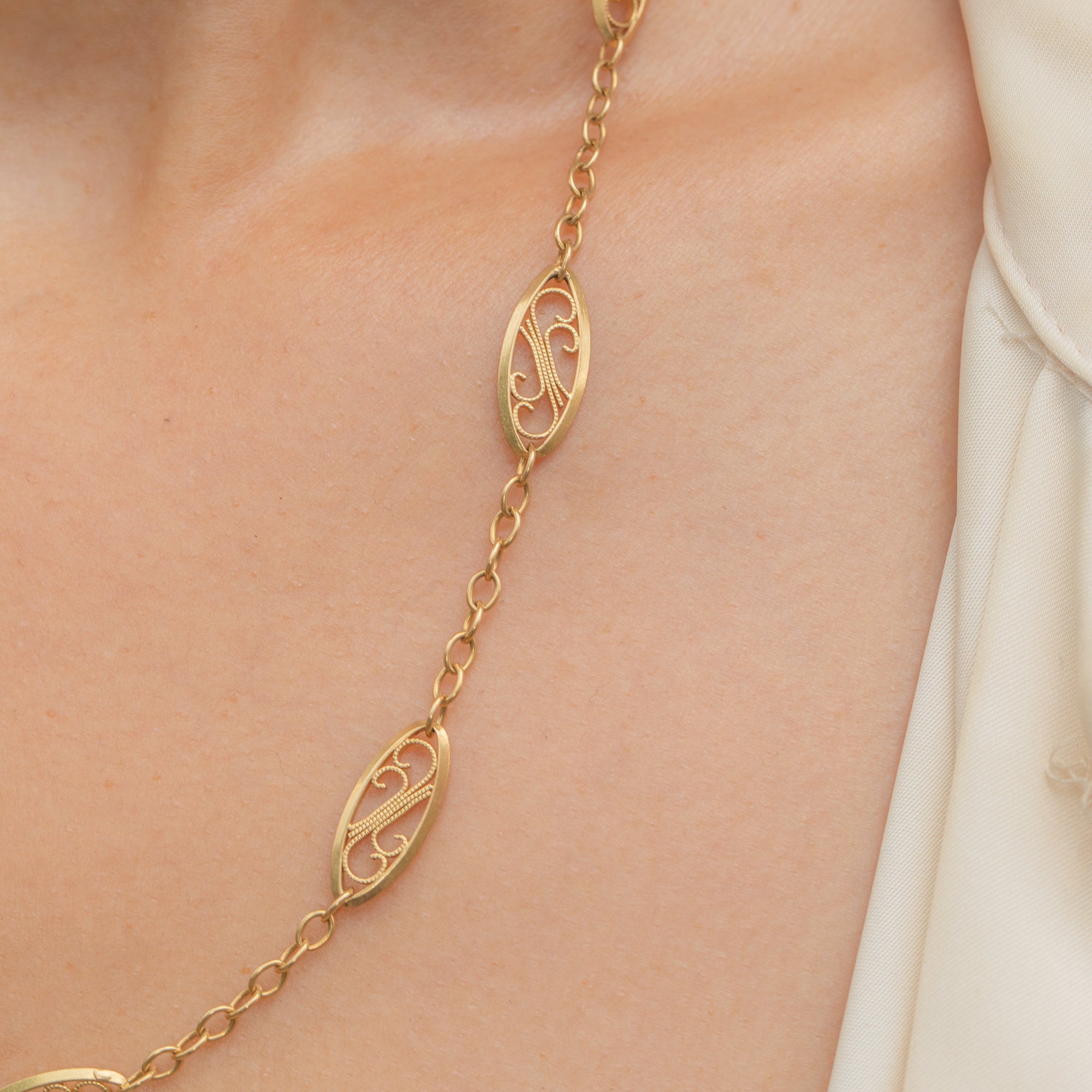 This French Belle Époque chain is all about elegant movement: fancy marquise links with delicate filigree details, wrought in rich 18ct Gold. The elongated silhouettes catch the light beautifully and sit fluidly against the skin for a refined, unmistakably antique look.
