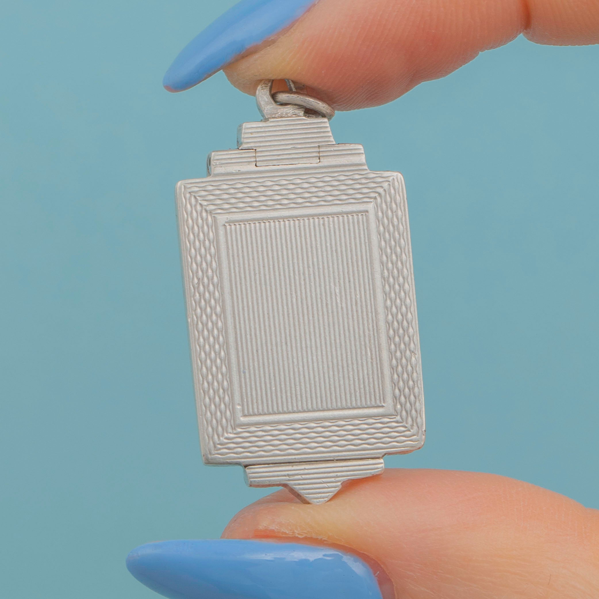 This striking Art Deco silver engraved rectangular locket beautifully captures the elegance of its era. Boasting finely engraved lines within a bold geometric design, this Art Deco locket perfectly captures the craftsmanship of the early 20th century.