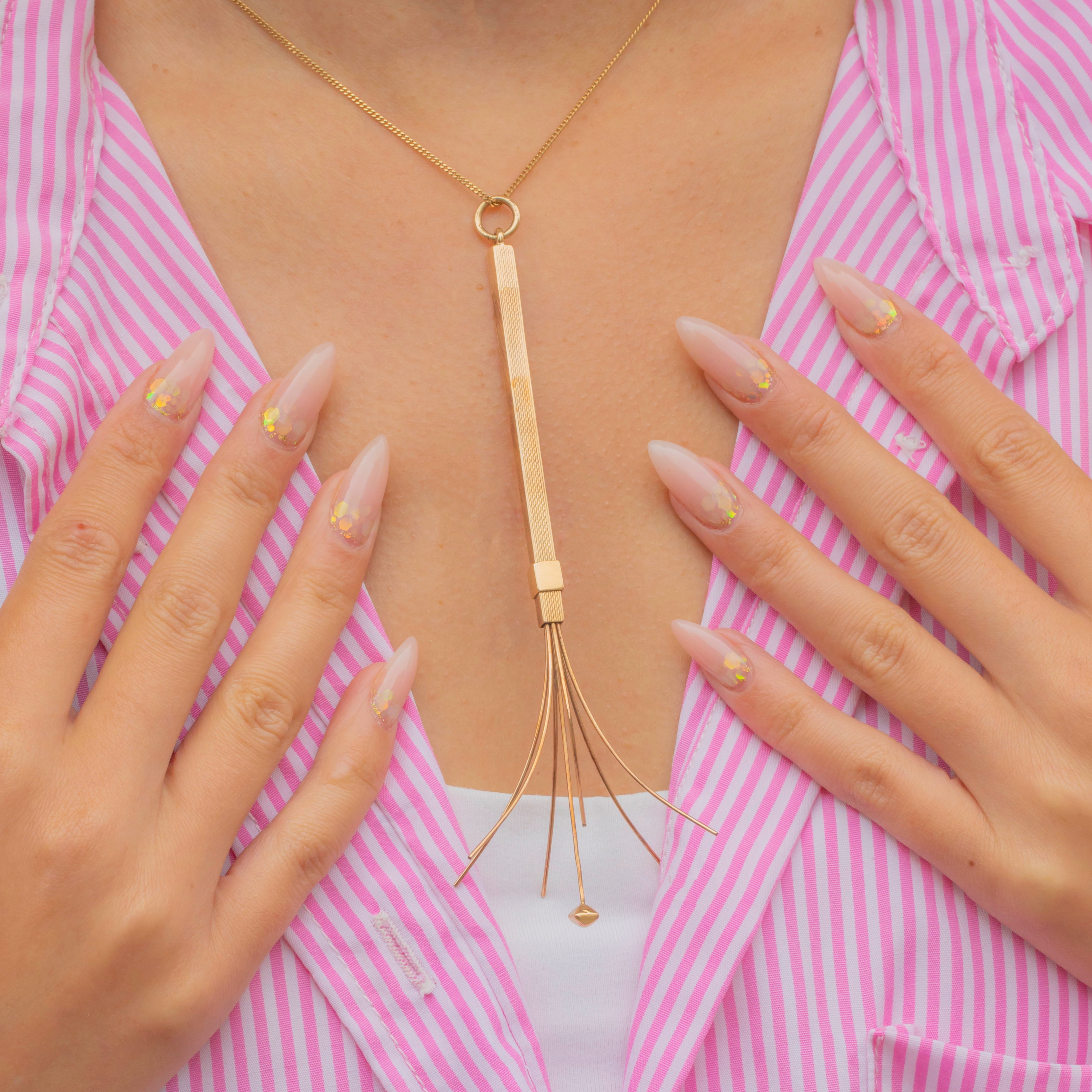 A fun and unusual 1970s Retro swizzle stick charm crafted in 9ct Gold. Complete with a jump ring for easy wear, this miniature cocktail stirrer extends and retracts smoothly, making it both a playful conversation starter and a collectable piece for everyday wear.