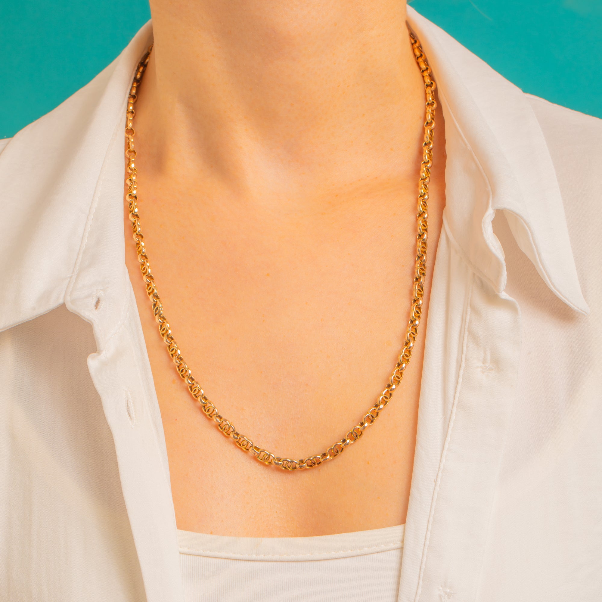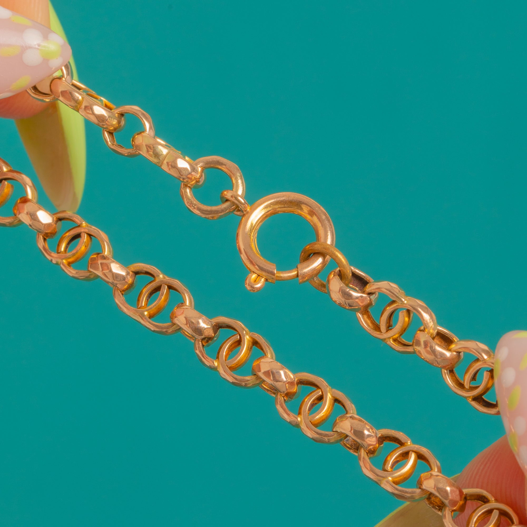 A rare Victorian fancy “Double C’s” chain in glowing 9ct Gold, this beauty plays with negative space and light in the most elegant way. Each interlocking C-shaped link has faceted, textured faces that shimmer with every movement, creating a refined sparkle that feels undeniably luxurious.