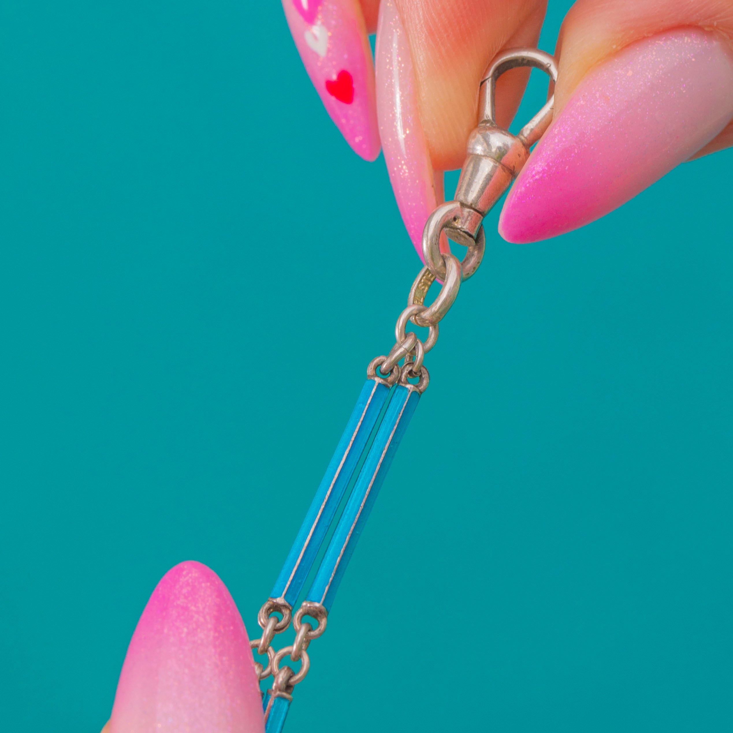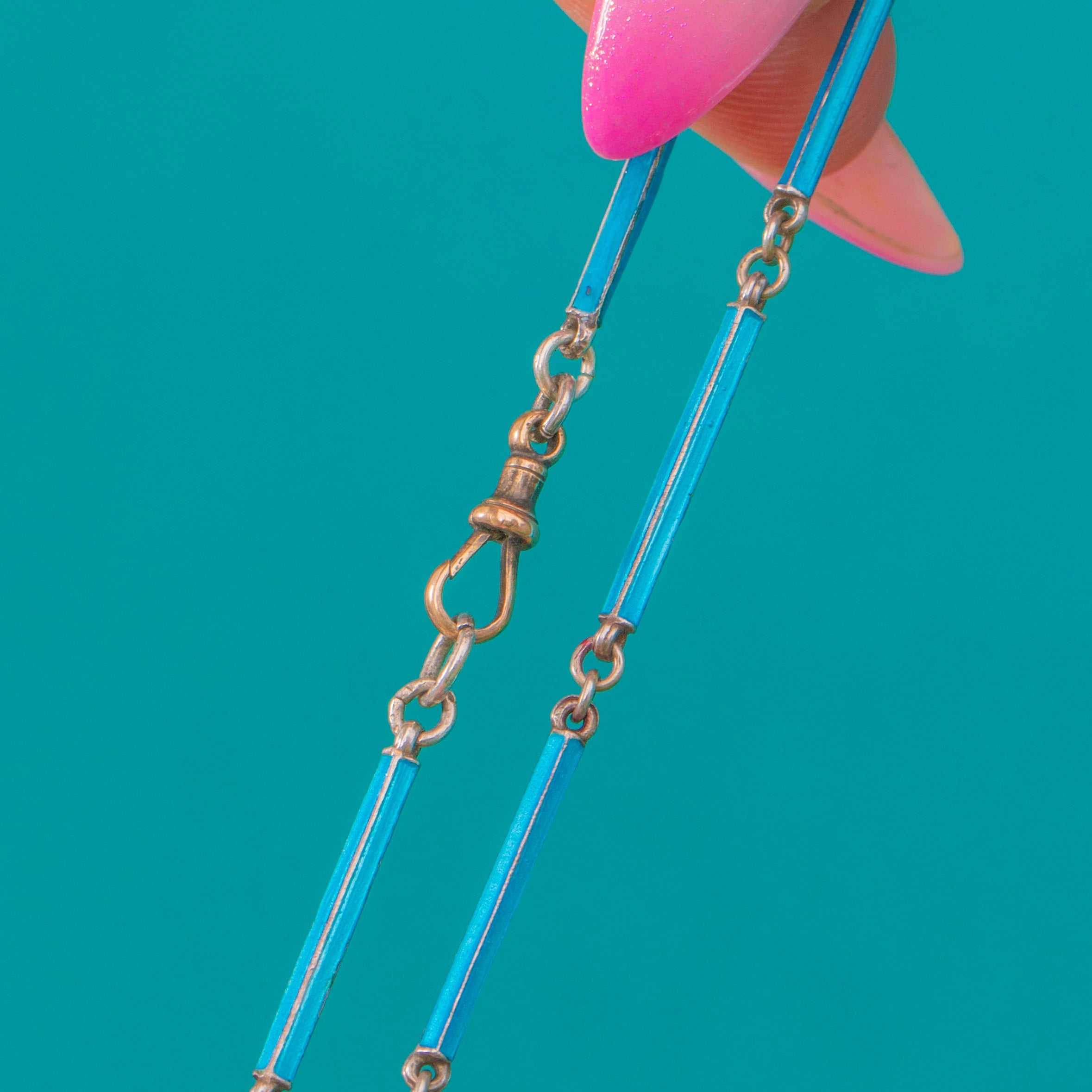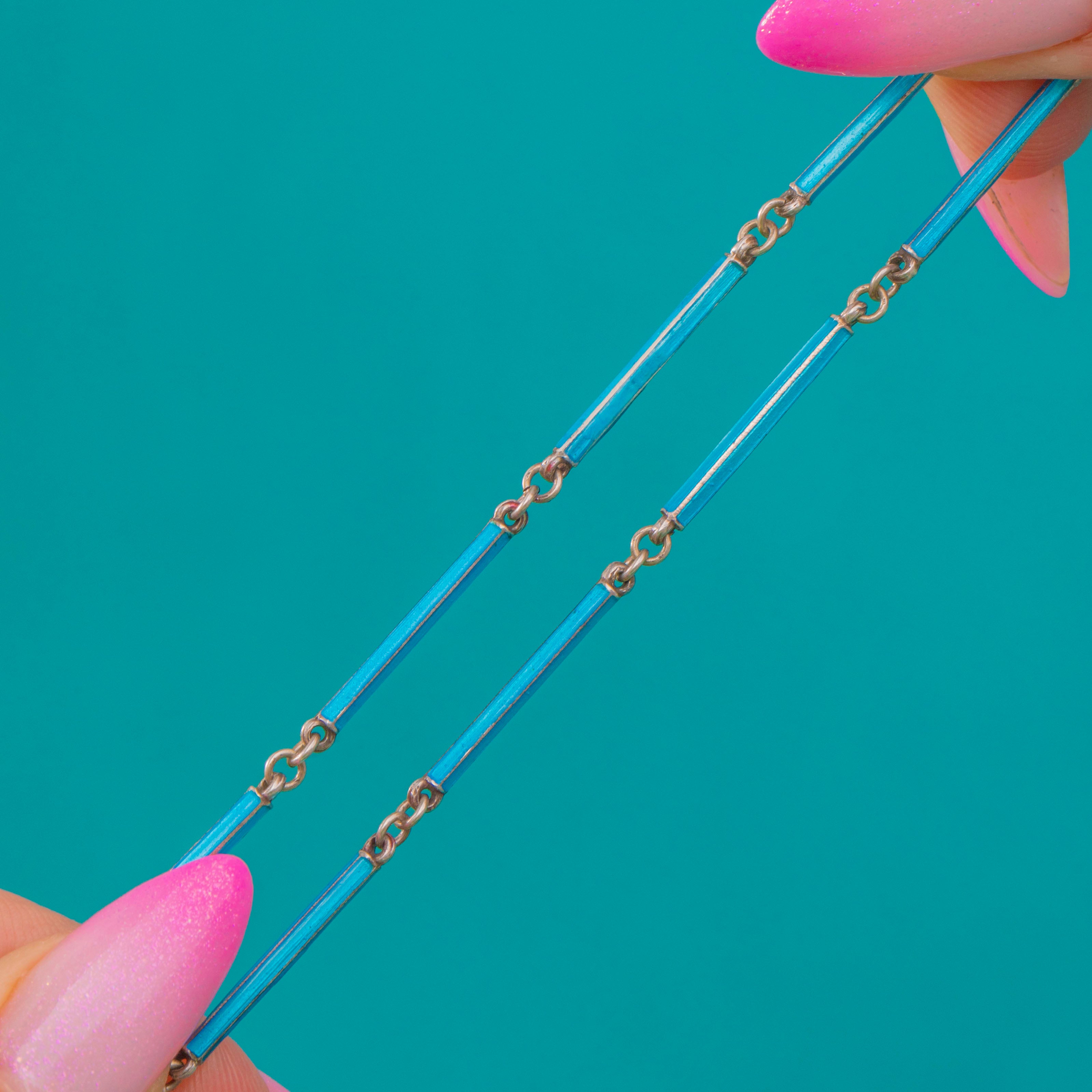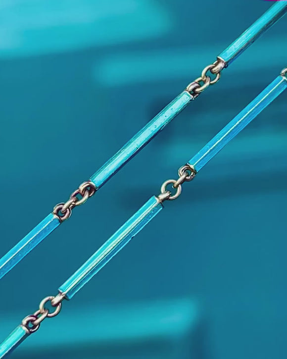 Awash in a glossy robin’s‑egg blue, this Edwardian Silver bar‑link chain is a joyful study in colour and rhythm. Slim Enamelled batons are articulated with petite links to drape with elegant fluidity, their turquoise hue lending a fresh pop to any neckline.