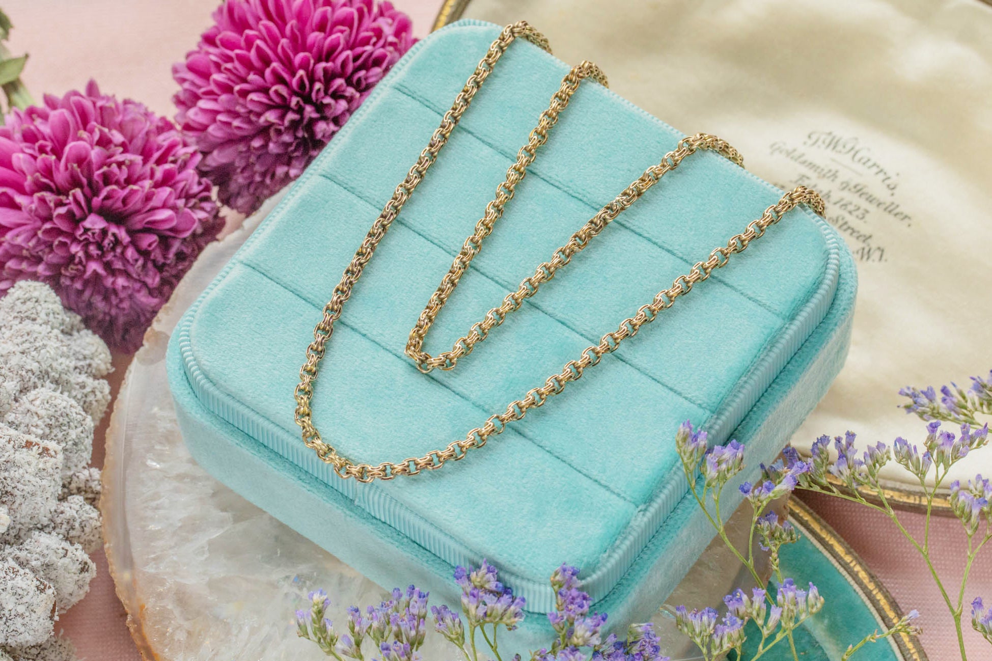 We adore this classically elegant antique 9ct Gold longuard chain. Featuring rounded 9ct Gold belcher links, this Victorian chain sits at a lovely length of 48".