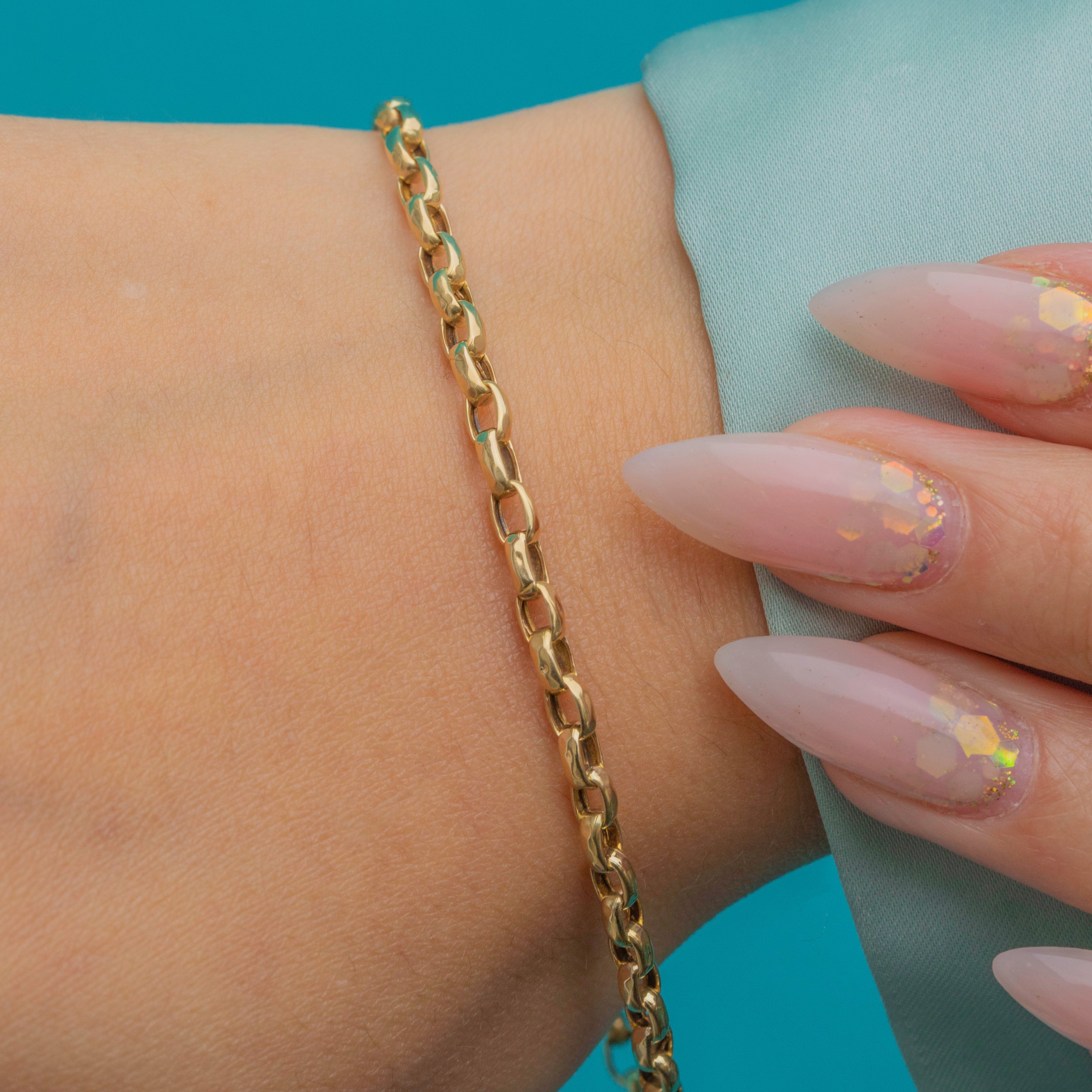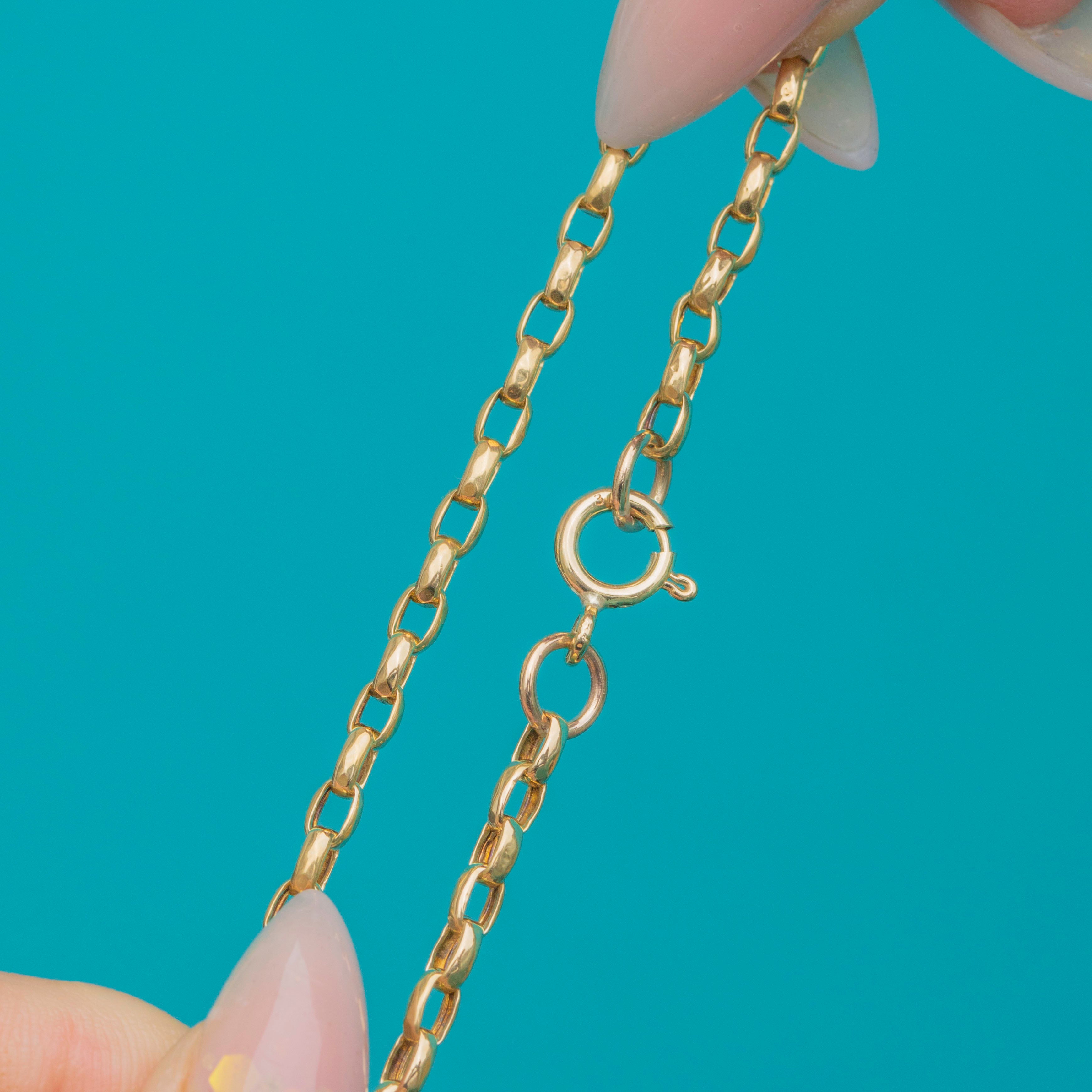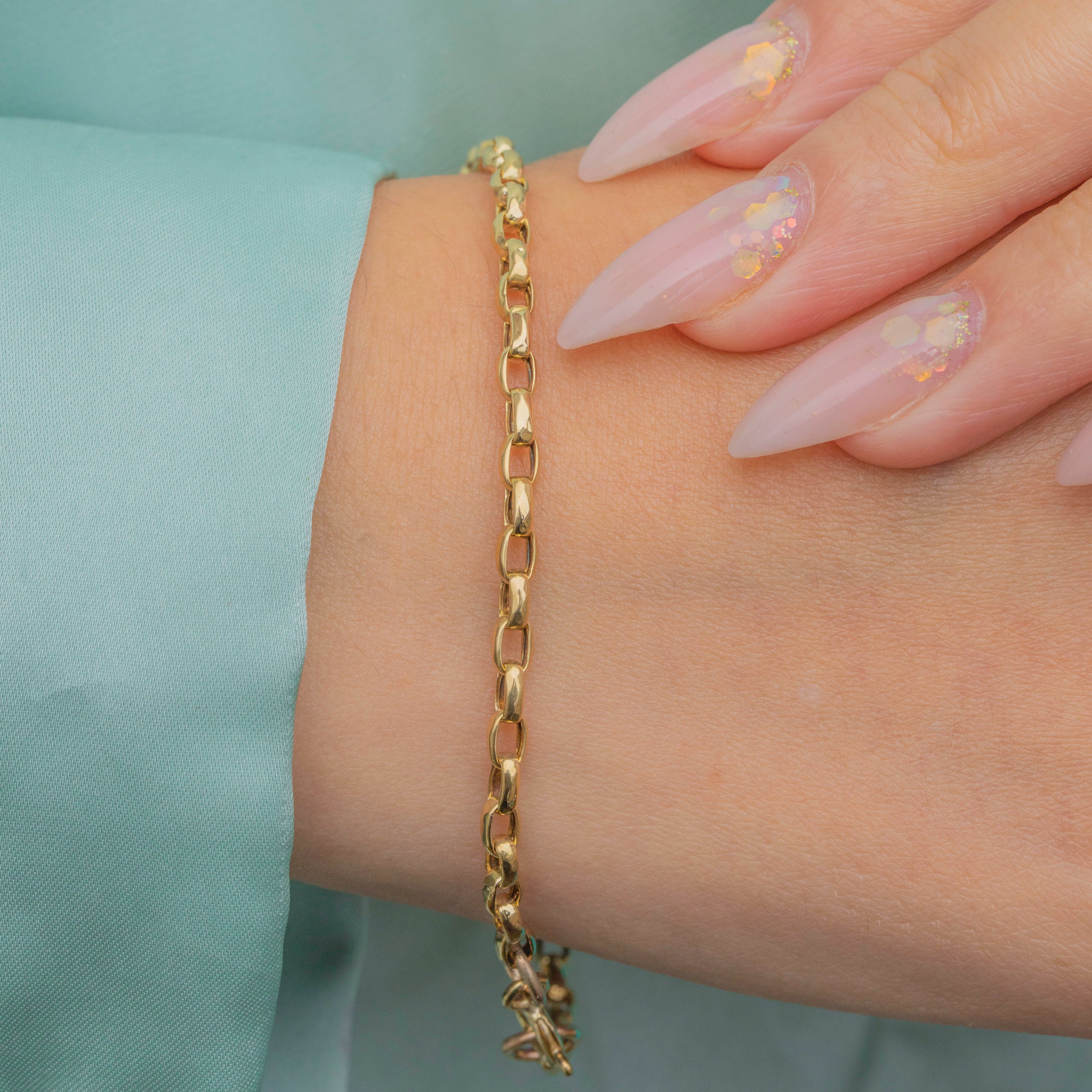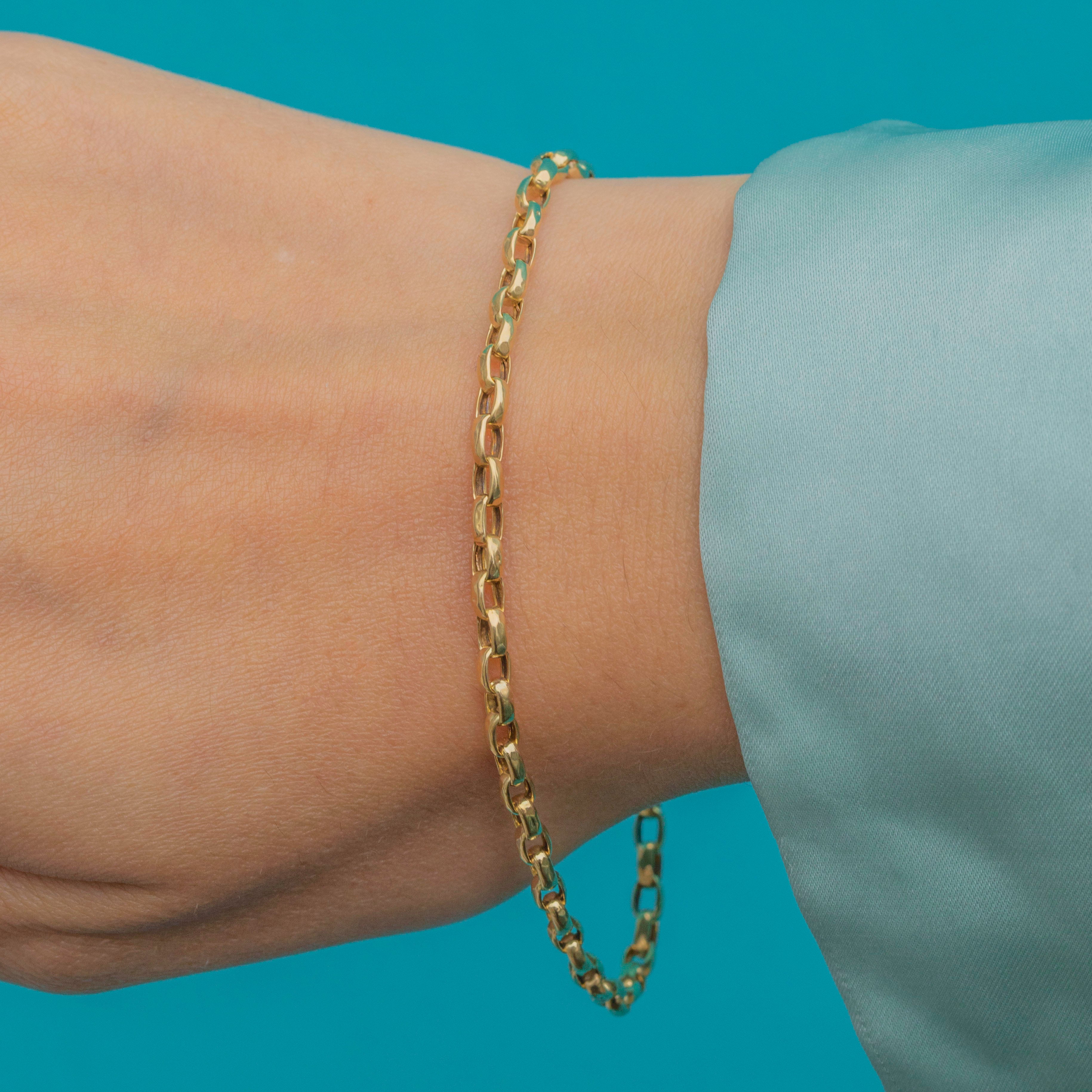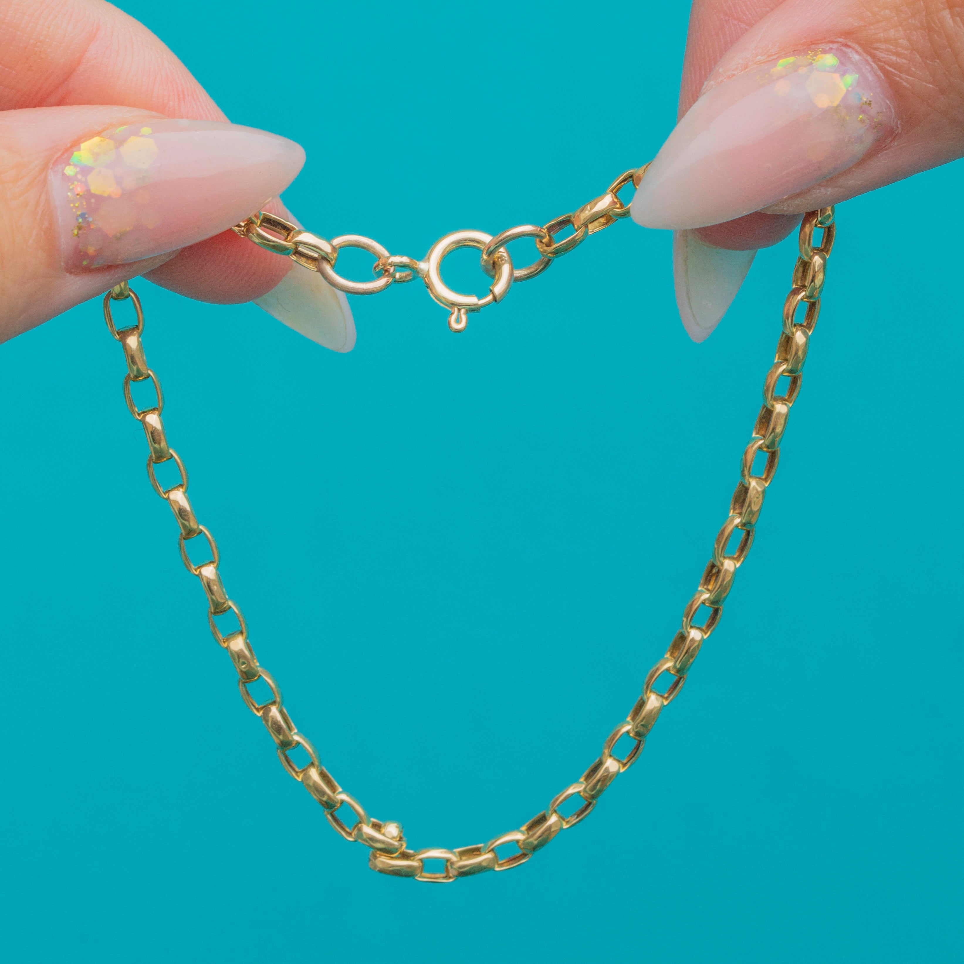 A classic Victorian belcher bracelet, crafted in solid 9ct Gold. The 2.5mm wide rounded links have a soft, fluid feel on the wrist, making it perfect for everyday wear. With its timeless style and warm Gold glow, this bracelet is a versatile piece that can be worn alone or layered with other antique chains and bangles for a curated look.