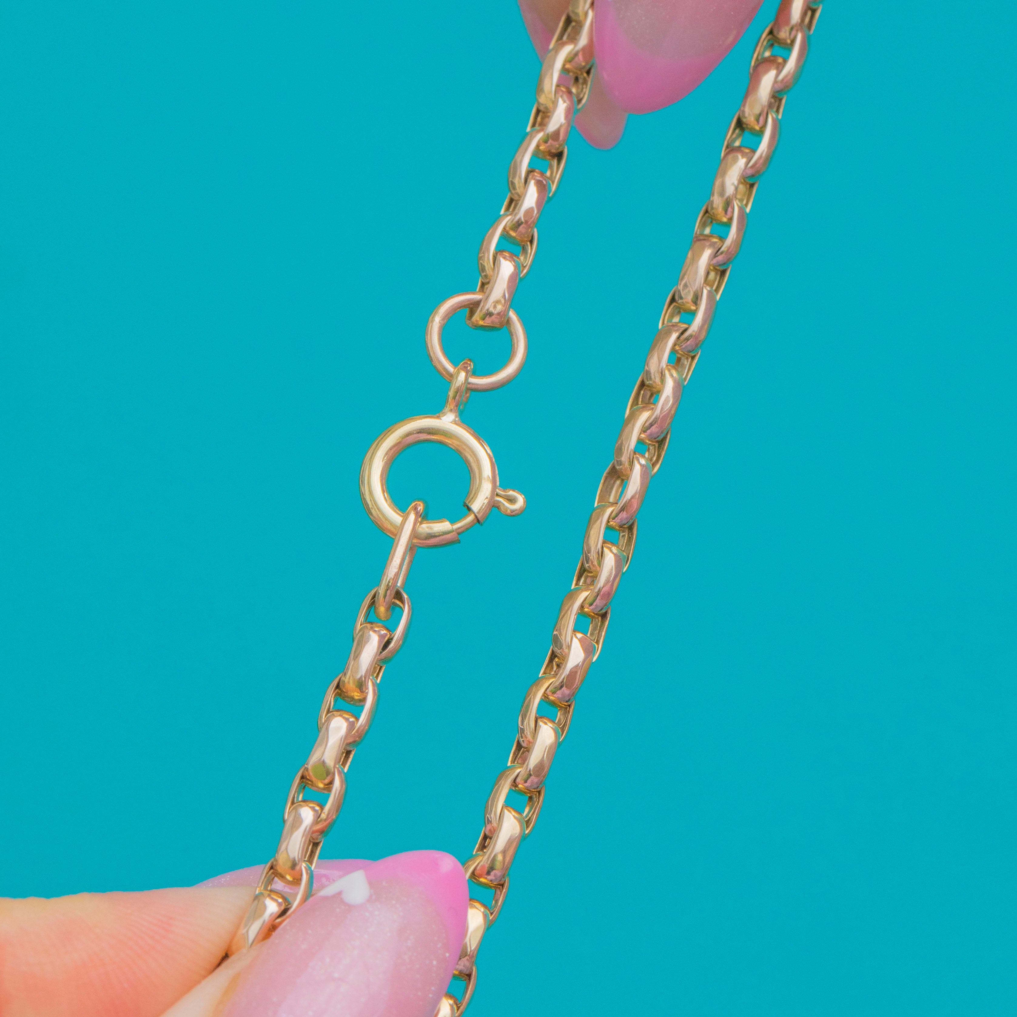 A classic Victorian belcher bracelet with softly rounded links and a traditional bolt-ring clasp. The timeless design and warm antique glow make it perfect for everyday wear or for layering with other antique chains and bracelets.