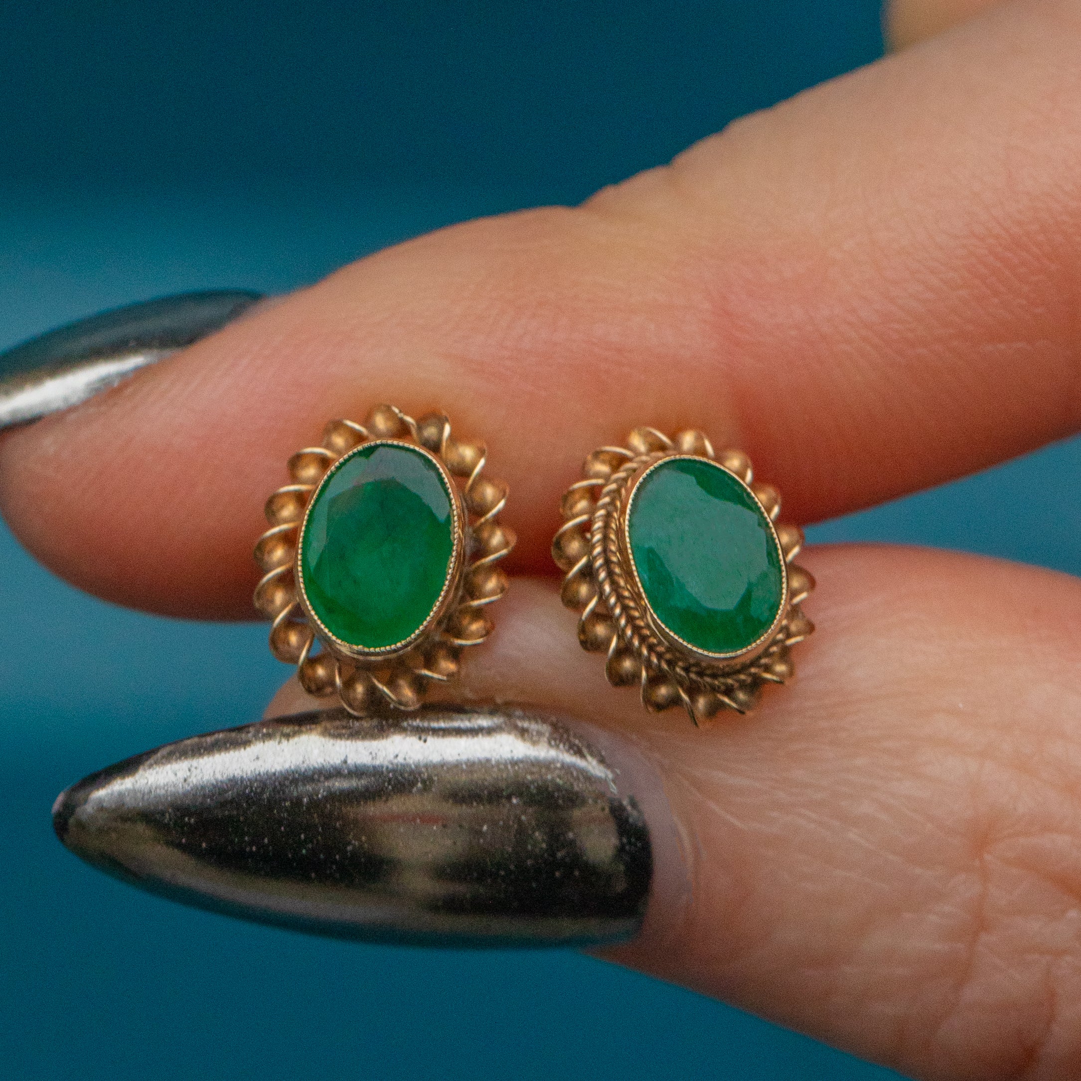 Each earring boasts a gorgeous Emerald radiating deep green hues, perfectly complimented by buttery twisted rope Gold borders. These Vintage earrings do not go amiss, and will make a cute addition to your jewellery collection!