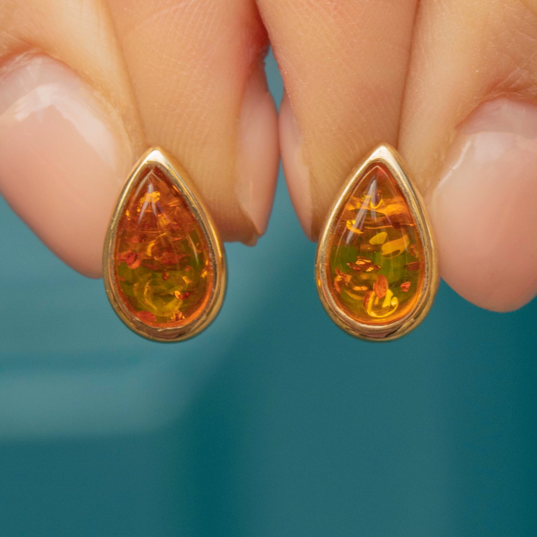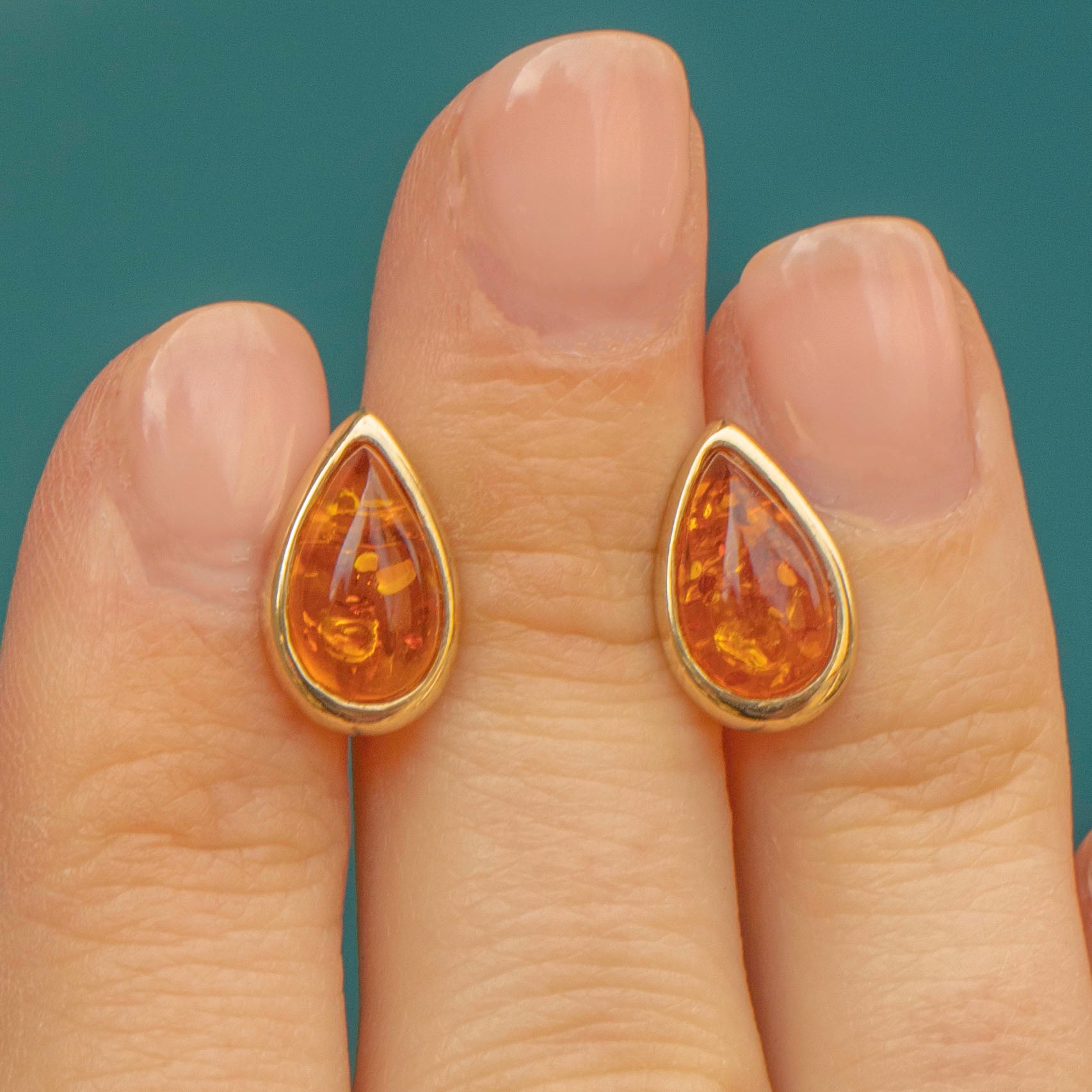 EXCELLENT. With securely set Ambers, smooth bezel settings and tightly fitting butterfly backs, these 9ct Gold Amber pear stud earrings are in excellent condition!