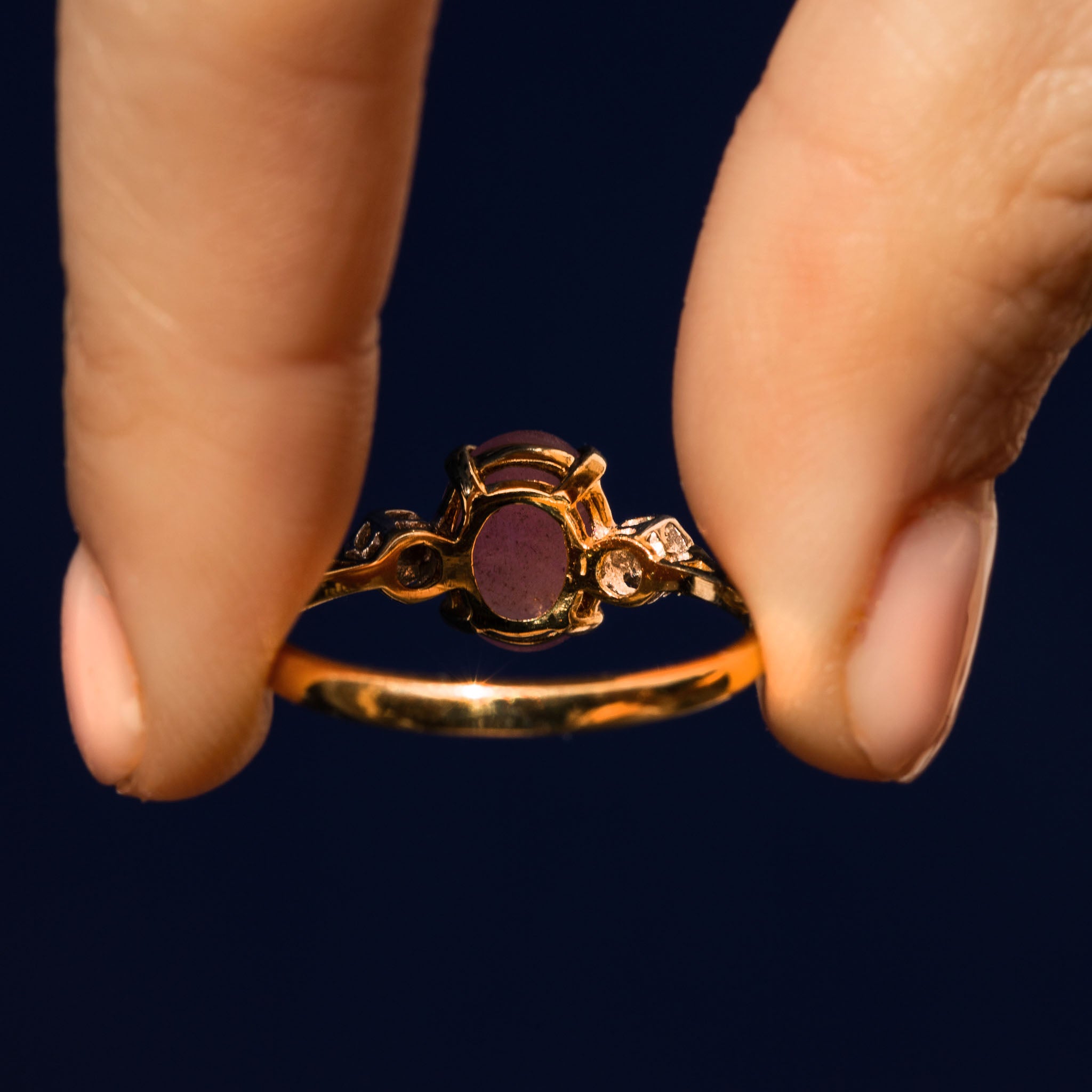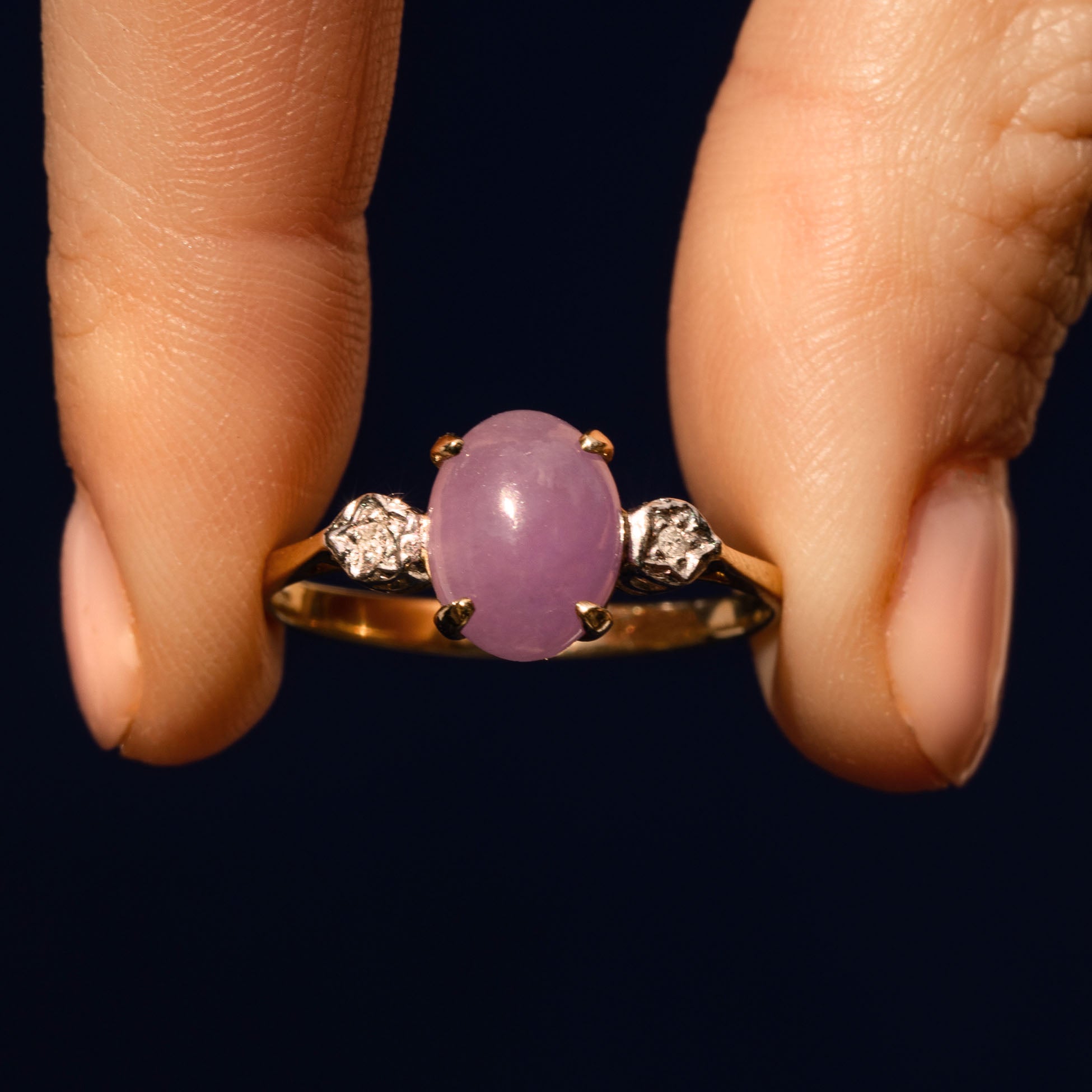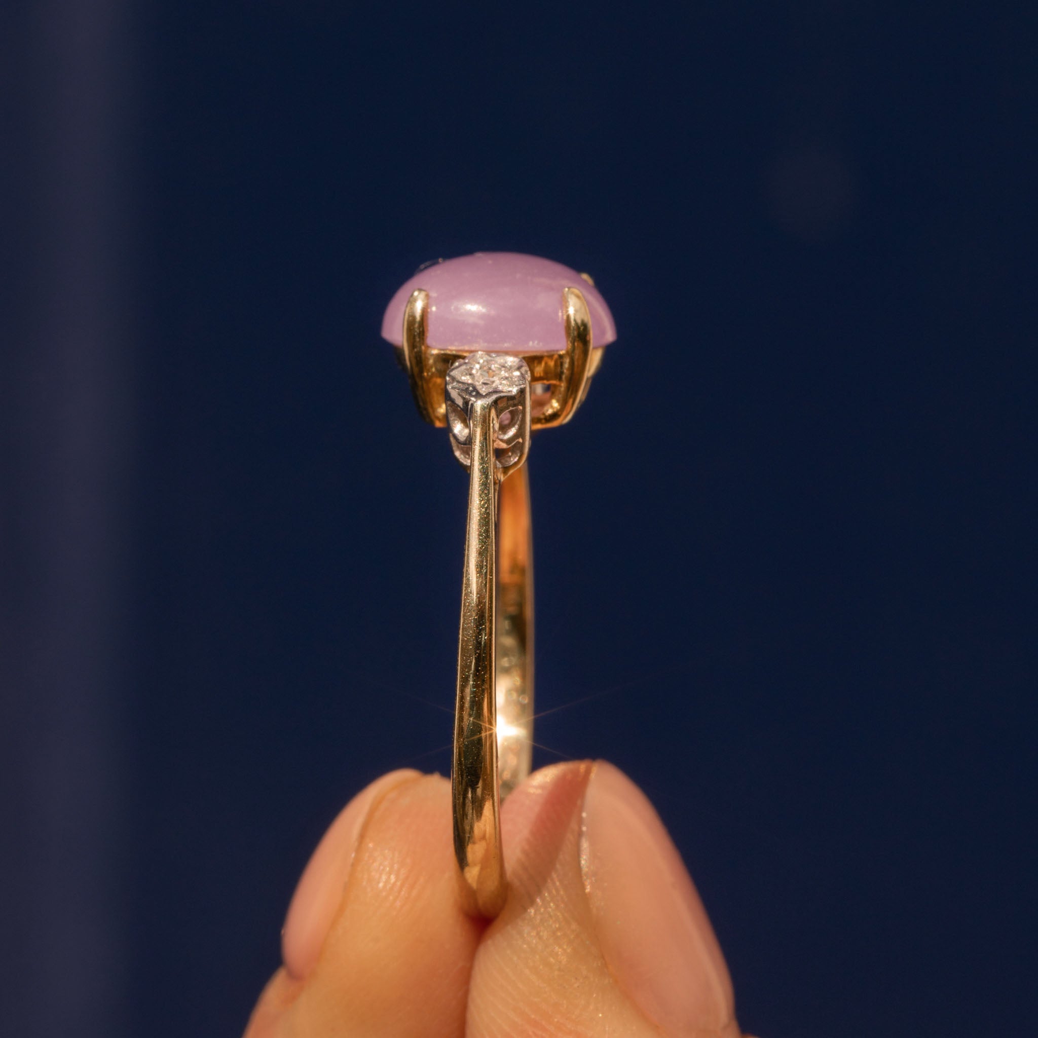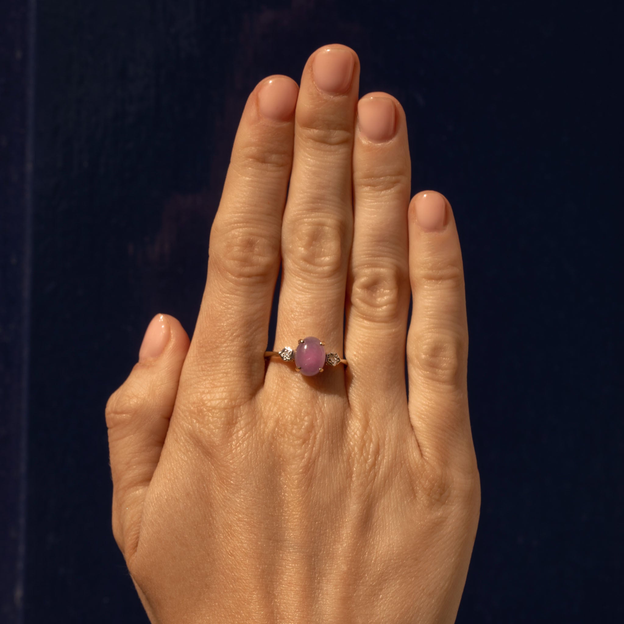 If you have a penchant for unique treasures, this 9ct Gold Amethyst cabochon & Diamond three stone ring will make a fine addition to your collection! Crafted from luscious 9ct Gold, this vintage delight boasts a pastel pink-to-lilac-hued Amethyst flanked by dainty Diamonds creating a feminine piece.
