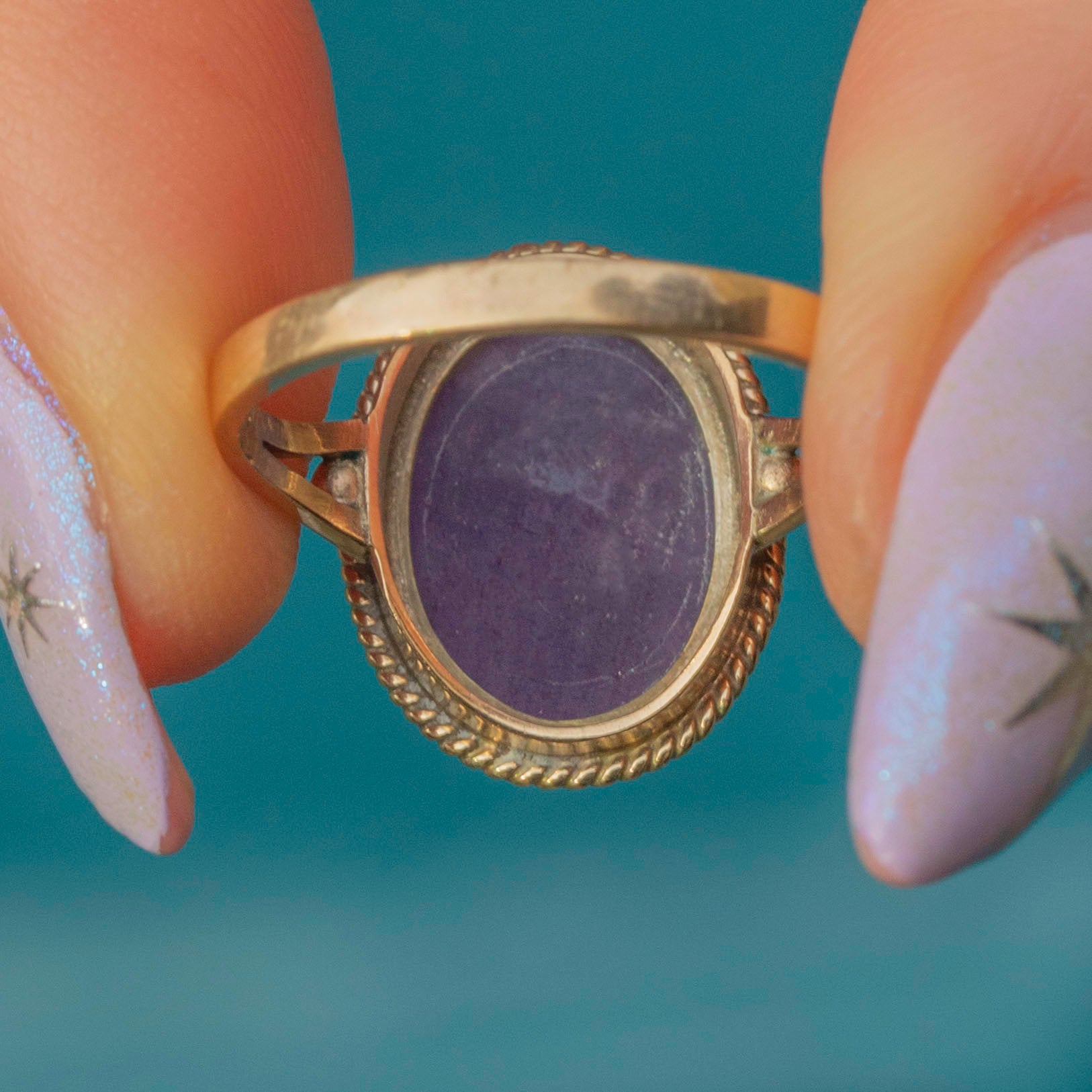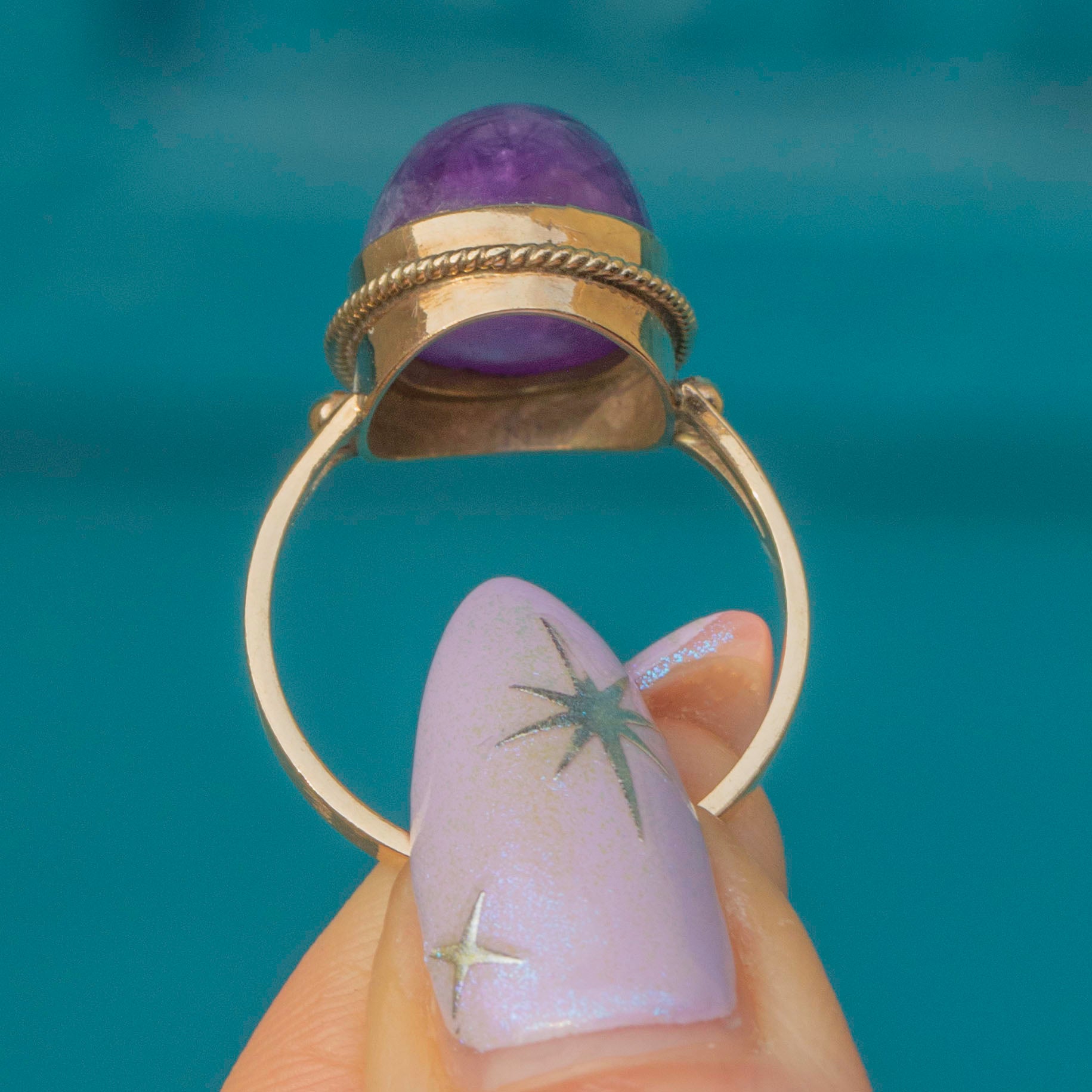 This 9ct Gold Amethyst cabochon ring embodies all things mystical! Like a glowing crystal ball, her deep lavender 5.30 Amethyst cabochon emanates a soft, billowing glow, giving this vintage ring an ethereal allure.