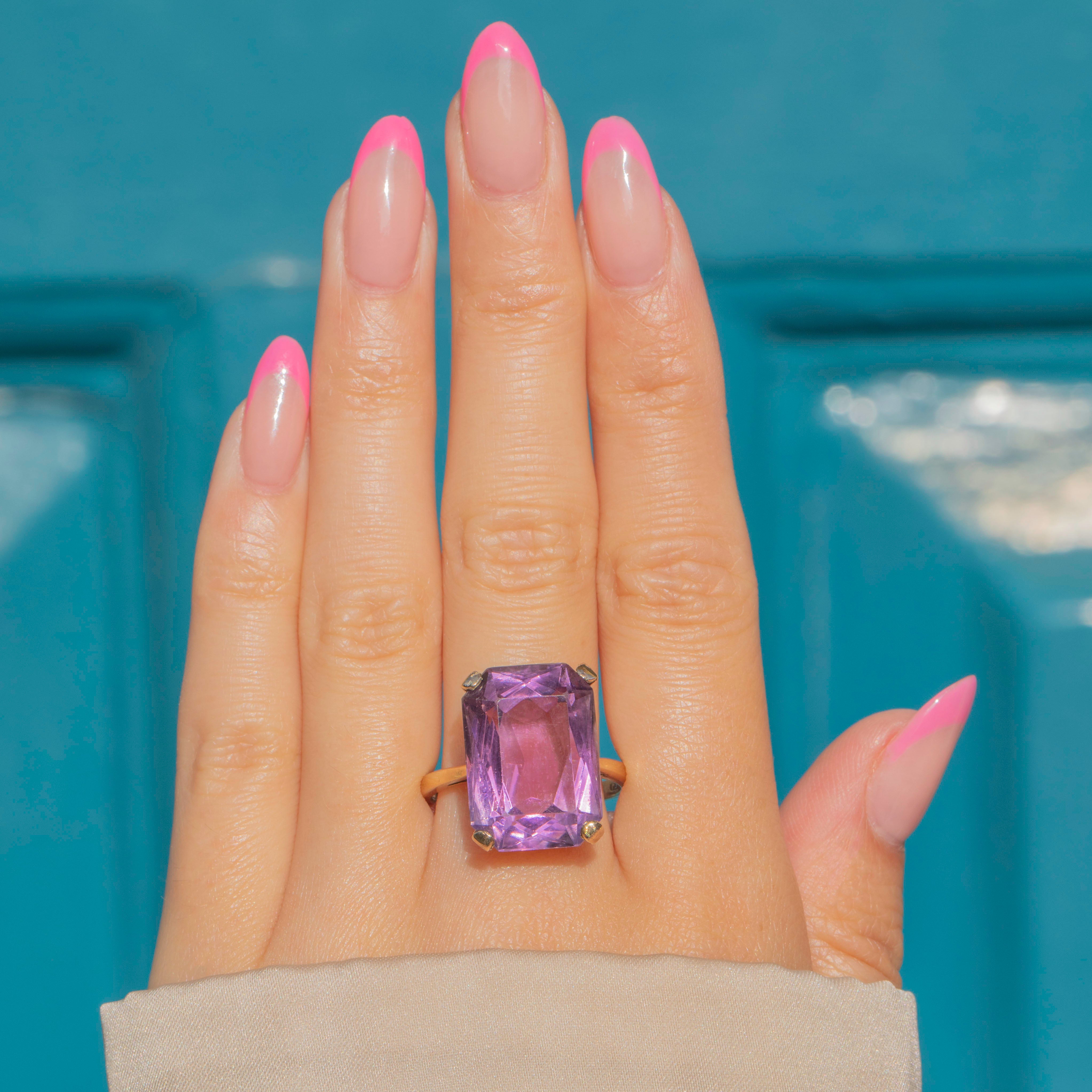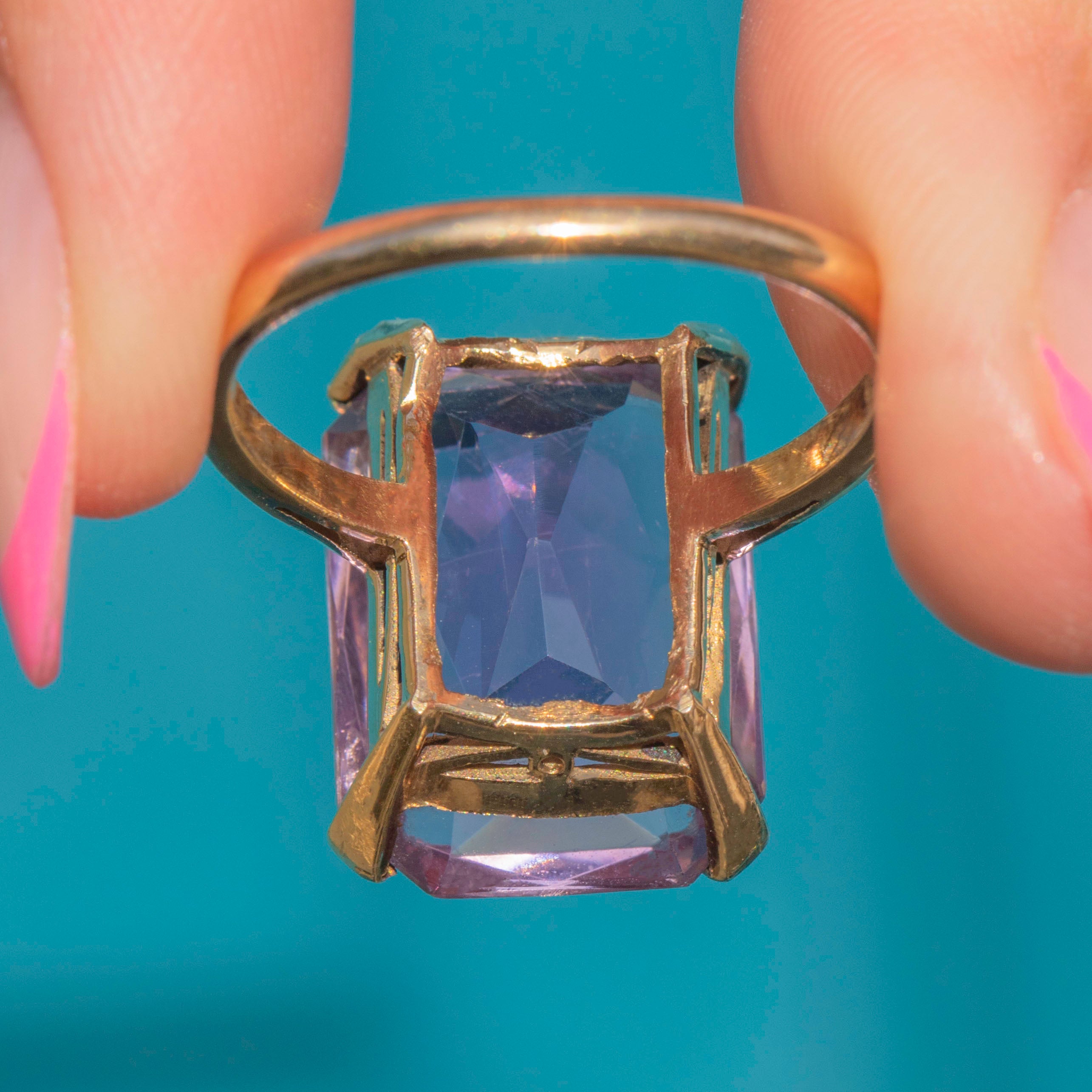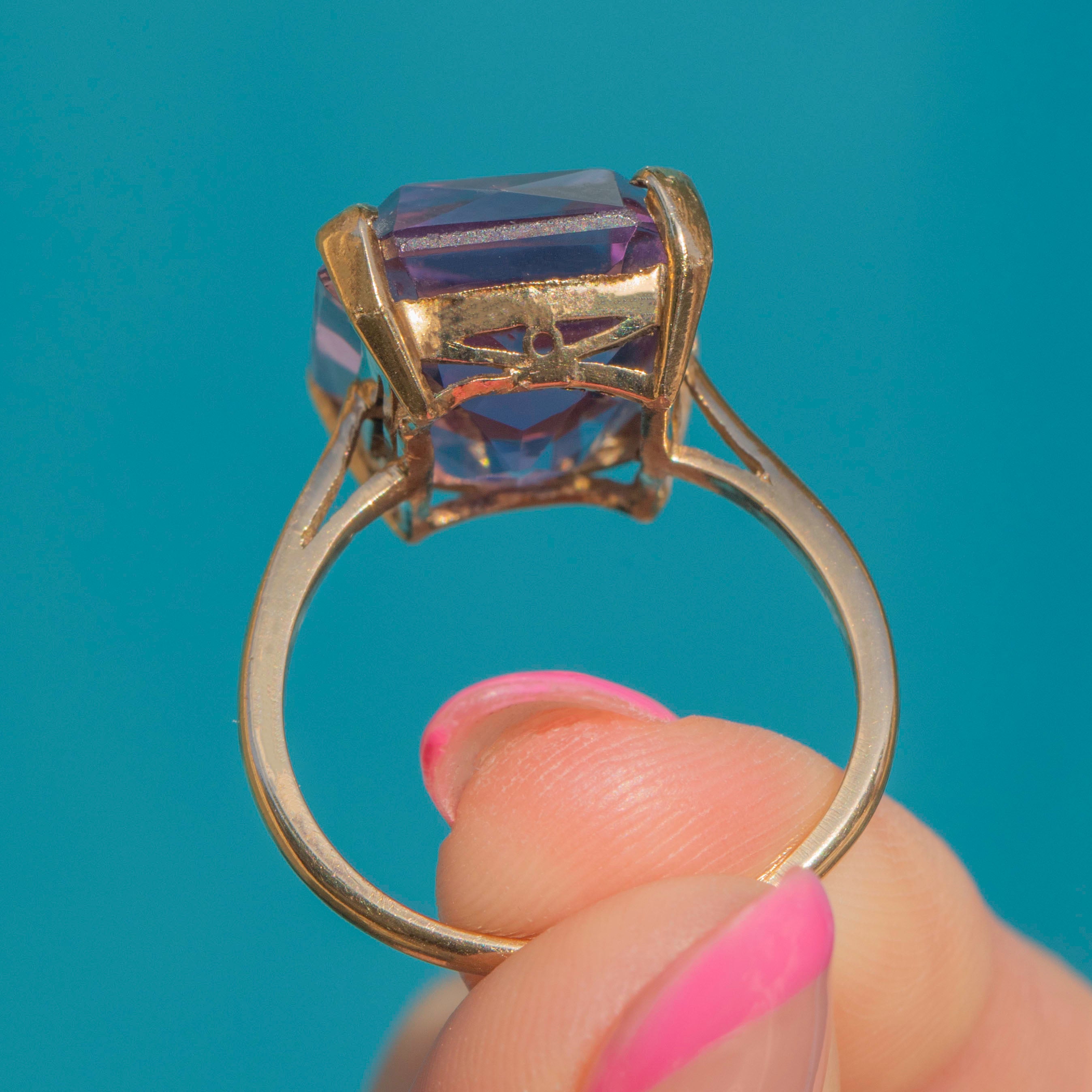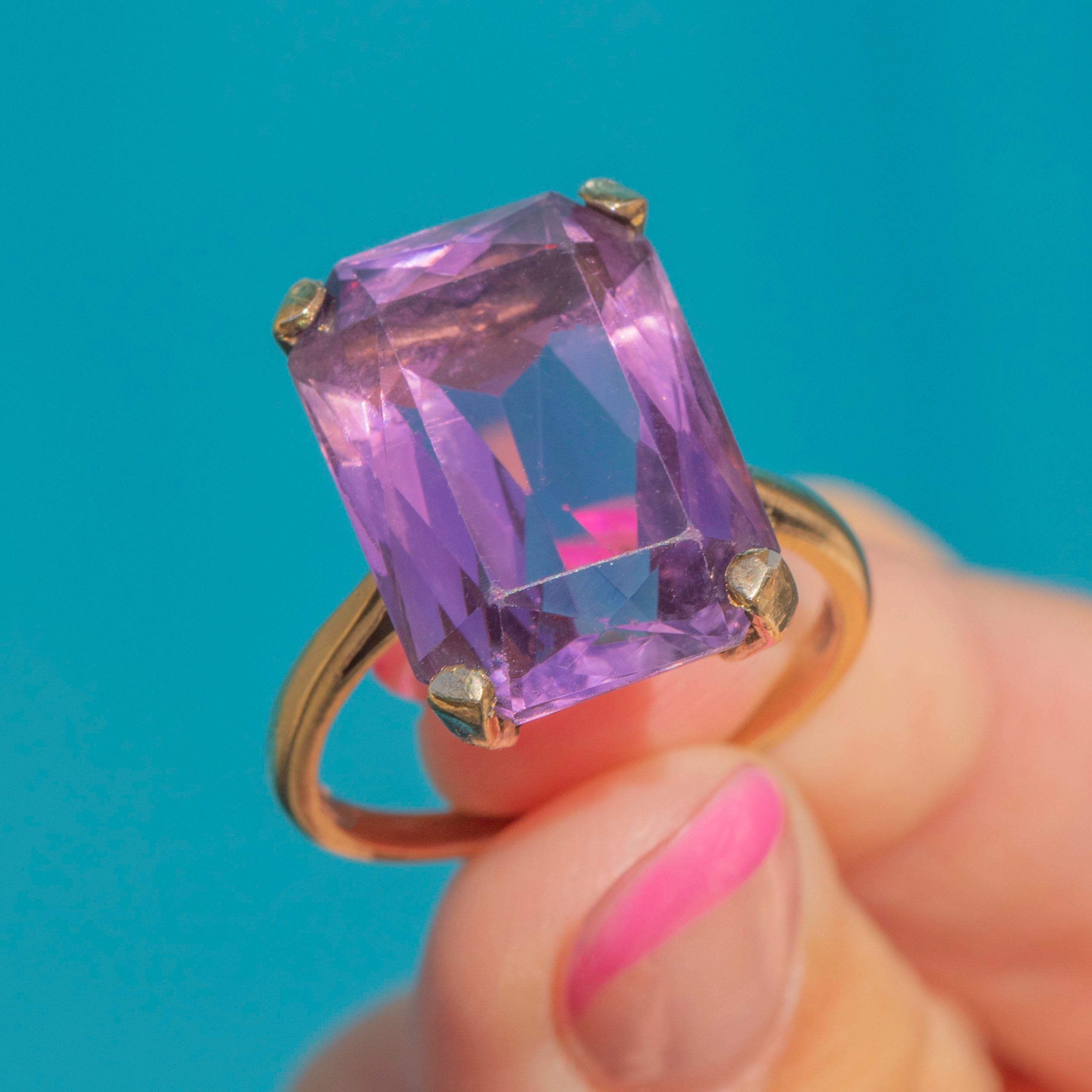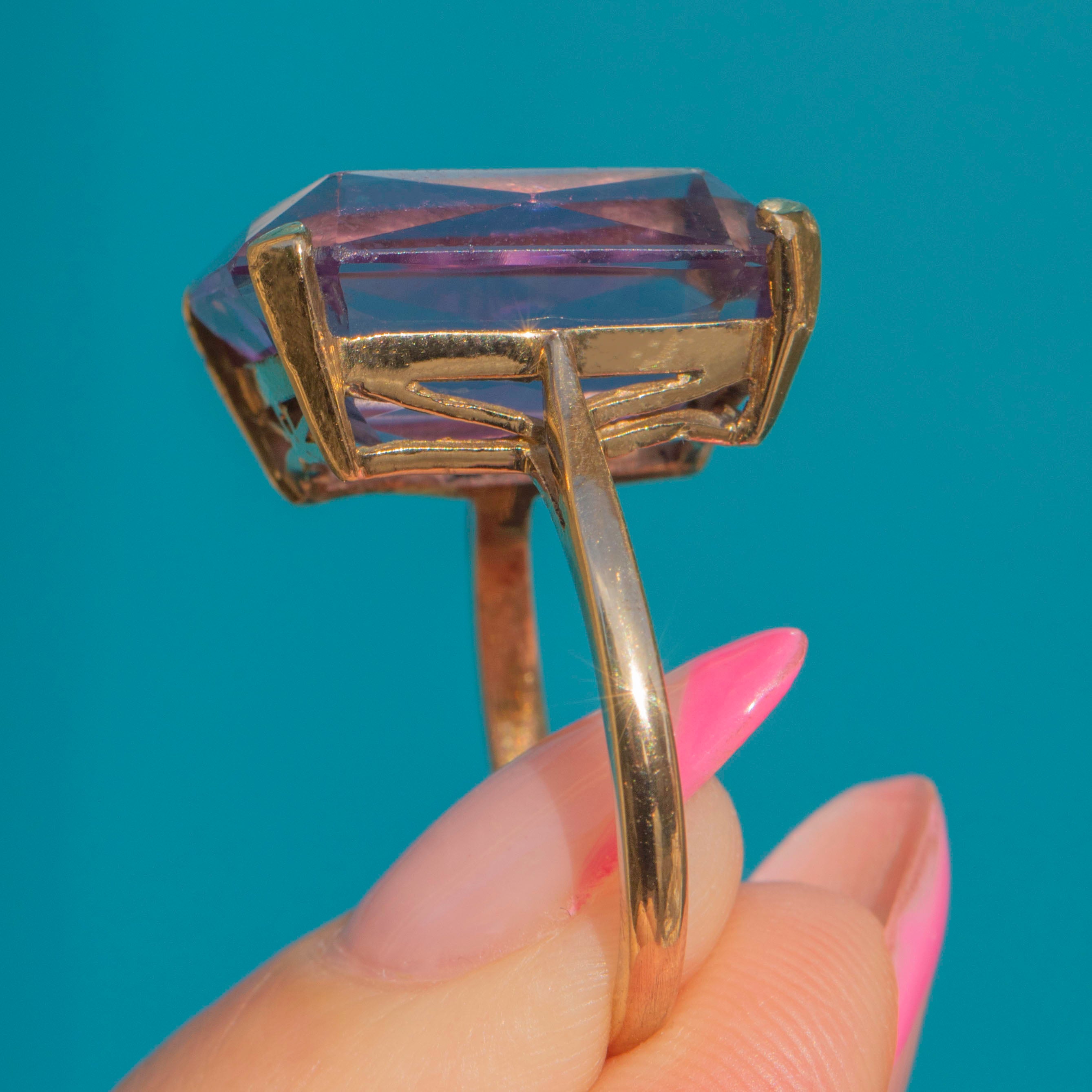 Flaunting a 17.60ct Amethyst, this vintage ring exudes splendour and charm. Her large rectangular-cut faceted Amethyst radiates gorgeous lavender hues, stunning from every angle. She rests within buttery 9ct Gold claws, with a striking profile and glossy band.