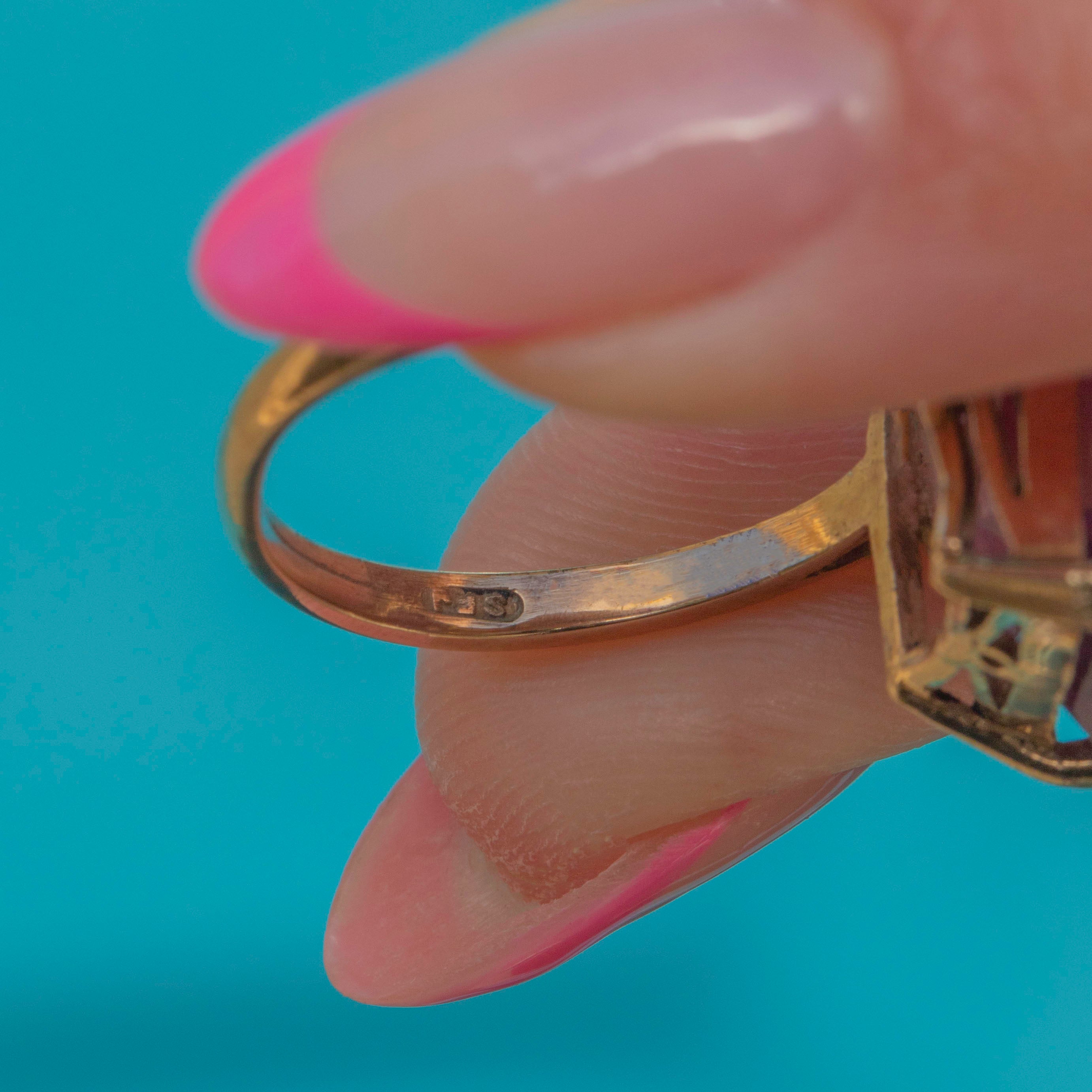 EXCELLENT: This 9ct Gold Amethyst cocktail ring is in excellent condition. The Amethyst is radiant and sits securely within her claws. There is some minor surface wear to Gold, though this is difficult to spot without a loupe. A gorgeous piece, this vintage Amethyst ring can be worn with confidence.