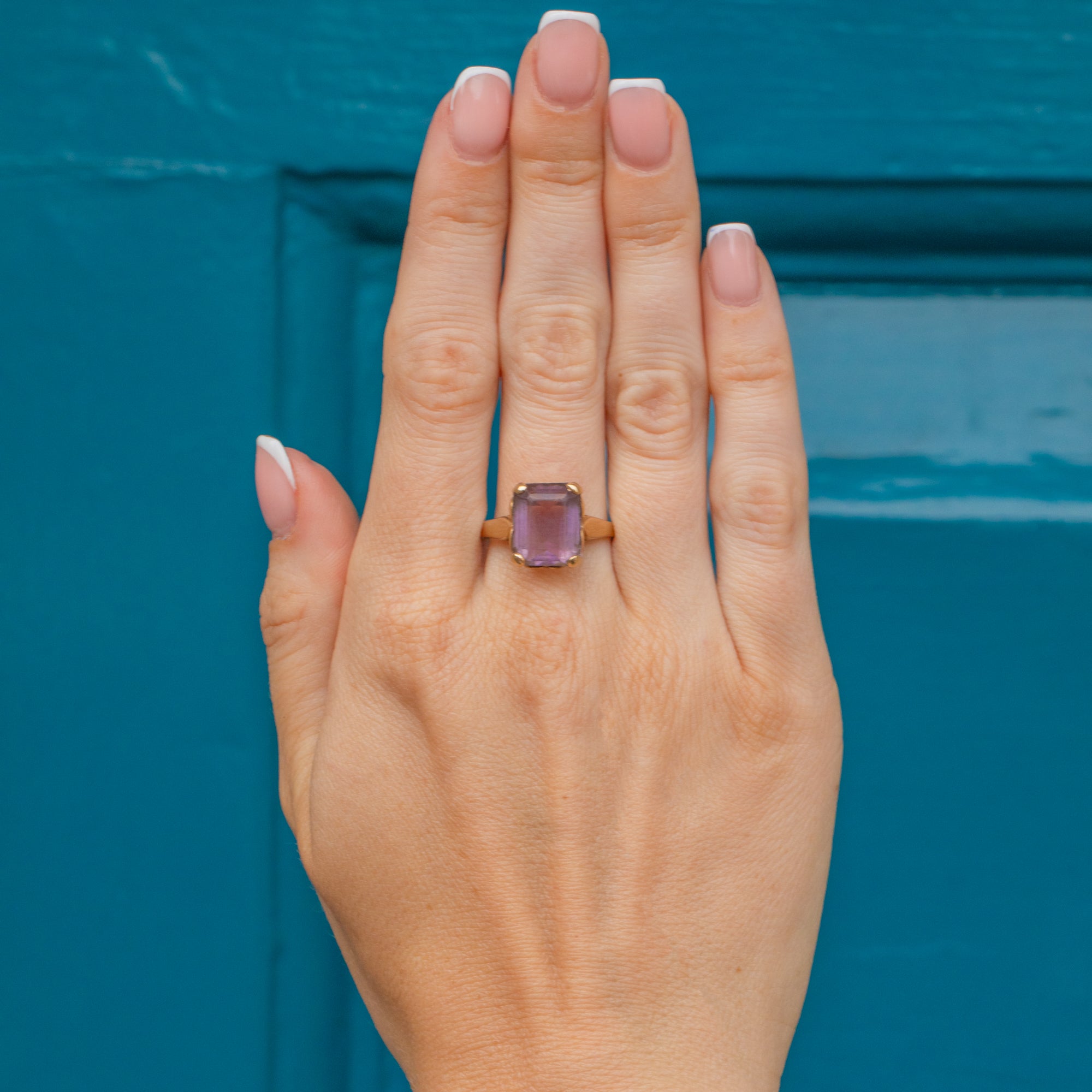 VERY GOOD. This 9ct Gold Amethyst cocktail ring is in very good condition. Securely set in her four claw settings, her Amethyst is rich in colour, with only slight surface wear commensurate with age. The 9ct Gold band has retained its shape well and flaunts a gorgeous honey hue throughout. She is the perfect vintage Amethyst ring to add a kick of colour to any attire.