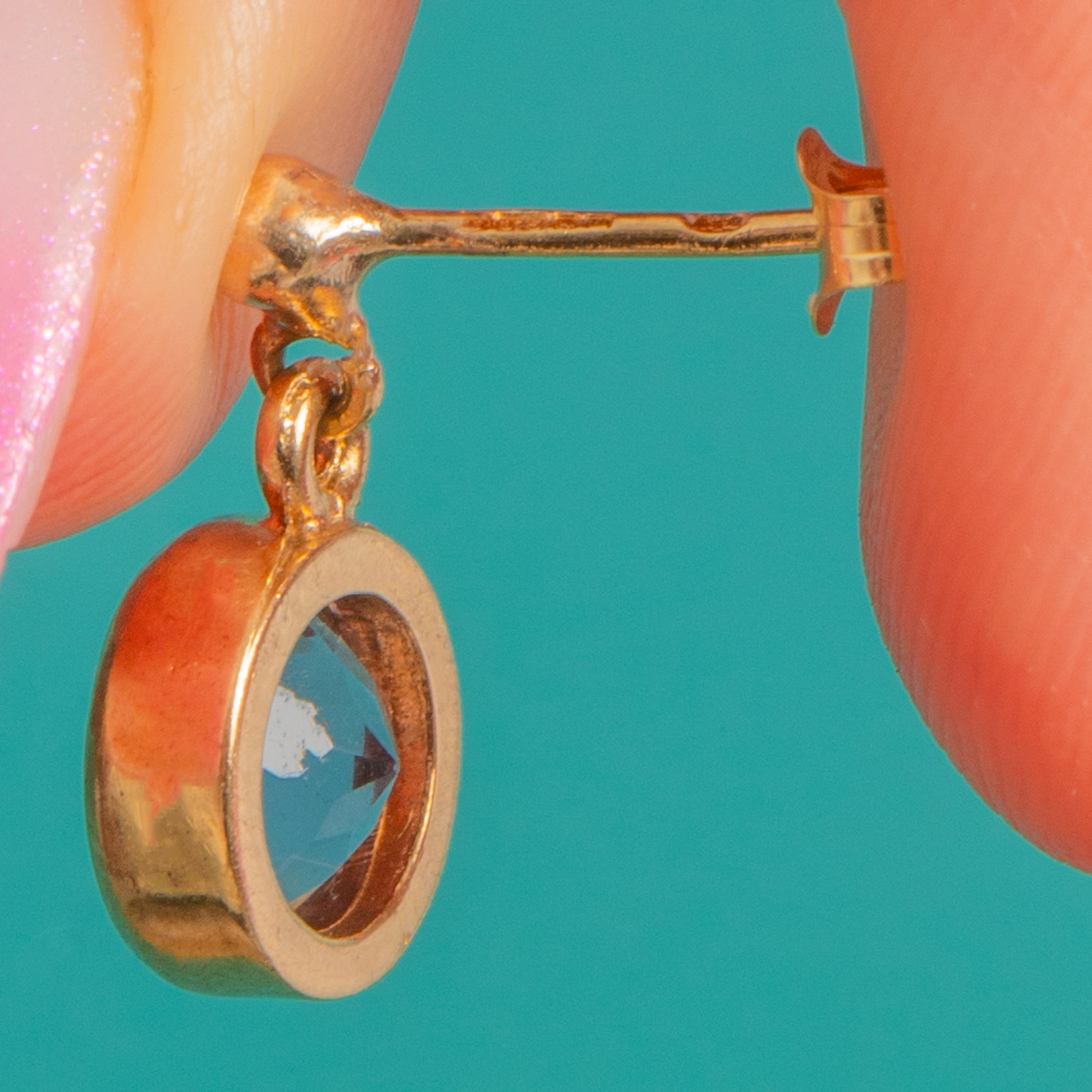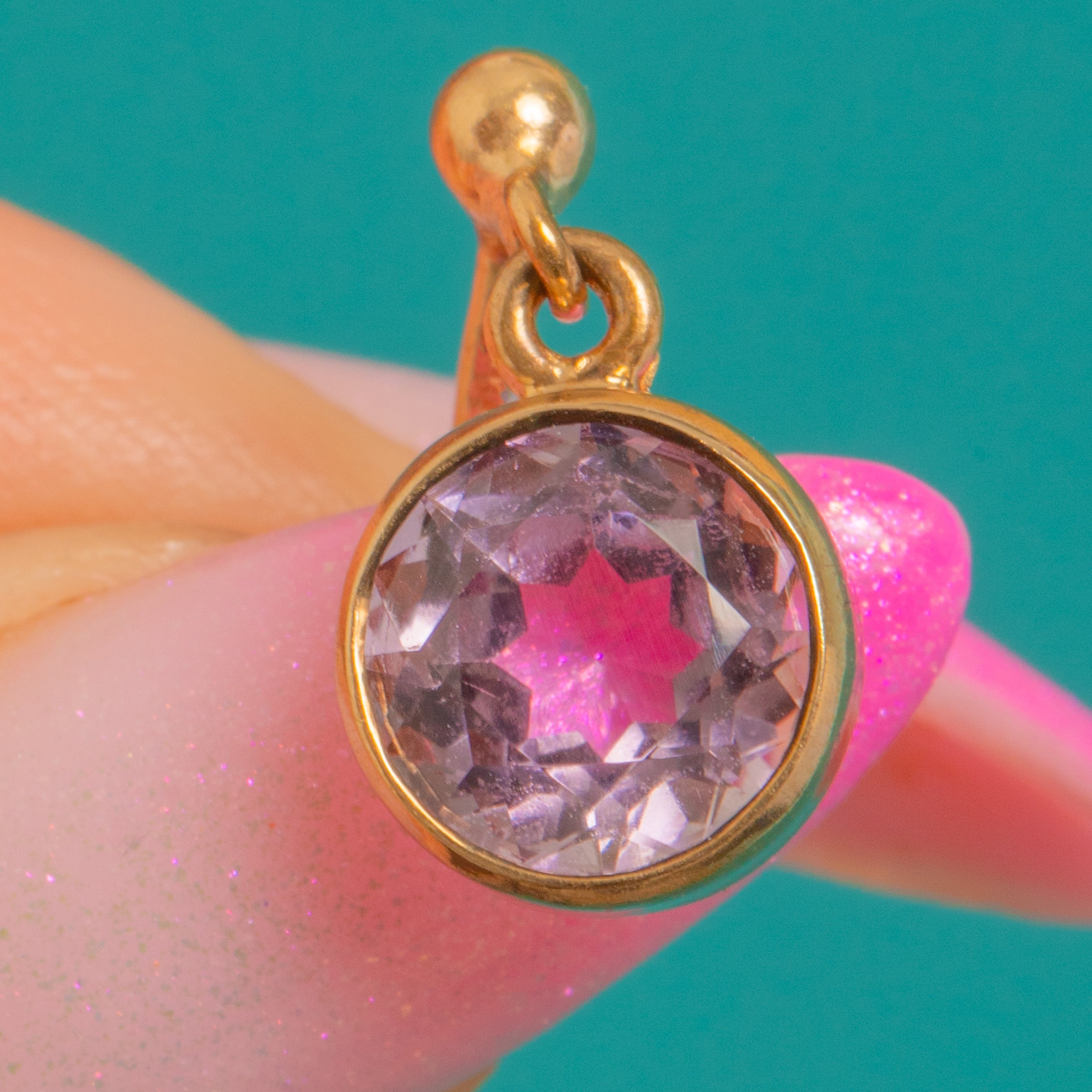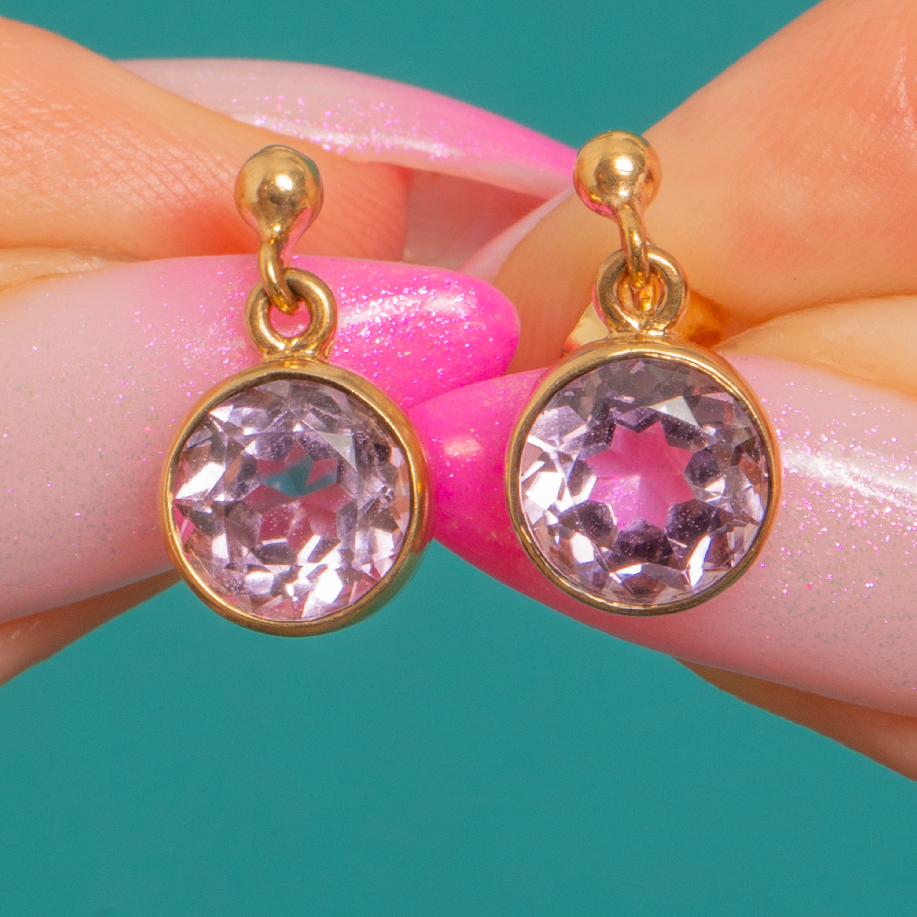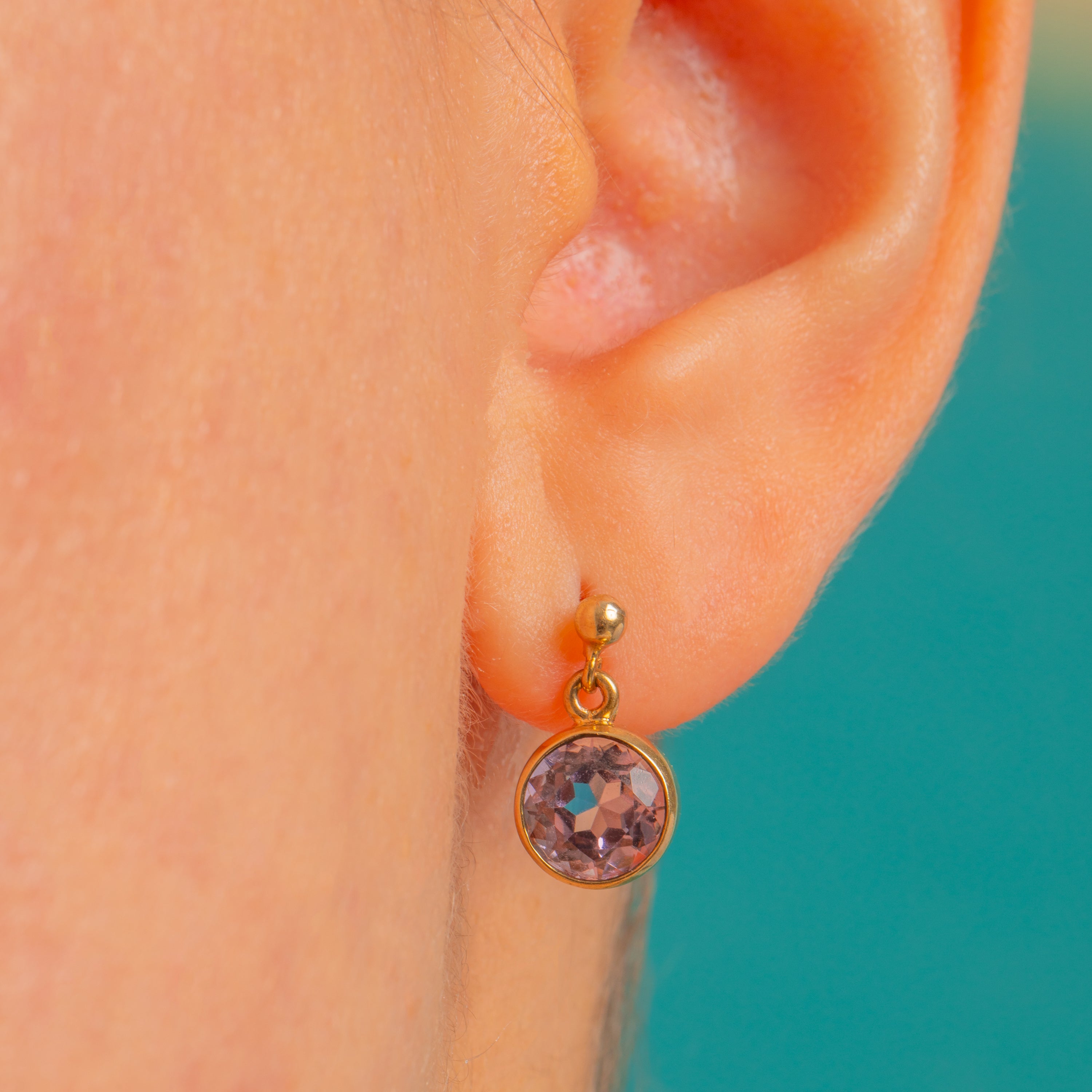 Understated and effortlessly elegant, these Vintage 9ct Gold drop stud earrings showcase round bezel-set Amethysts that dance gently beneath polished ball studs. The lilac gemstones glow with a soft brilliance, their smooth bezels giving a refined, contemporary finish that still nods to classic design.