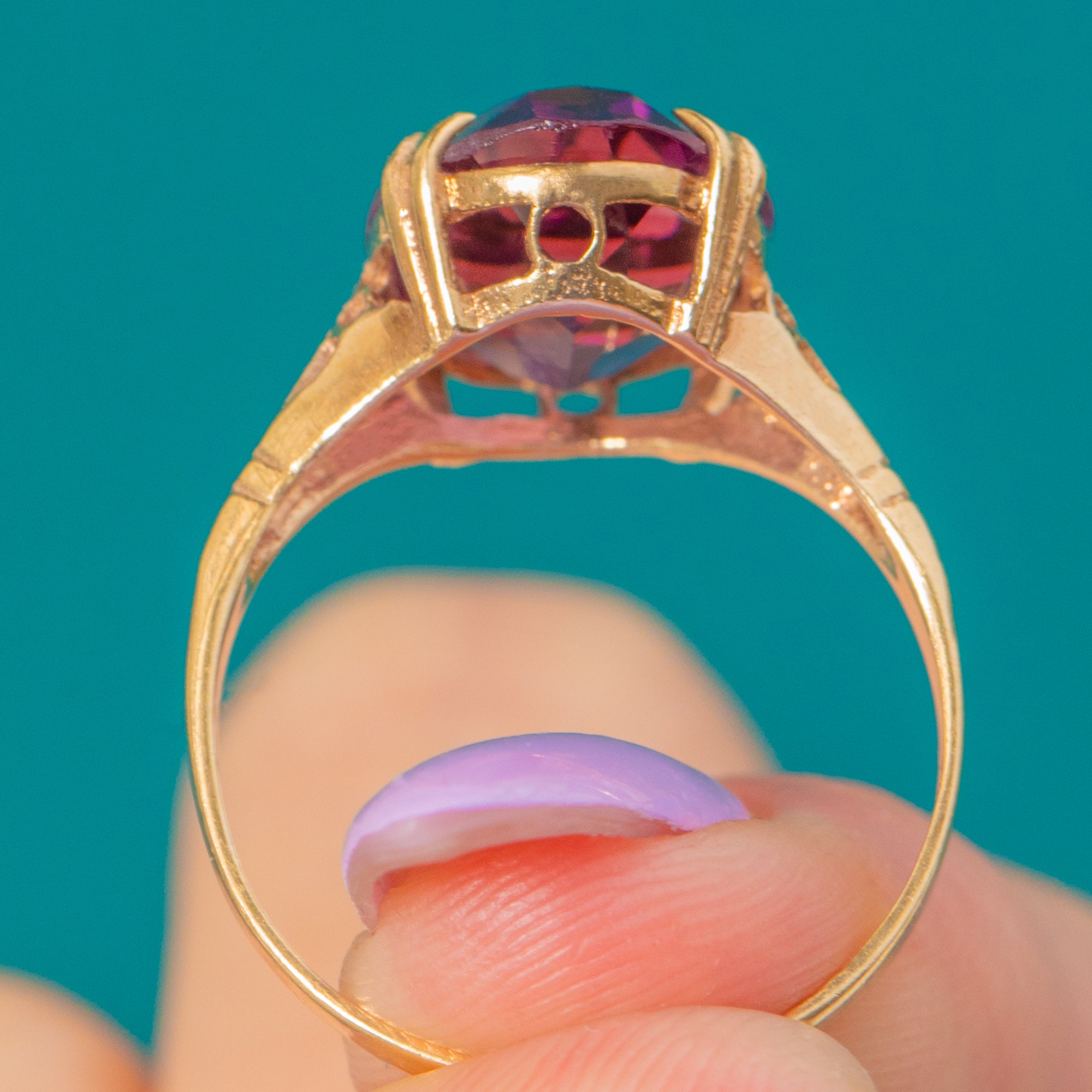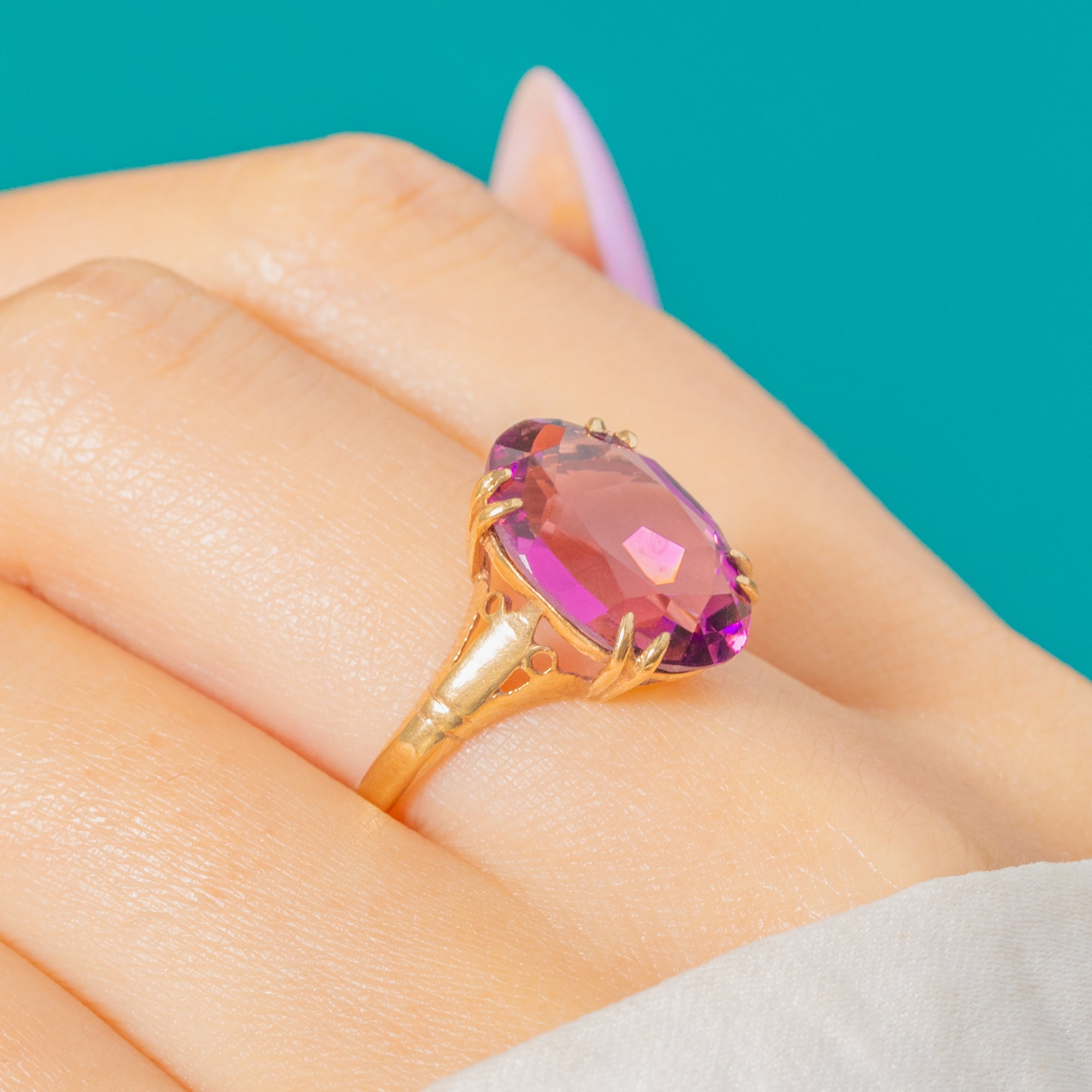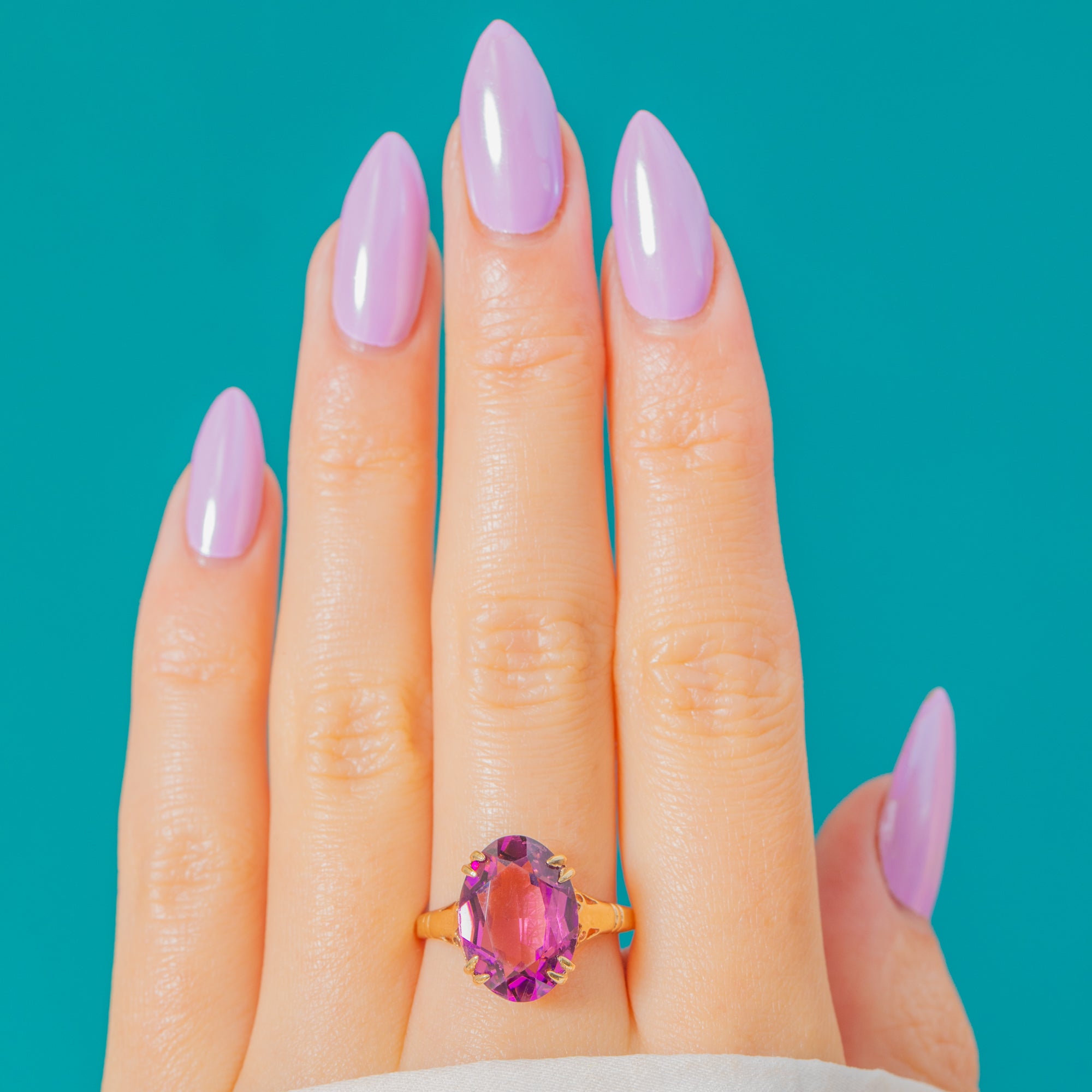 Bold, shimmering colour meets timeless elegance in this Mid-Century Vintage cocktail ring. A vibrant oval Amethyst Paste takes centre stage, lifted proudly in a high, multi-claw setting of warm 9ct Gold. The open gallery adds a whisper of geometric charm, while tapered shoulders keep the silhouette refined and balanced.
