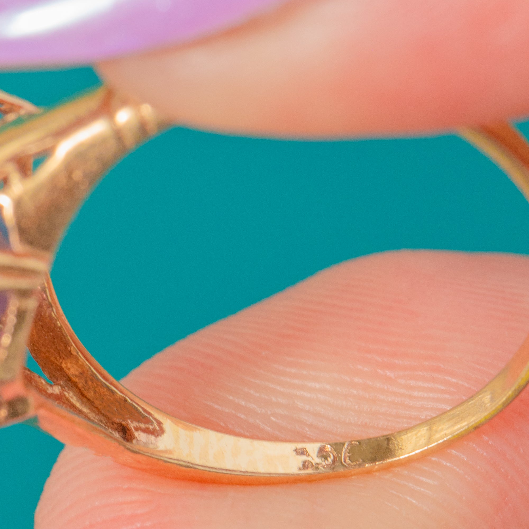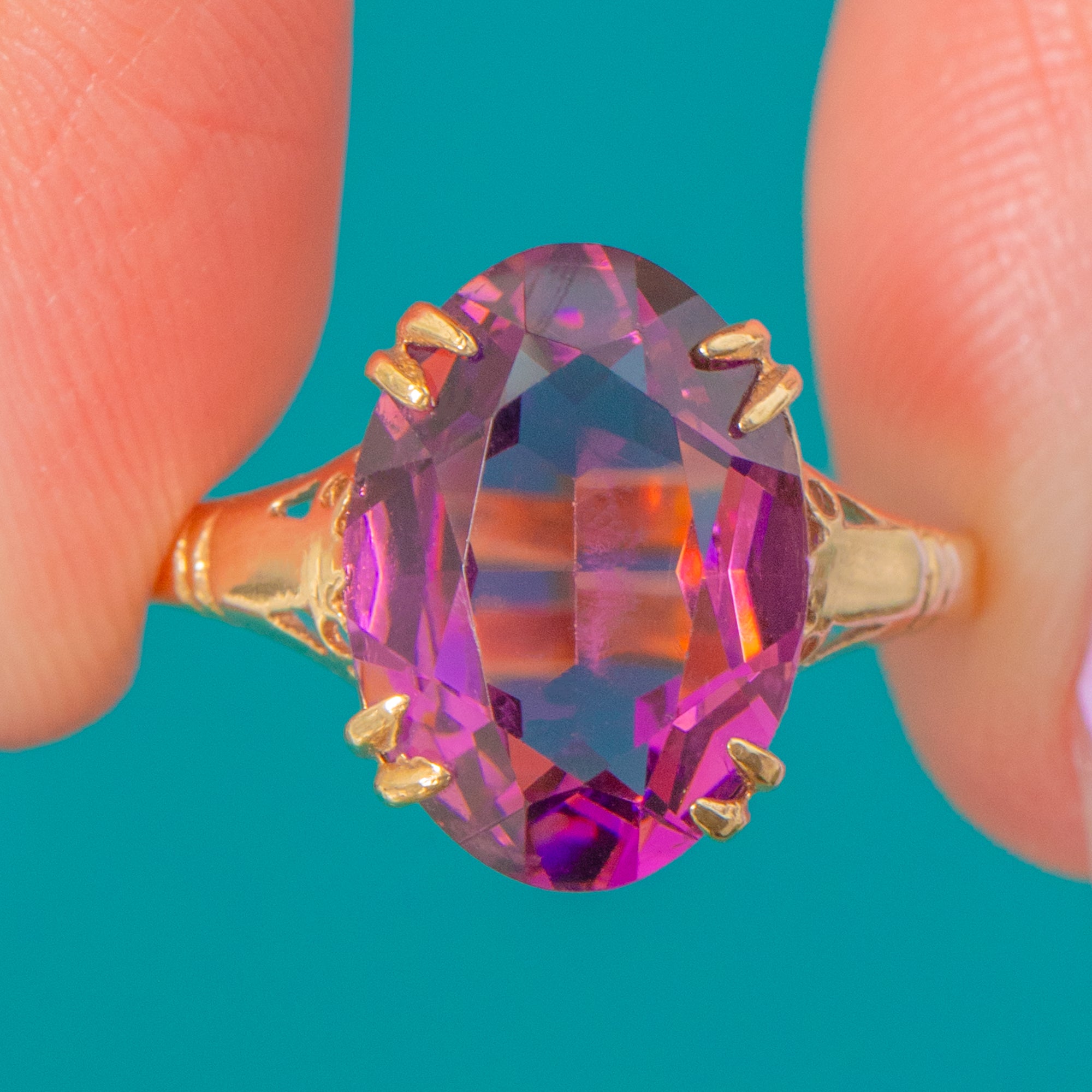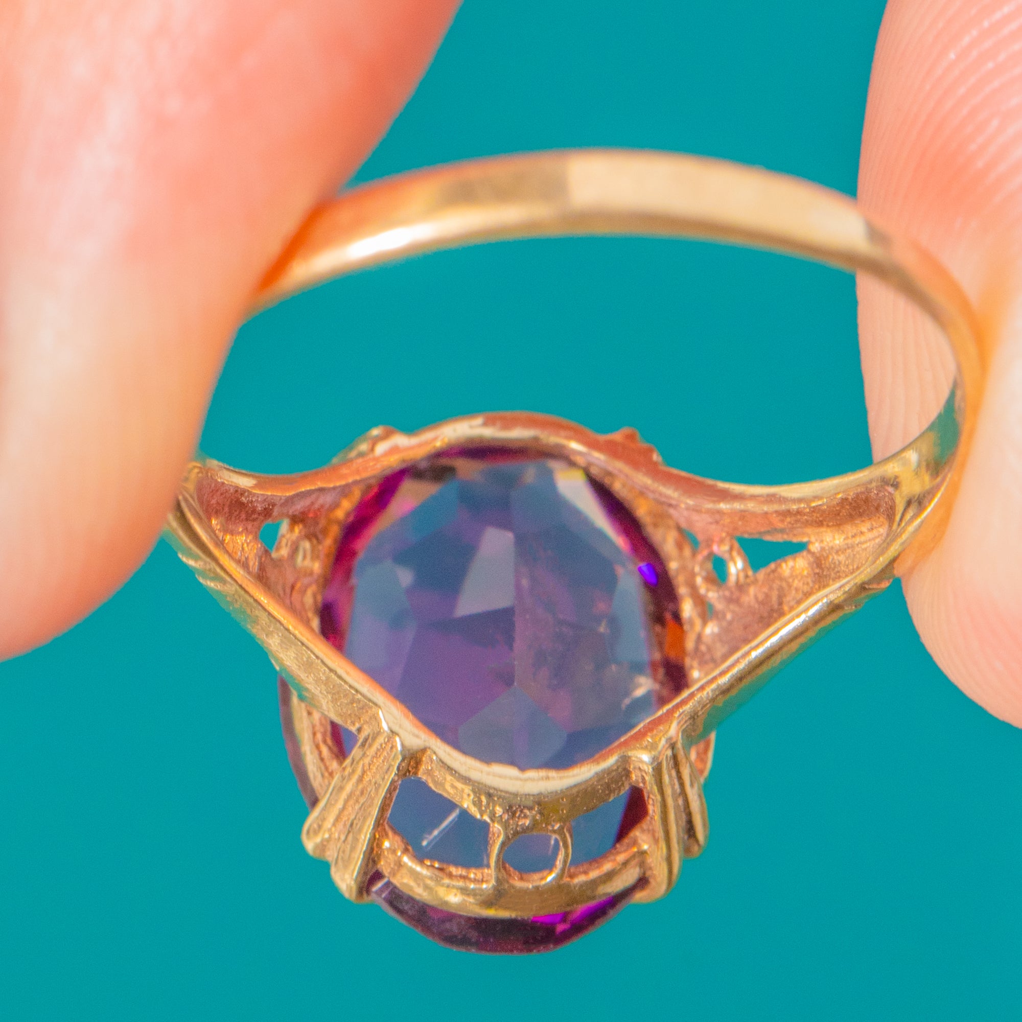 Bold, shimmering colour meets timeless elegance in this Mid-Century Vintage cocktail ring. A vibrant oval Amethyst Paste takes centre stage, lifted proudly in a high, multi-claw setting of warm 9ct Gold. The open gallery adds a whisper of geometric charm, while tapered shoulders keep the silhouette refined and balanced.
