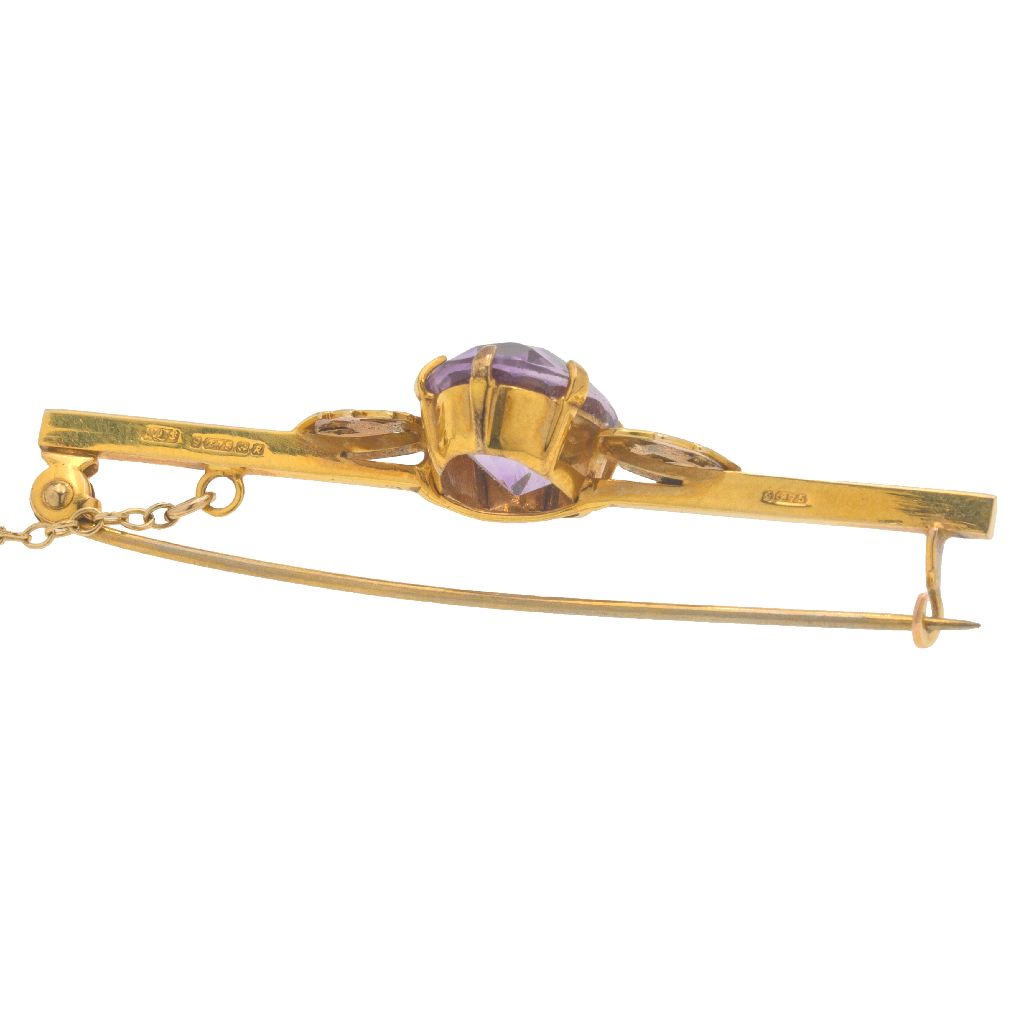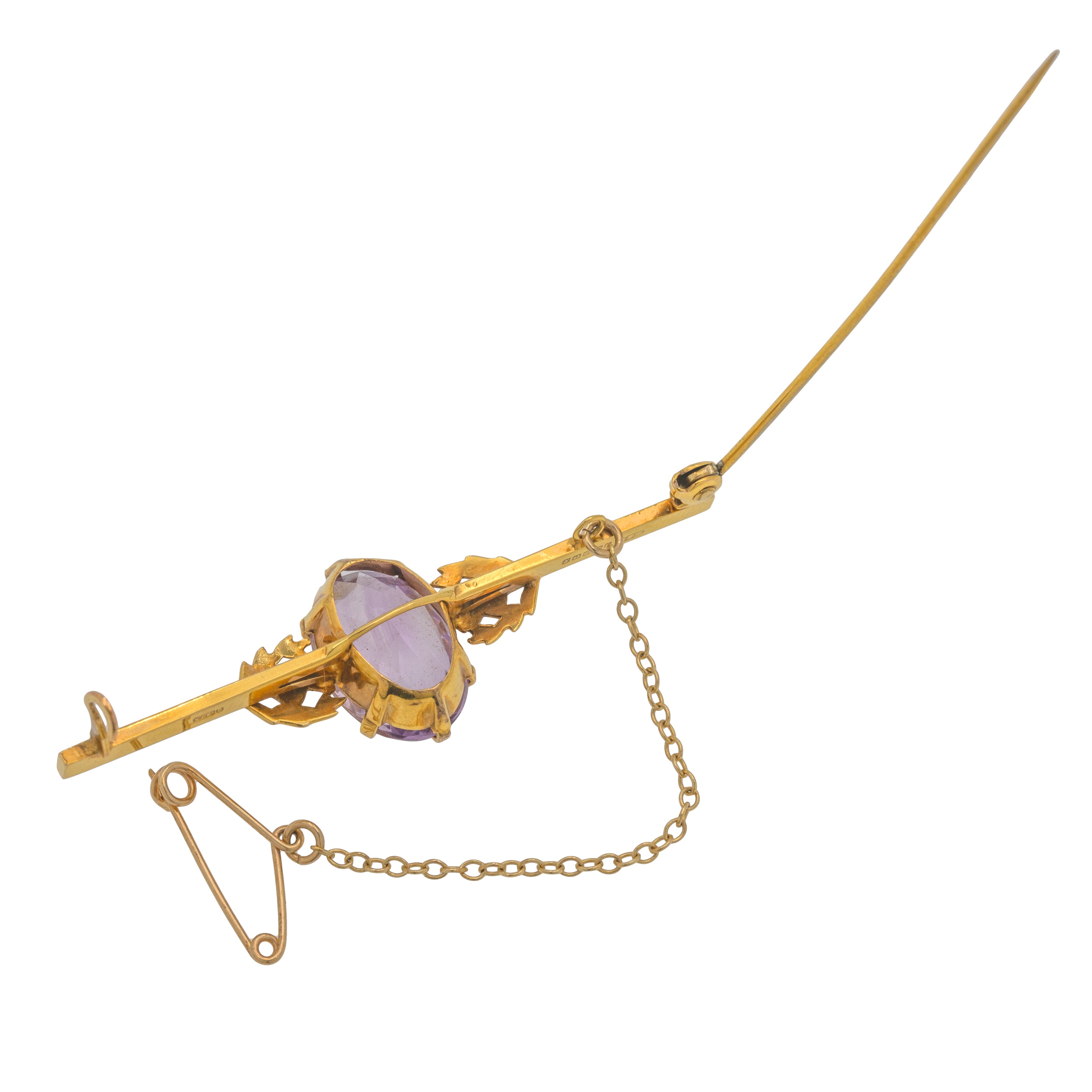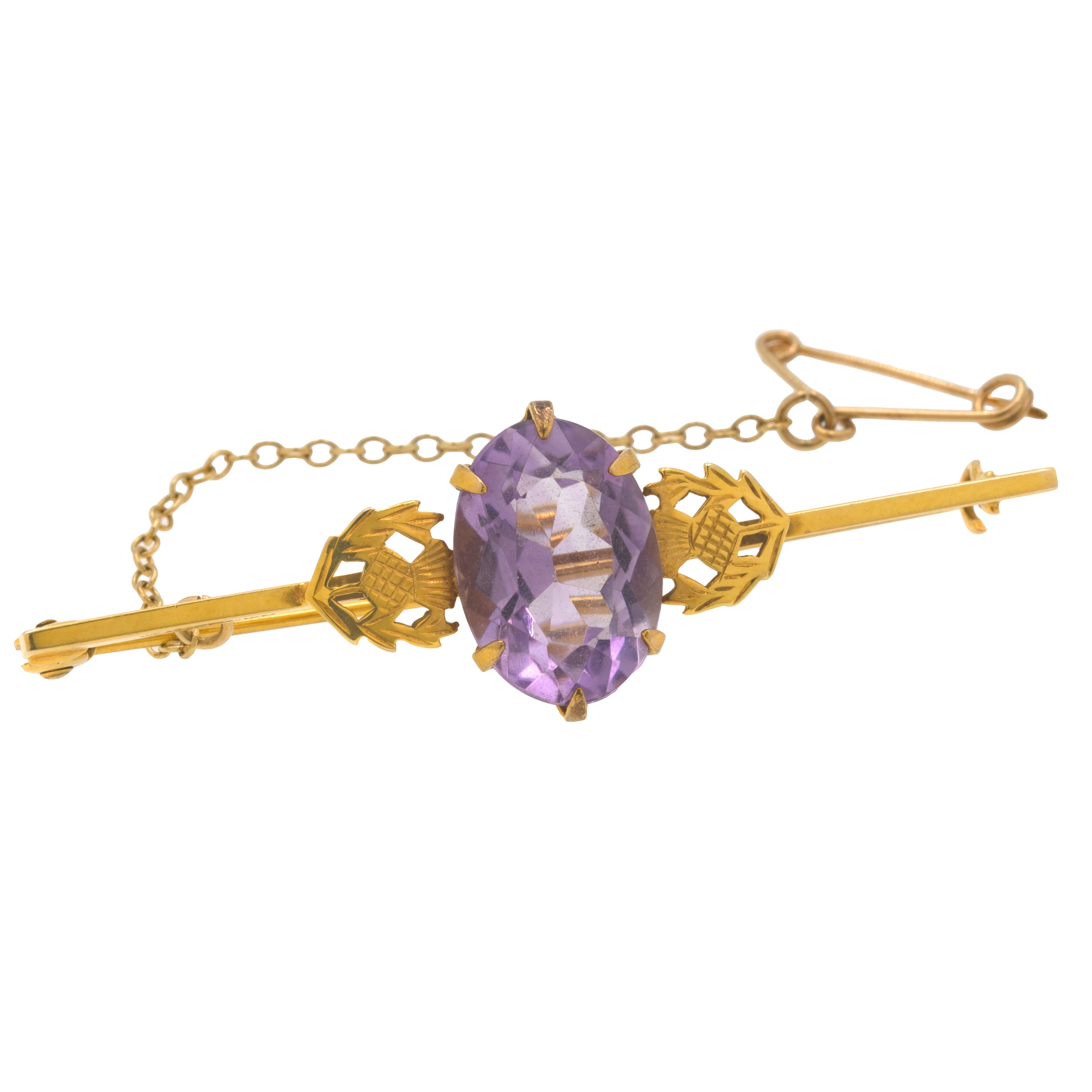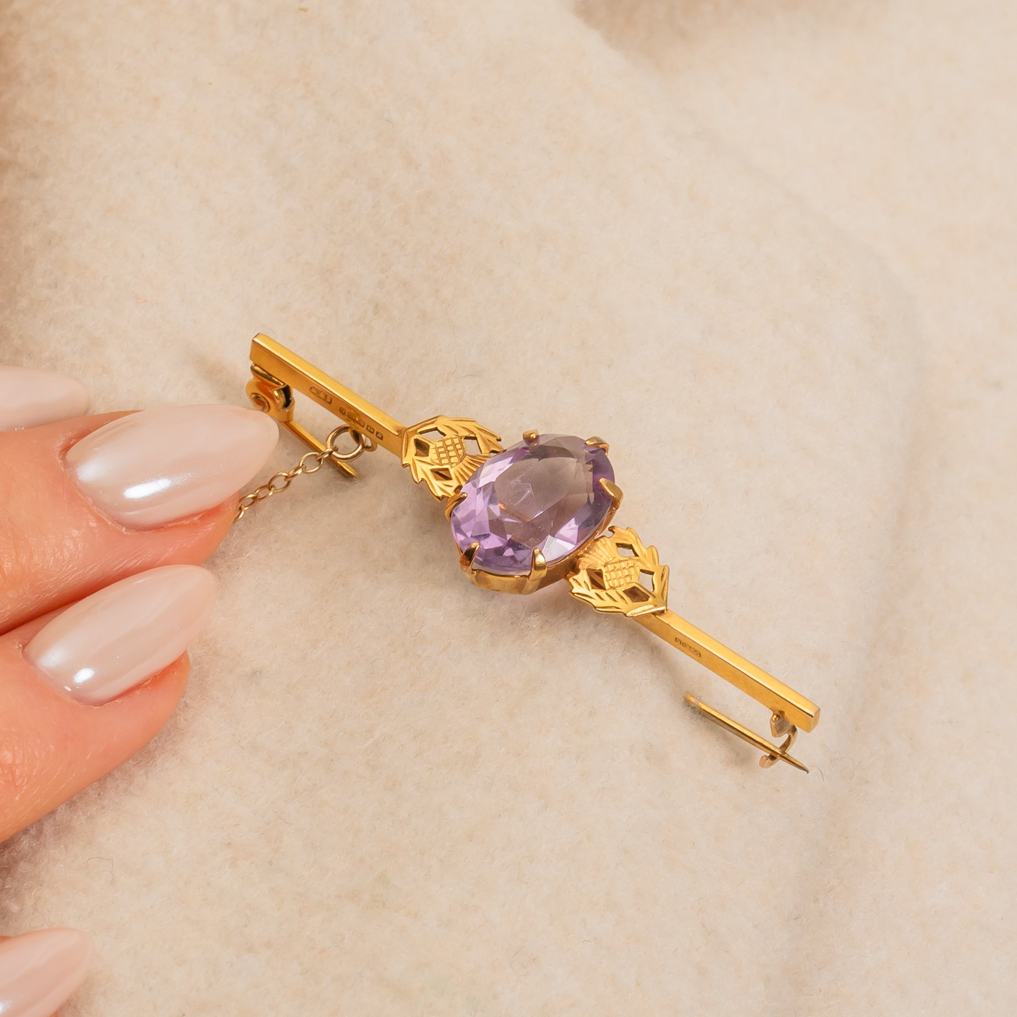 EXCELLENT. This 9ct Gold Amethyst Scottish thistle brooch is in excellent condition! The Amethyst sits secure in the claw settings and remains fabulously faceted. The thistle detailing are crisp, the brooch fitting is in perfect working order and with an added safety pin, this vintage brooch can be worn with confidence!