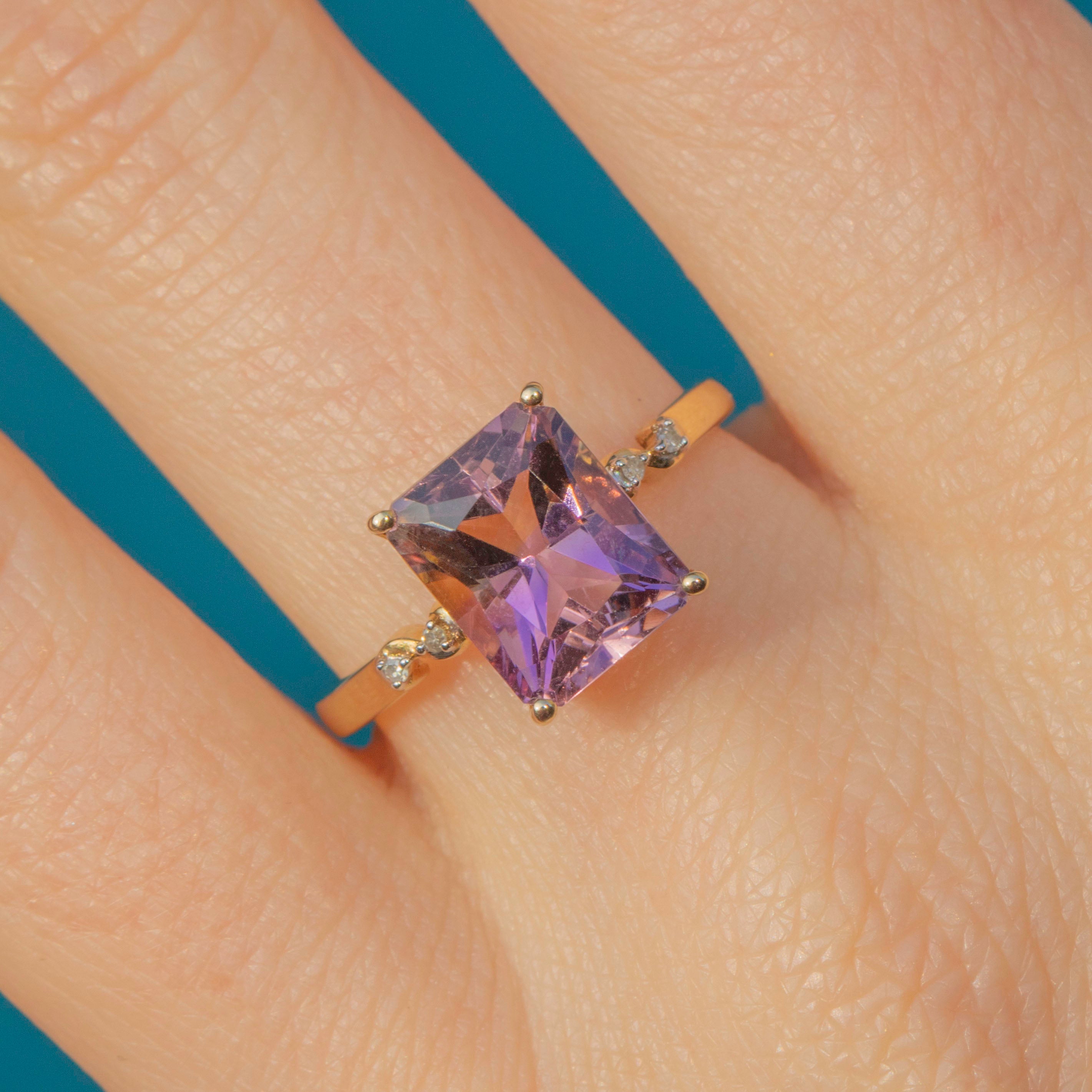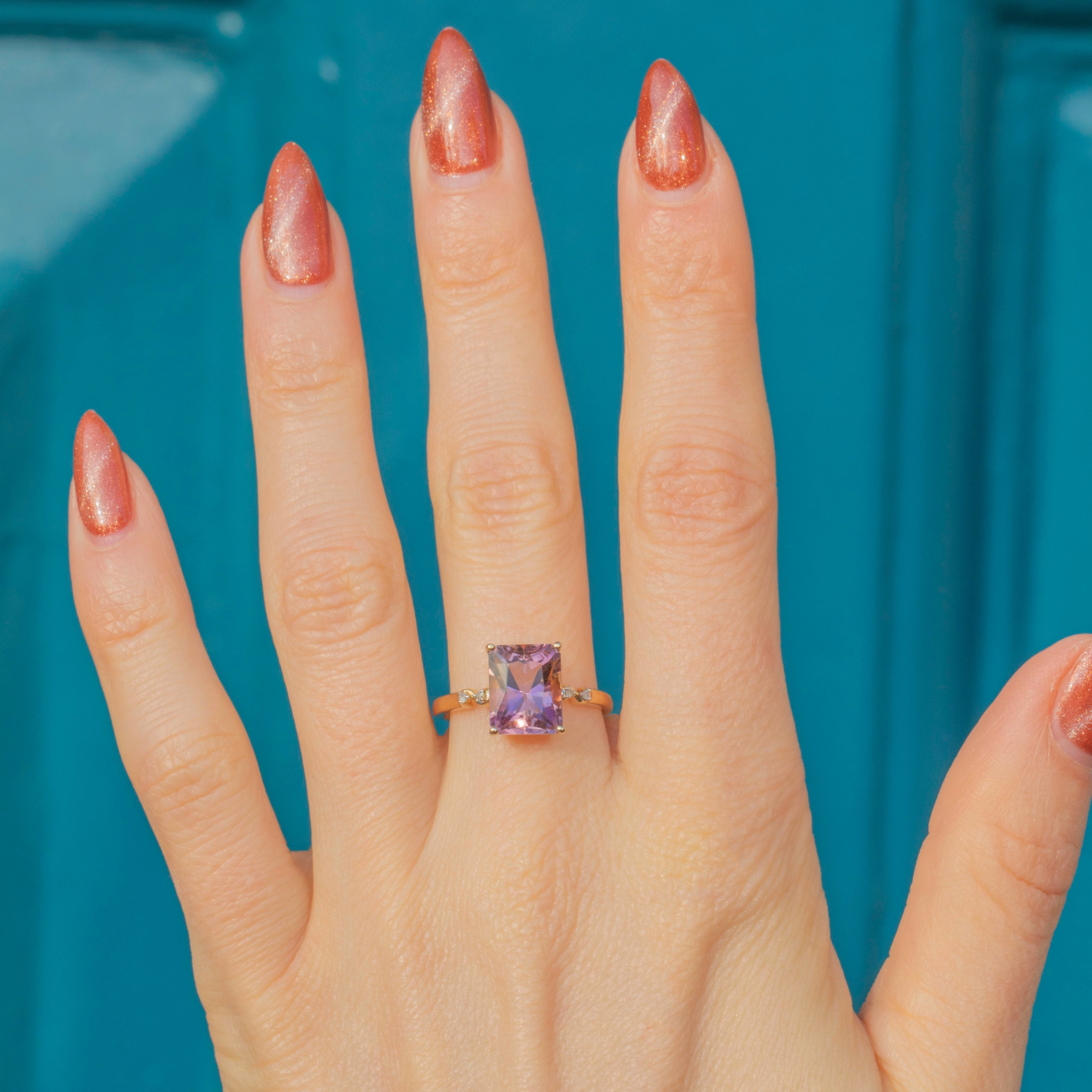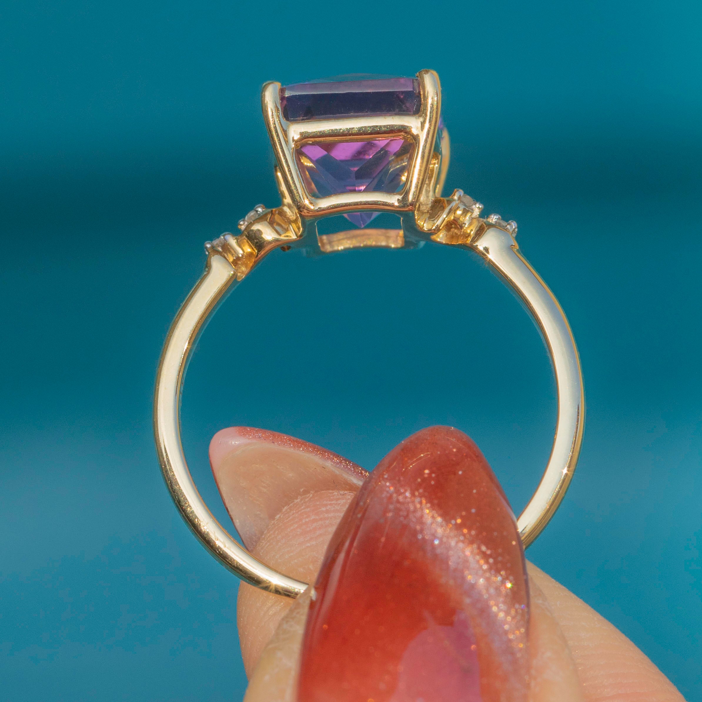 In her centre sits a bold, rectangular 0.60ct Ametrine, set within buttery 9ct Gold claw settings with a dramatic and glamorous profile. Ametrine is a variety of Quartz that contains both Amethyst and Citrine sectors within the same crystal, meaning that this gemstone radiates both gorgeous lilac and soft golden hues depending on how she catches the light.