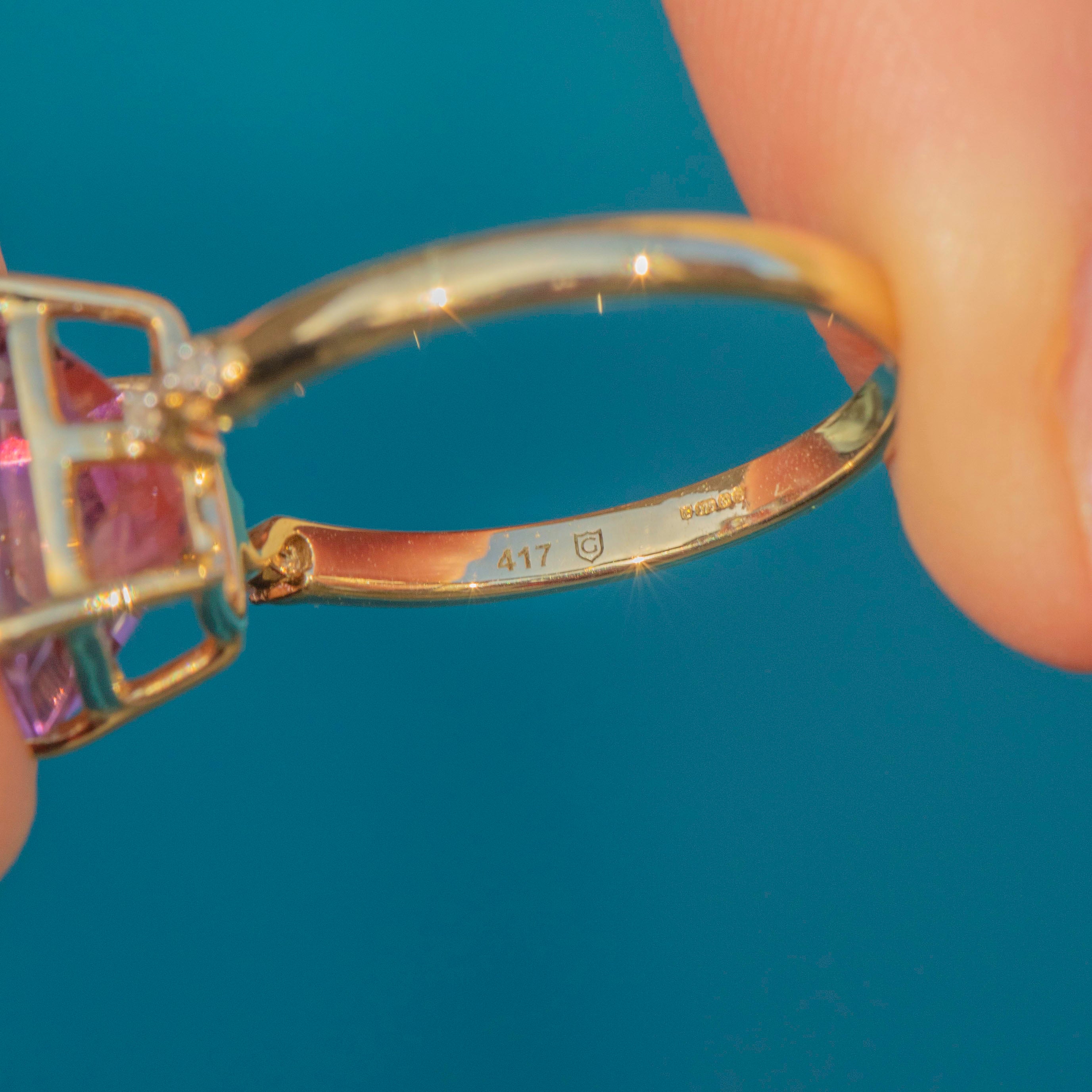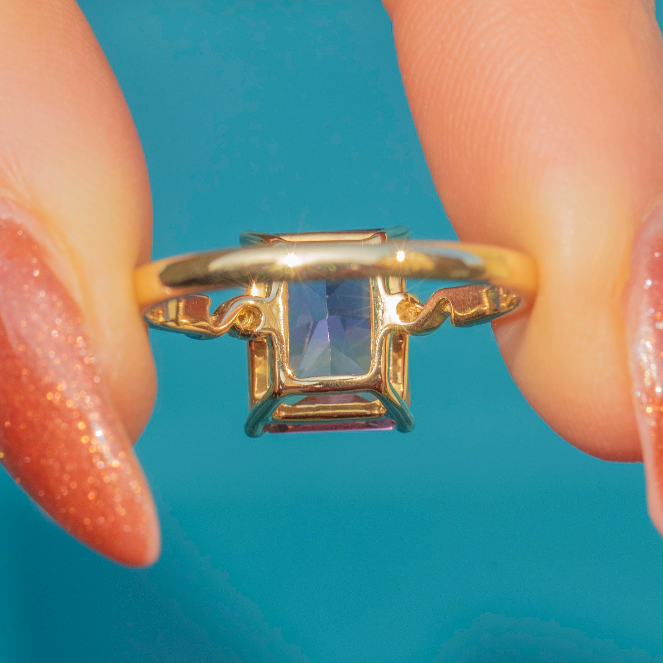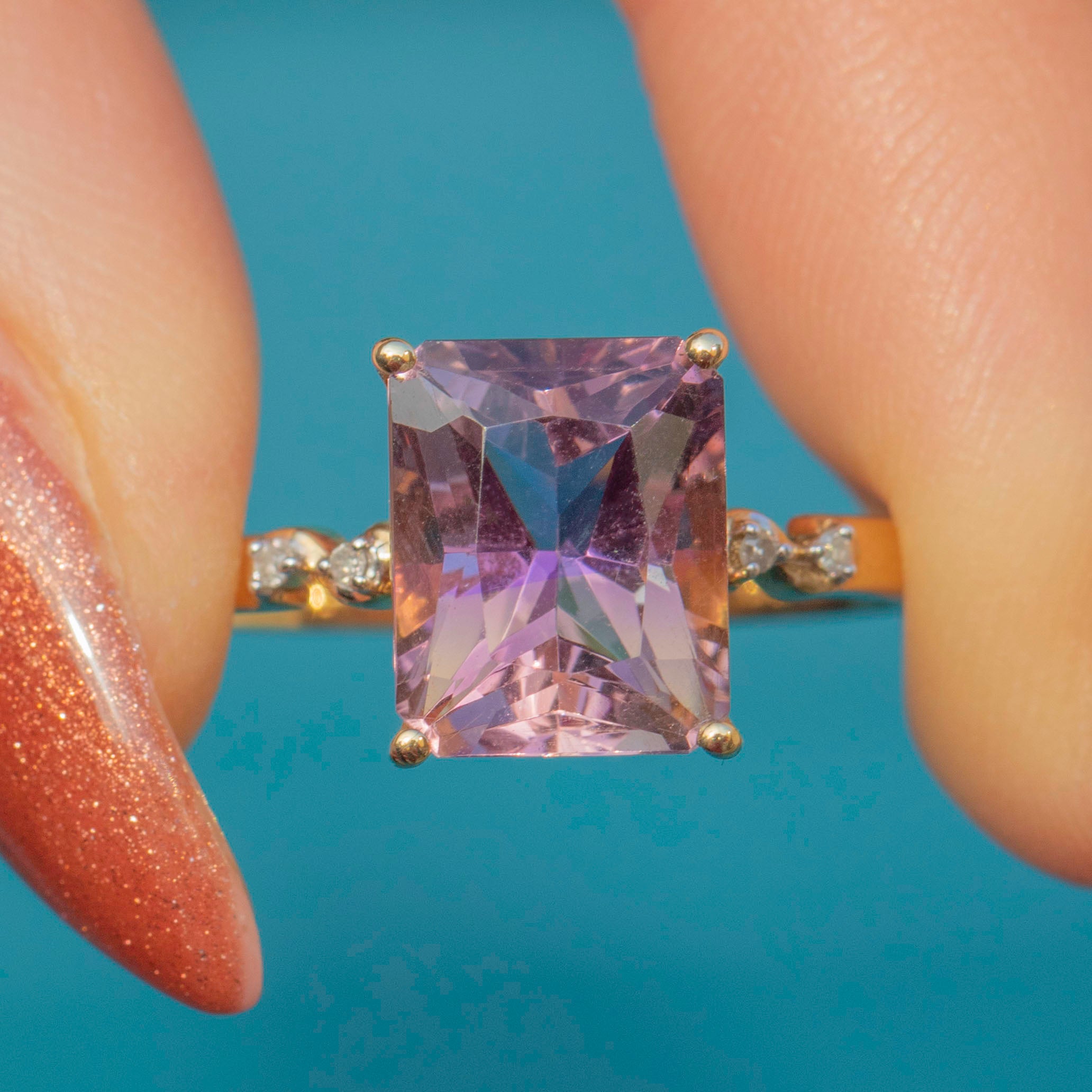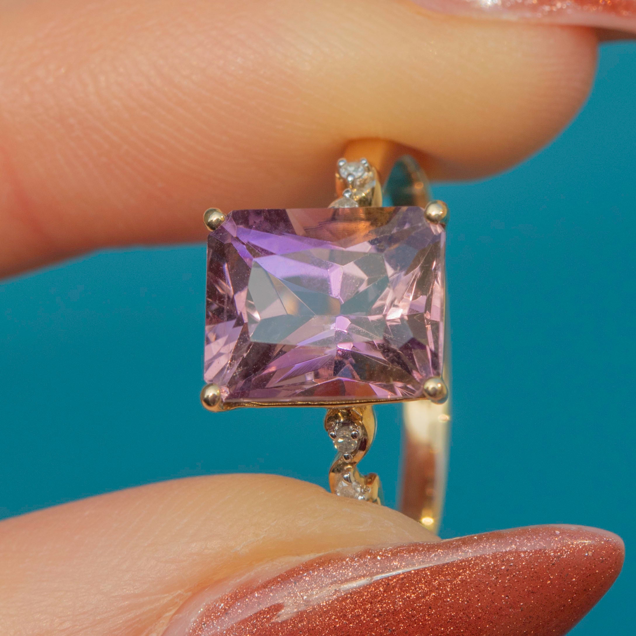 In her centre sits a bold, rectangular 0.60ct Ametrine, set within buttery 9ct Gold claw settings with a dramatic and glamorous profile. Ametrine is a variety of Quartz that contains both Amethyst and Citrine sectors within the same crystal, meaning that this gemstone radiates both gorgeous lilac and soft golden hues depending on how she catches the light.