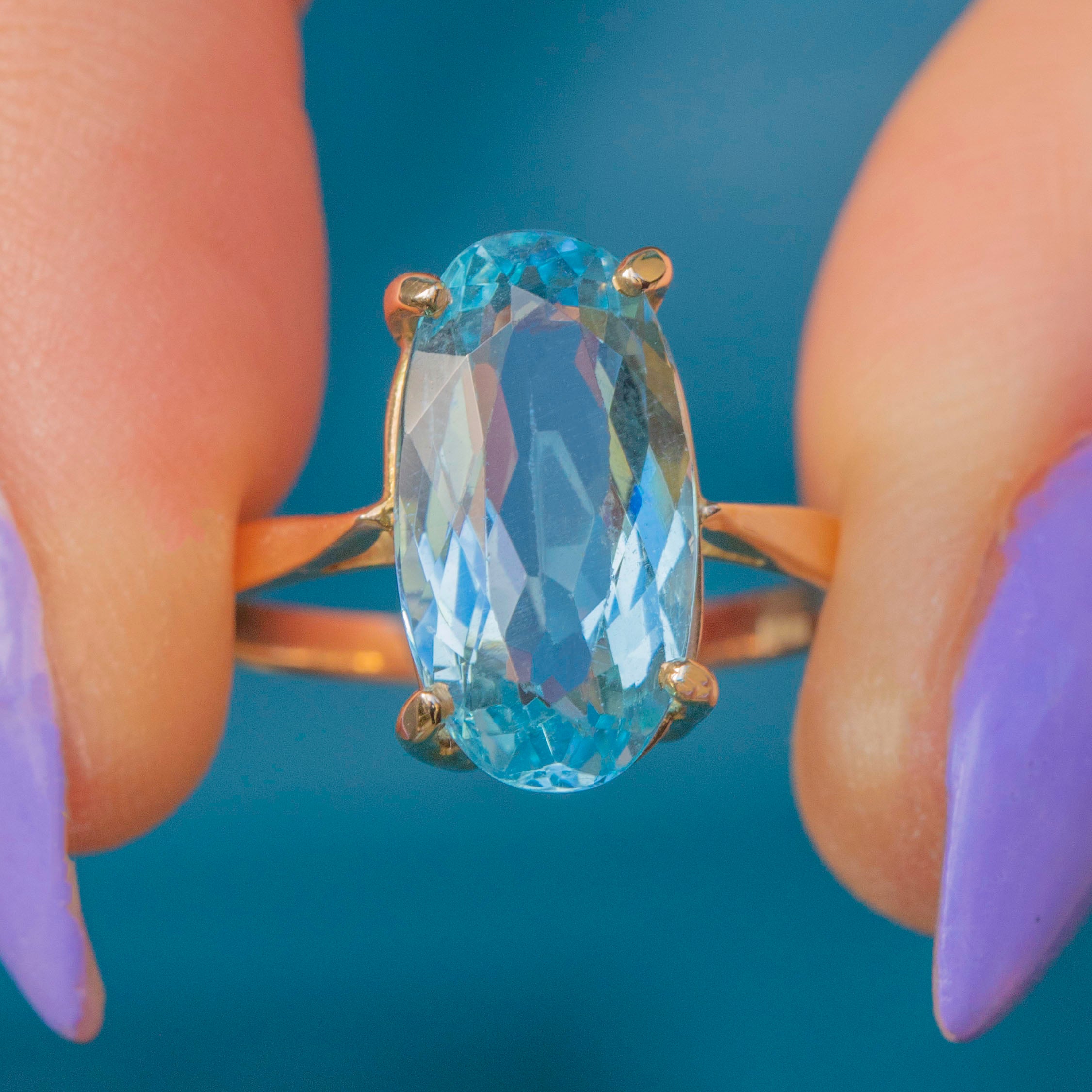 This exquisite 9ct Gold Aquamarine oval solitaire ring exudes elegance and sophistication. The 3.30ct Aquamarine is akin to a pool of icy water, with the facets shimmering and changing with the light, flashing with deep azure and turquoise undertones.