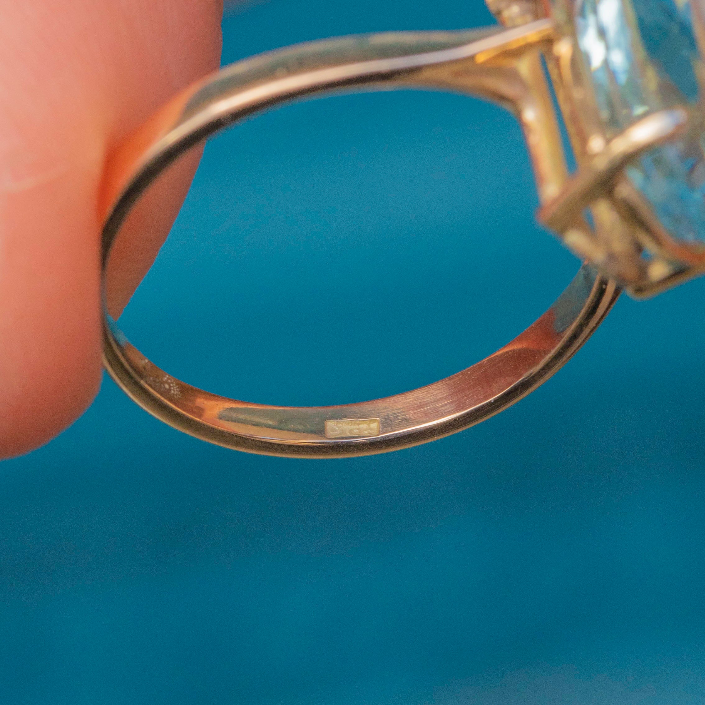 EXCELLENT - VERY GOOD: This 9ct Gold Aquamarine oval solitaire ring is in excellent condition with no signs of wear. The Aquamarine is securely set, with only very mild wear to the Gold band, commensurate with age. This is a beautifully preserved piece!