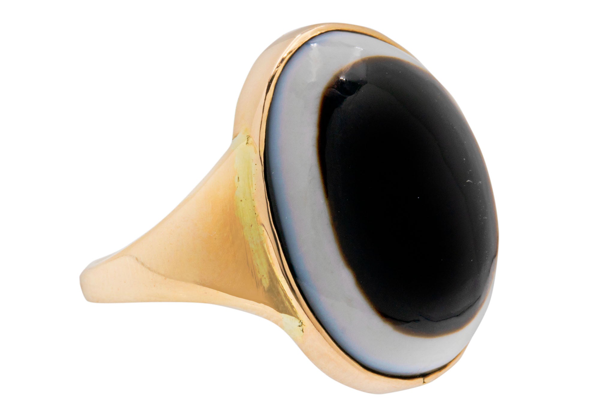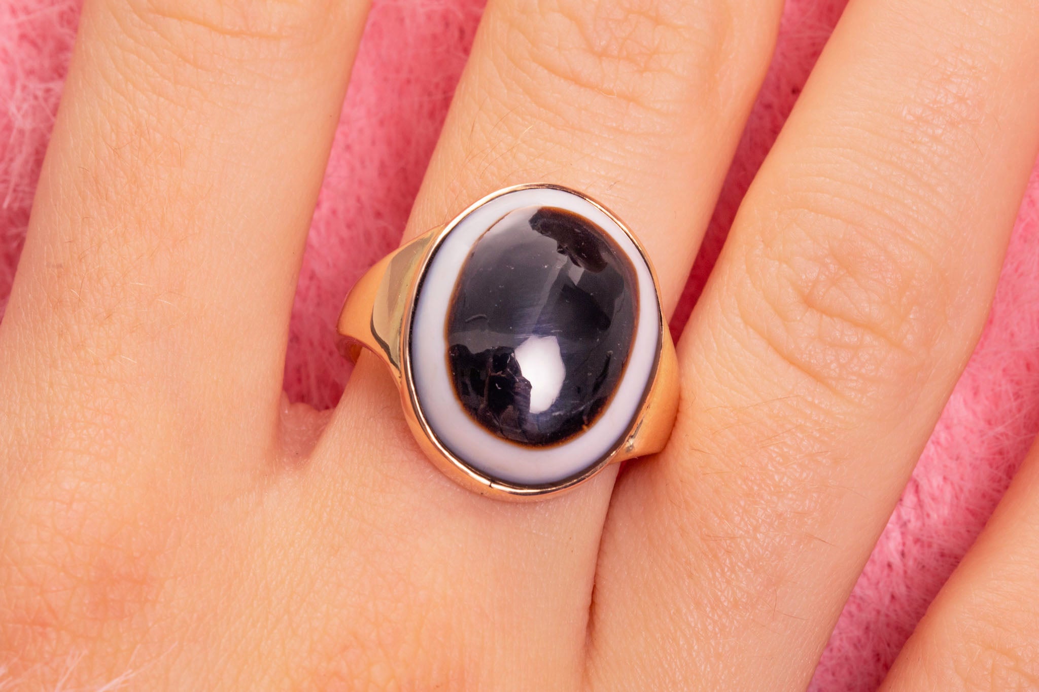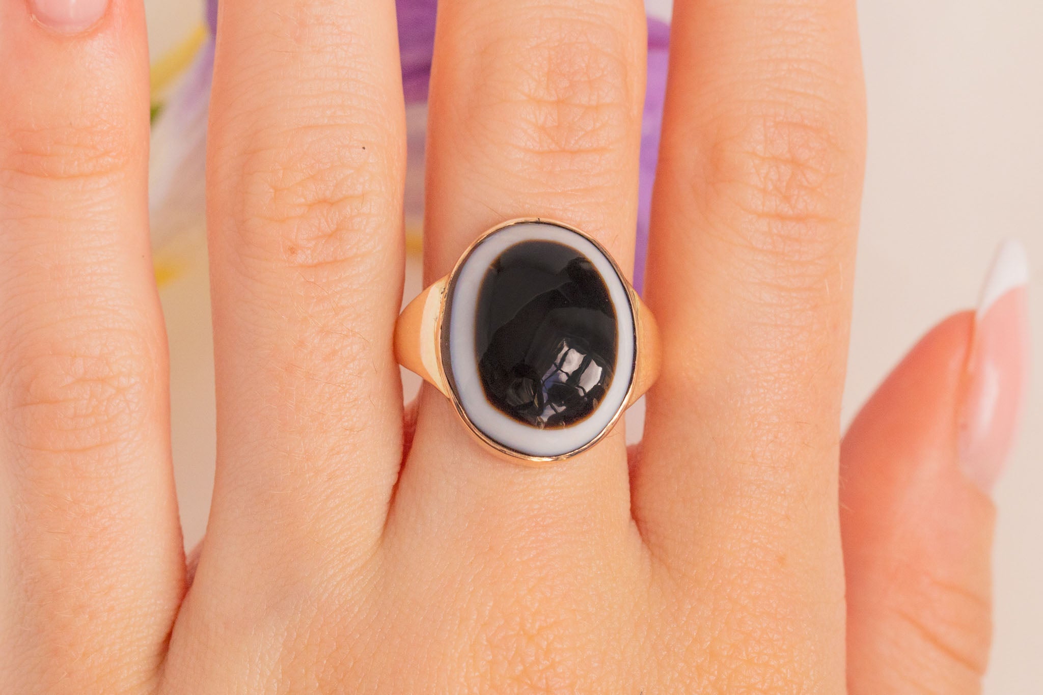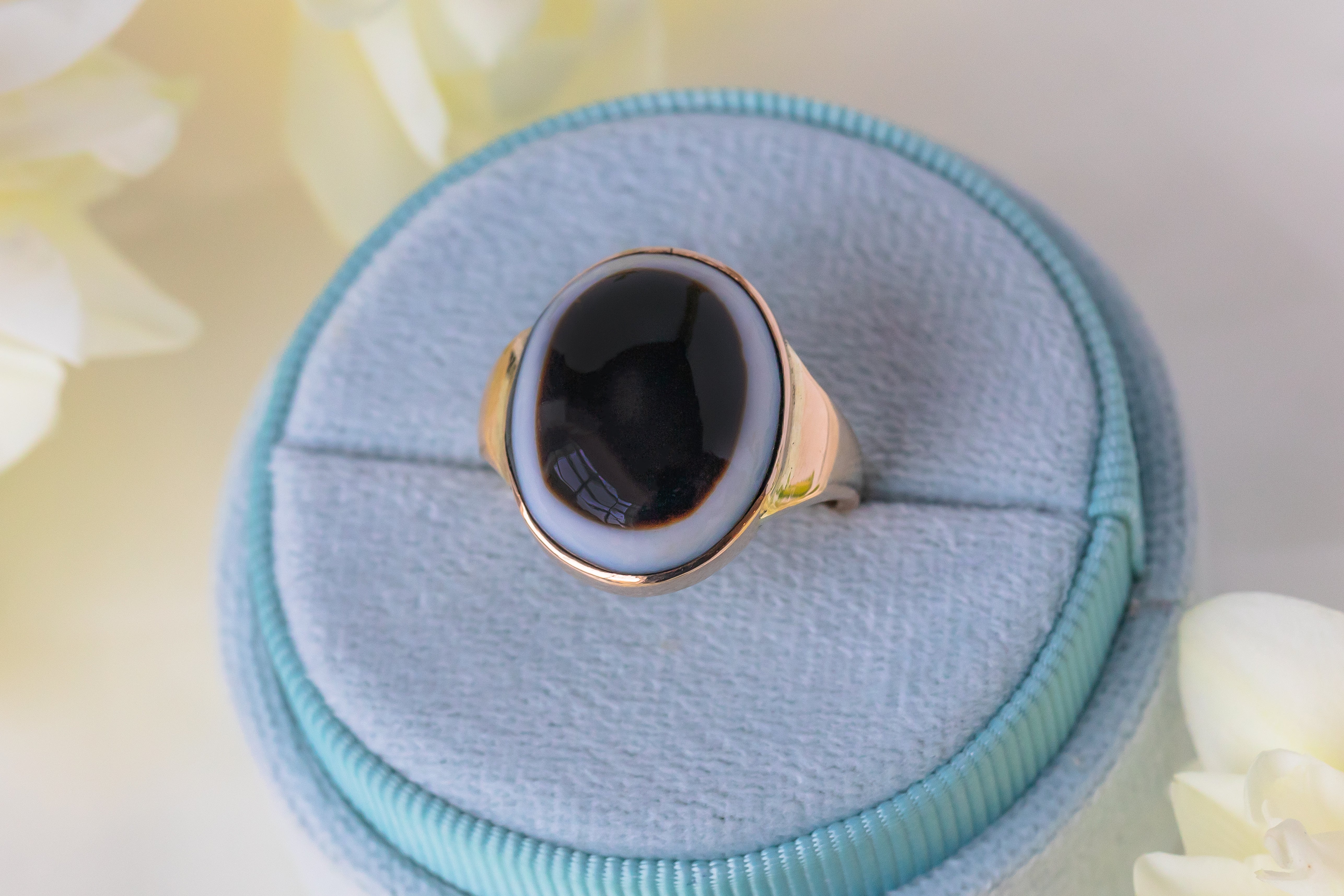 We adore this antique 9ct Gold banded Agate ring! You won't be able to resist becoming enchanted by her Agate's pool of inky hues, haloed by an ivory stream oozing from her smooth cabochon cut.