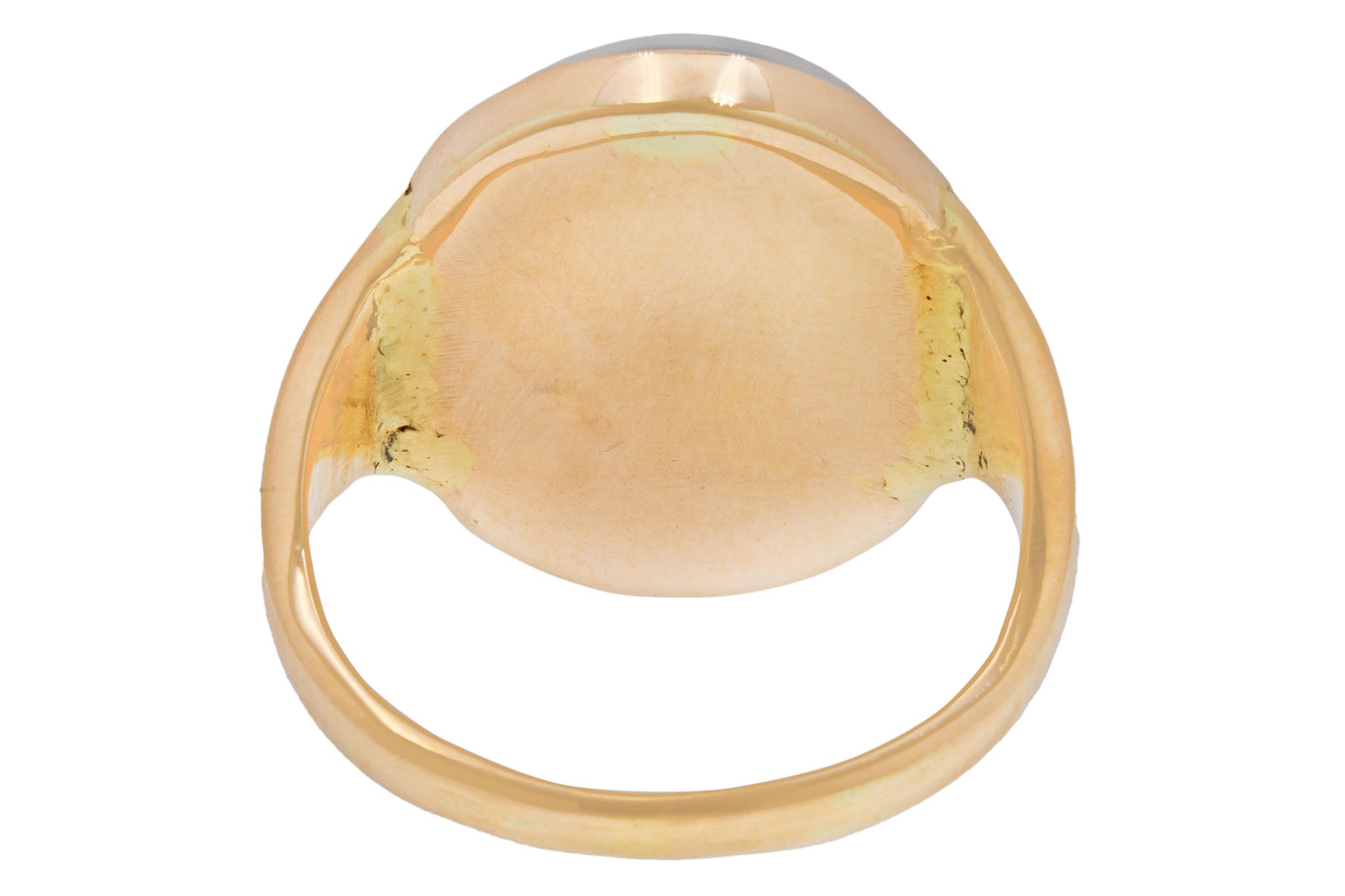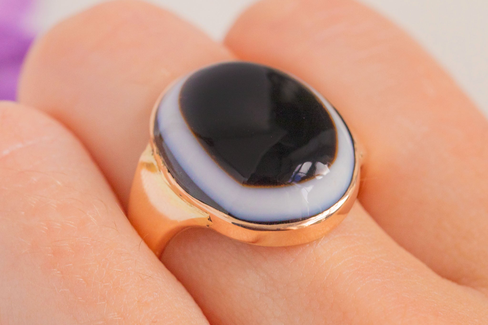 GOOD-VERY GOOD. This antique 9ct Gold banded Agate ring is in great condition! Her banded Agate is smooth to the touch and free from any chips, and has lovely bold colour palette. There is an area of the setting that has slightly worn, which can be seen by one of the shoulders, however, the rest remains intact and securely holds the stone in place. Please note that the ring shank is not completely round and is a later addition to the Agate itself, but the blushed 9ct Gold marries perfectly against the bezel setting, so much so that you would think she's original. This Victorian Gold ring is sure to make your antique collection pop!