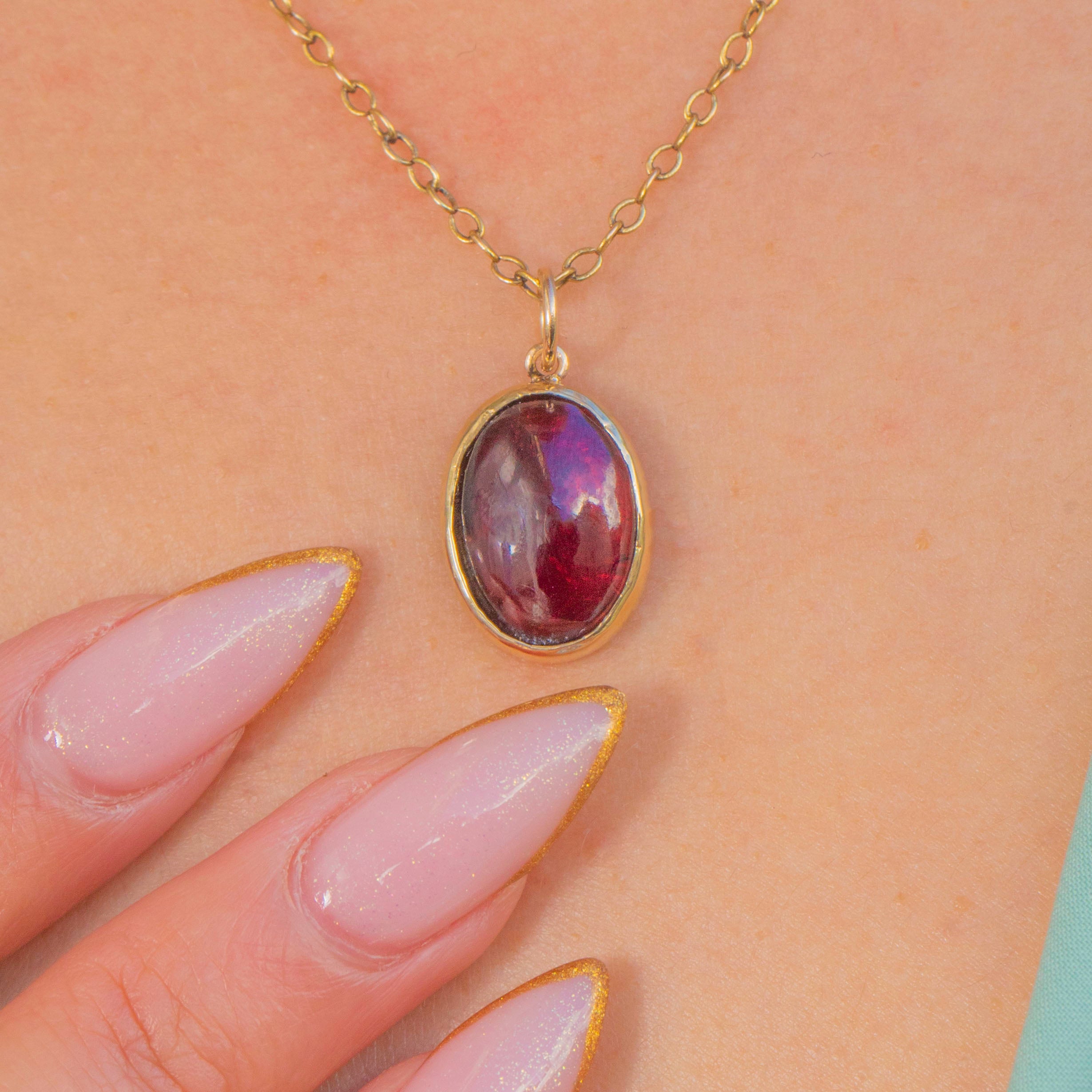 This vintage 9ct Gold charm showcases a luscious Garnet cabochon in rich shades of berry-red, magenta and plum. Beautifully domed with a glossy finish, the cabochon glows with depth and warmth, catching the light with every movement.