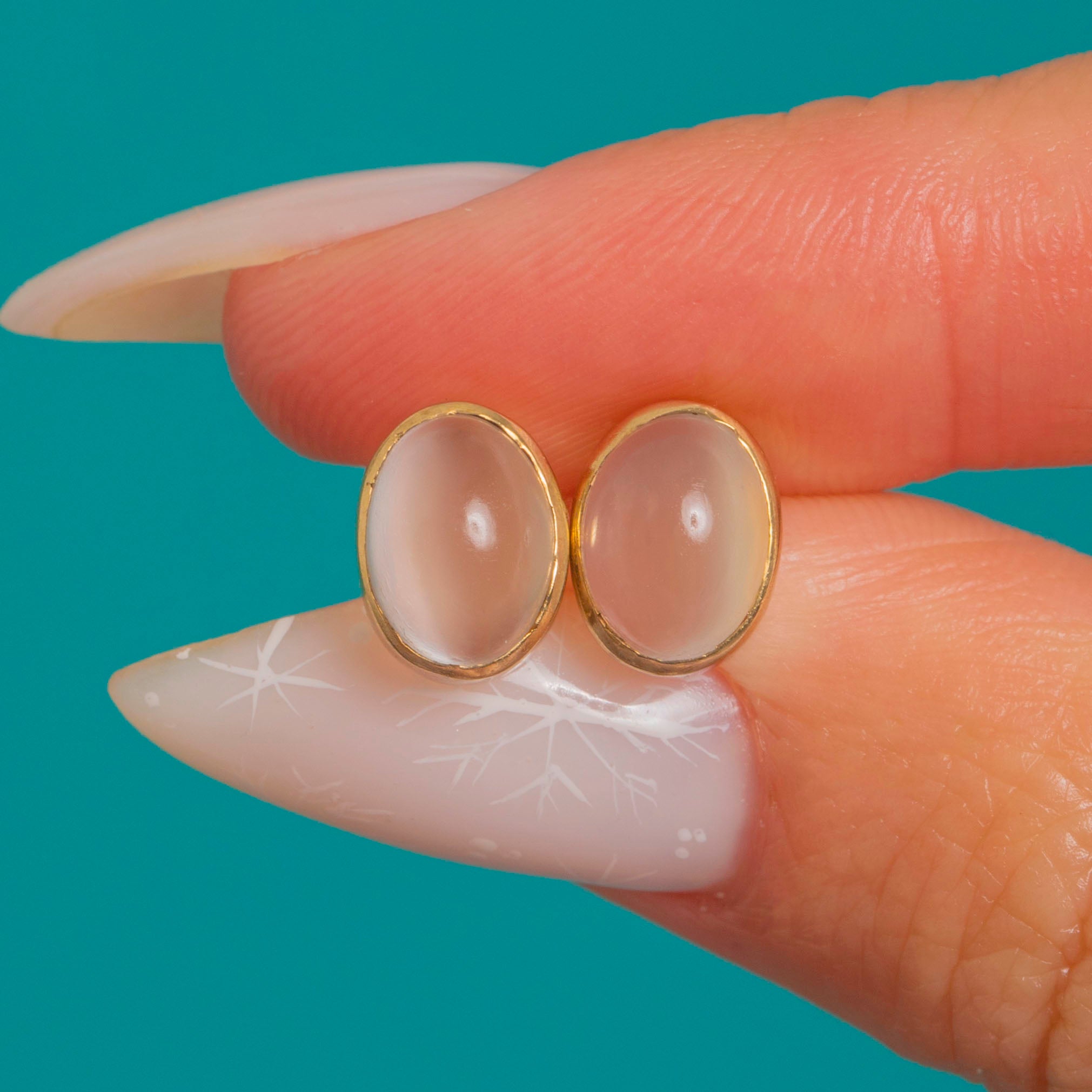A beautifully understated pair of Vintage Moonstone stud earrings, each bezel-set in warm 9ct Gold. The oval cabochons display that unmistakable Cat’s Eye glow, catching the light with a soft, silken sheen.