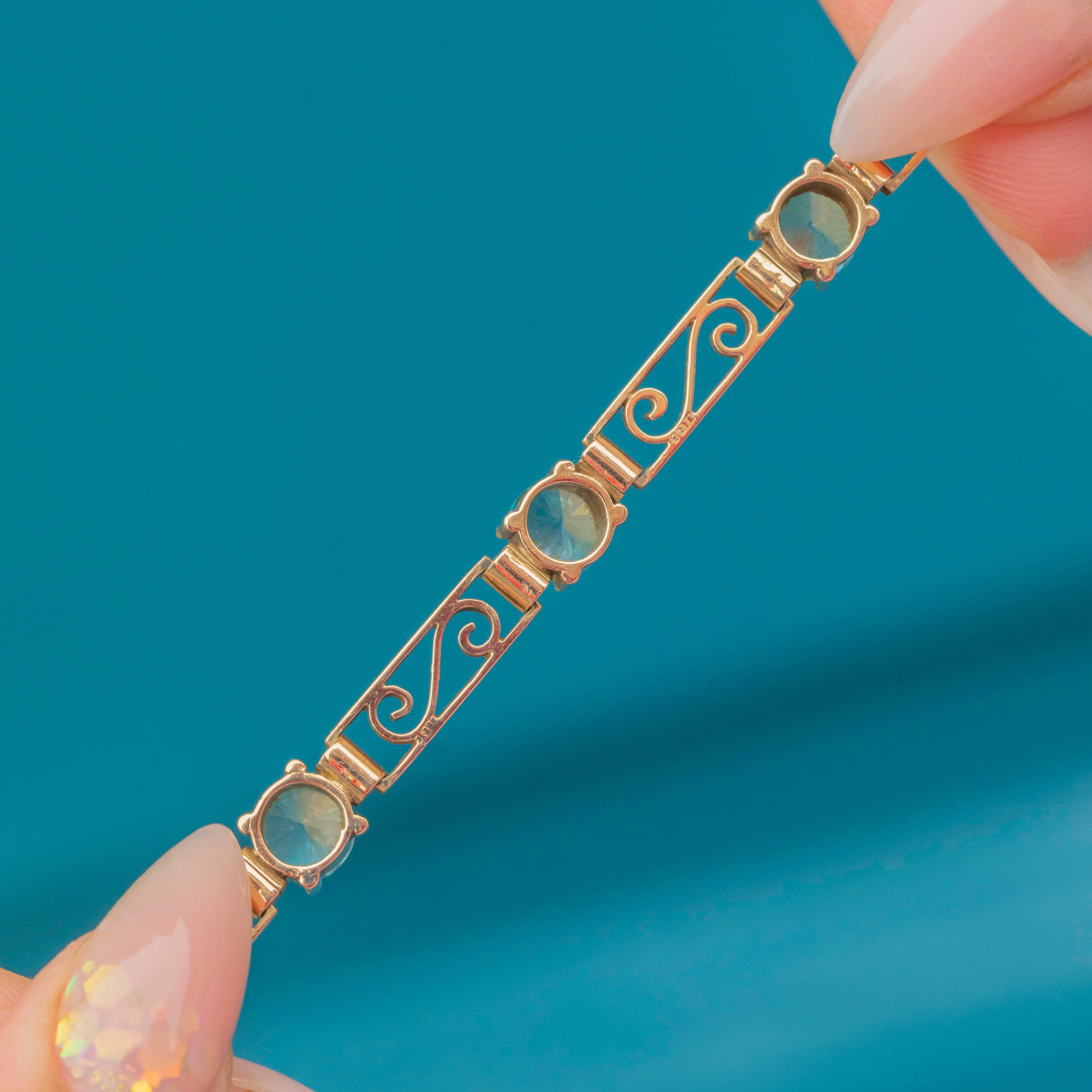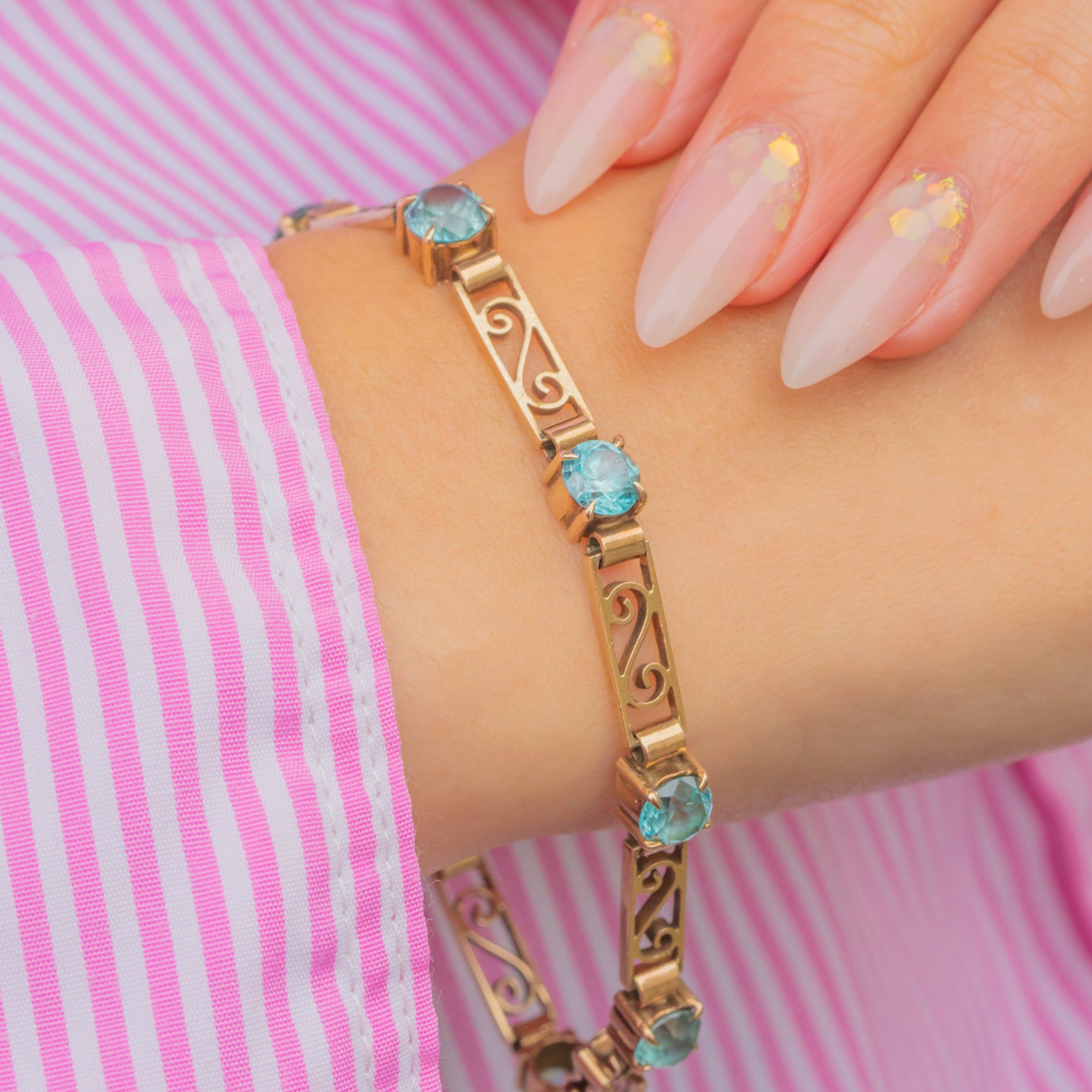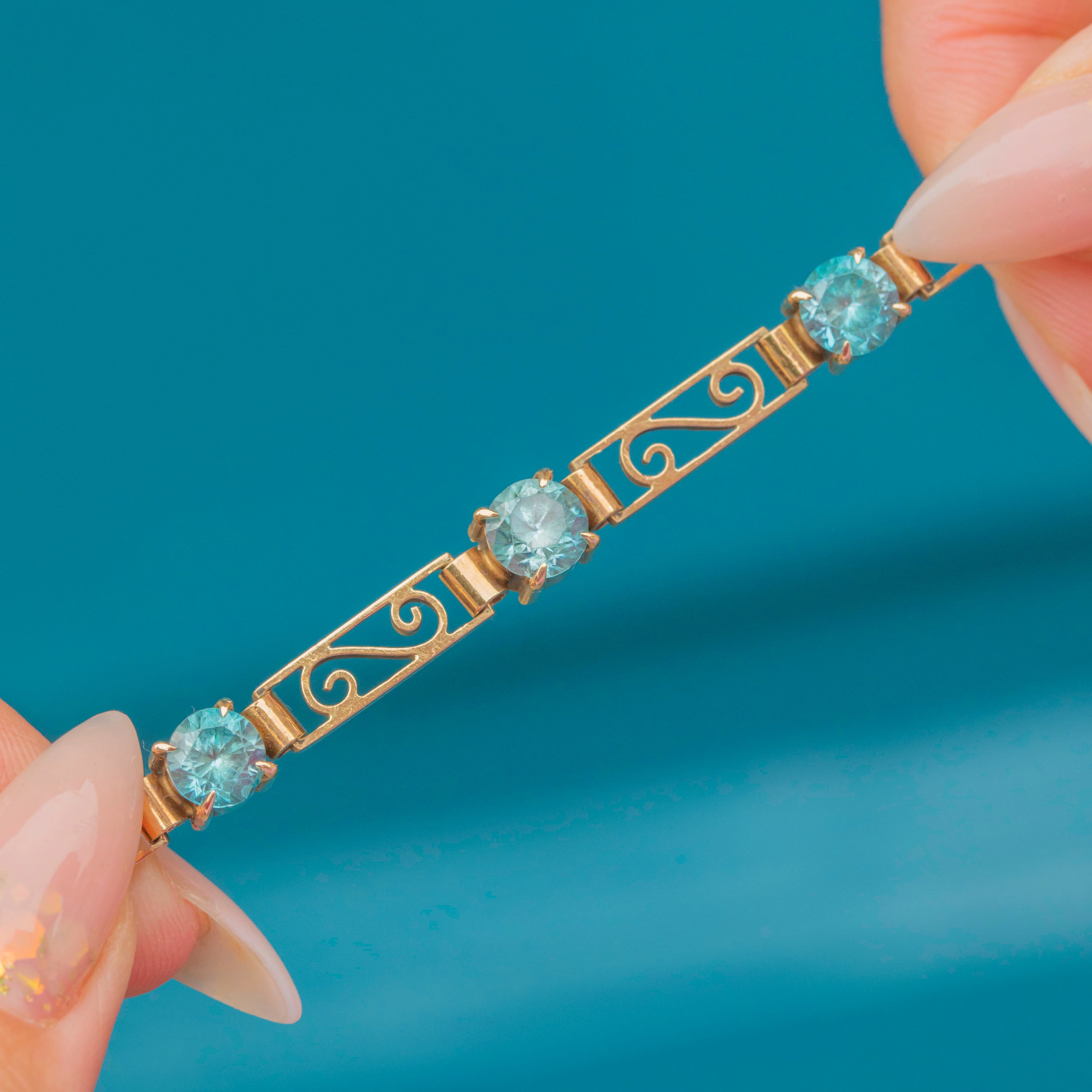 The Blue Zircons weigh an impressive total of 4.56 carats, glowing with their characteristic brilliance and vivid teal-blue hue. This piece is both refined and eye-catching, making it a perfect statement bracelet for evening wear or as a treasured addition to a vintage jewellery collection.