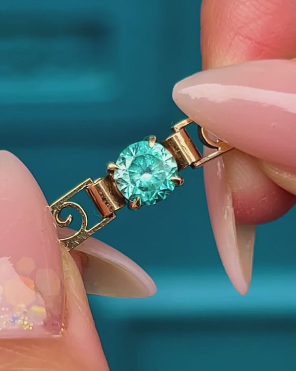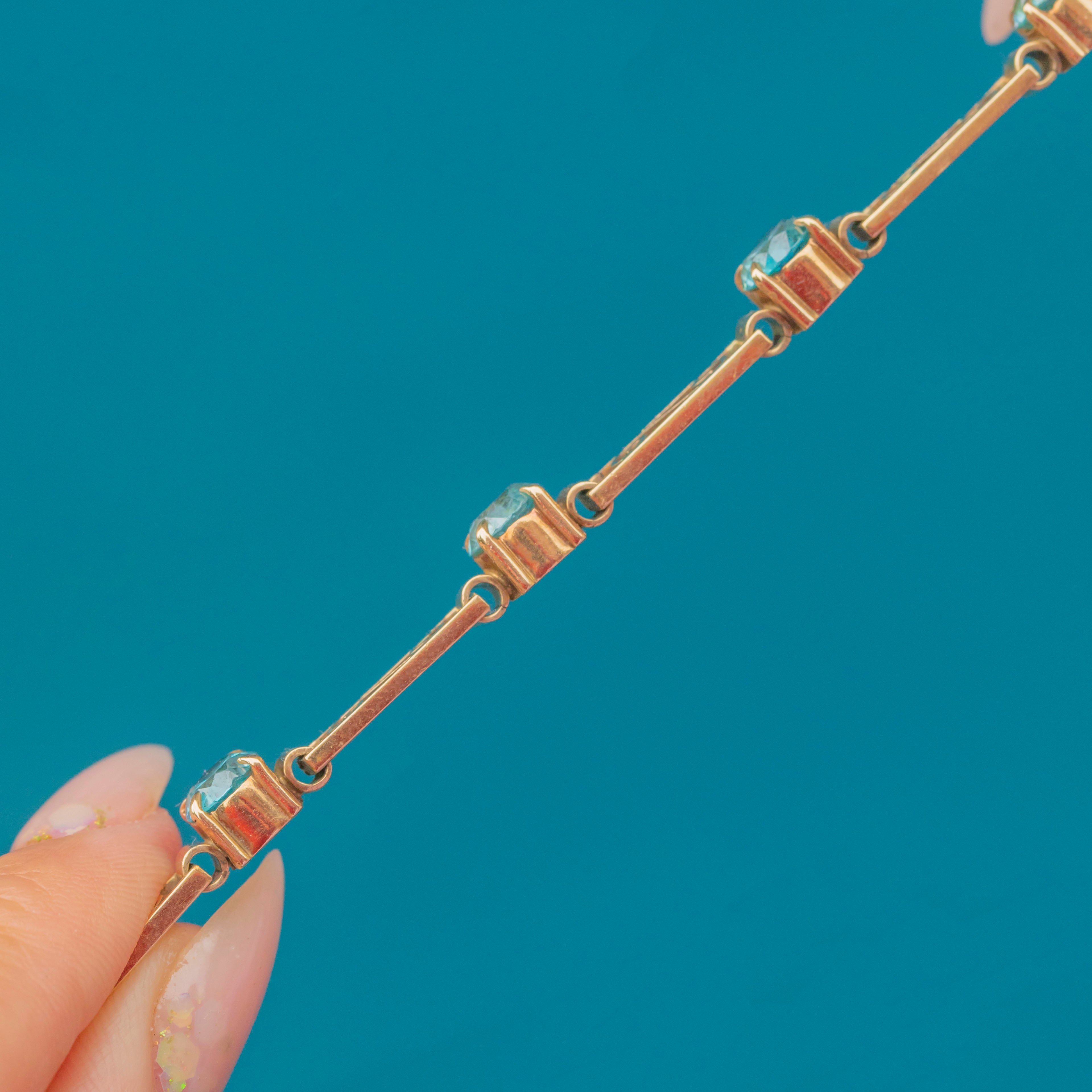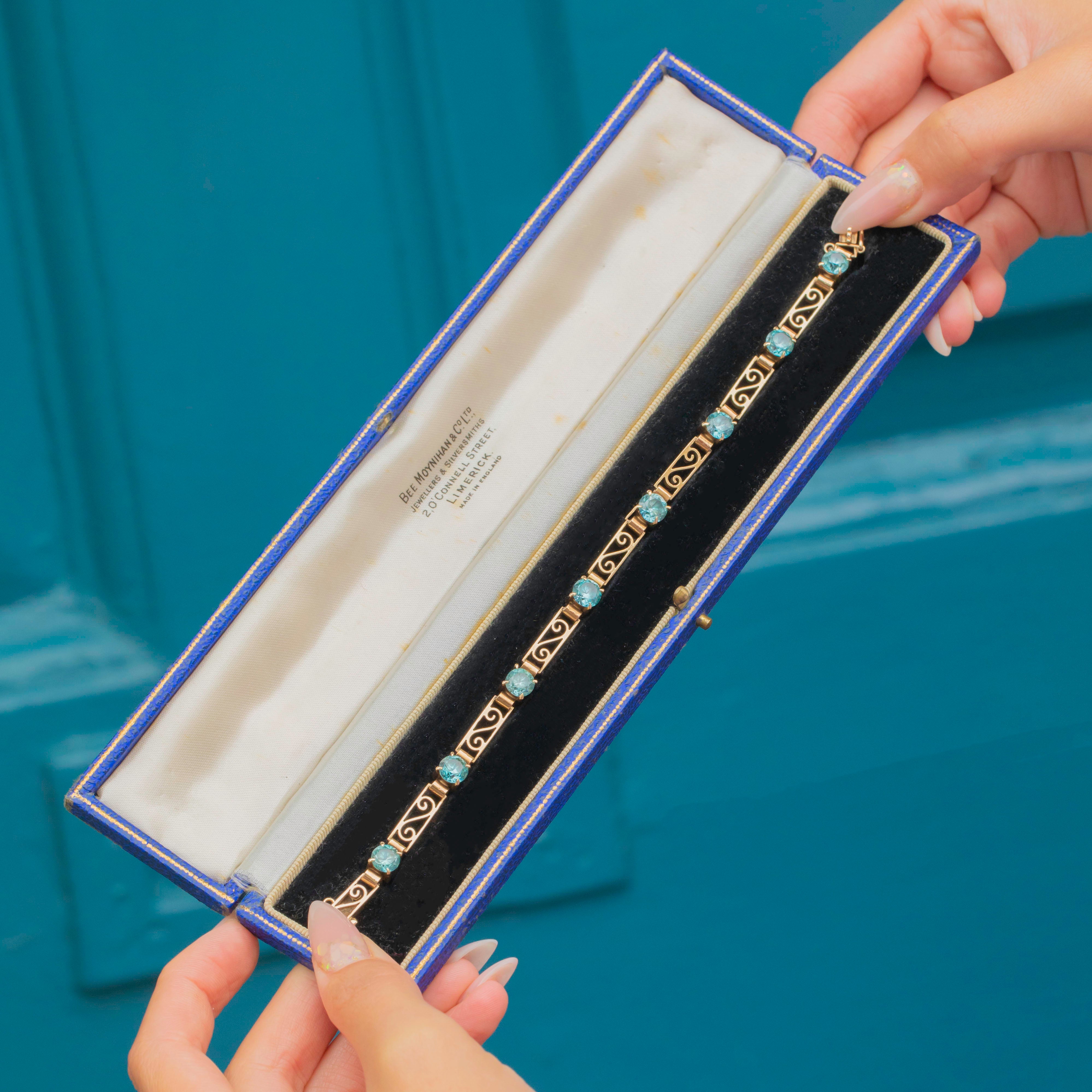 The Blue Zircons weigh an impressive total of 4.56 carats, glowing with their characteristic brilliance and vivid teal-blue hue. This piece is both refined and eye-catching, making it a perfect statement bracelet for evening wear or as a treasured addition to a vintage jewellery collection.