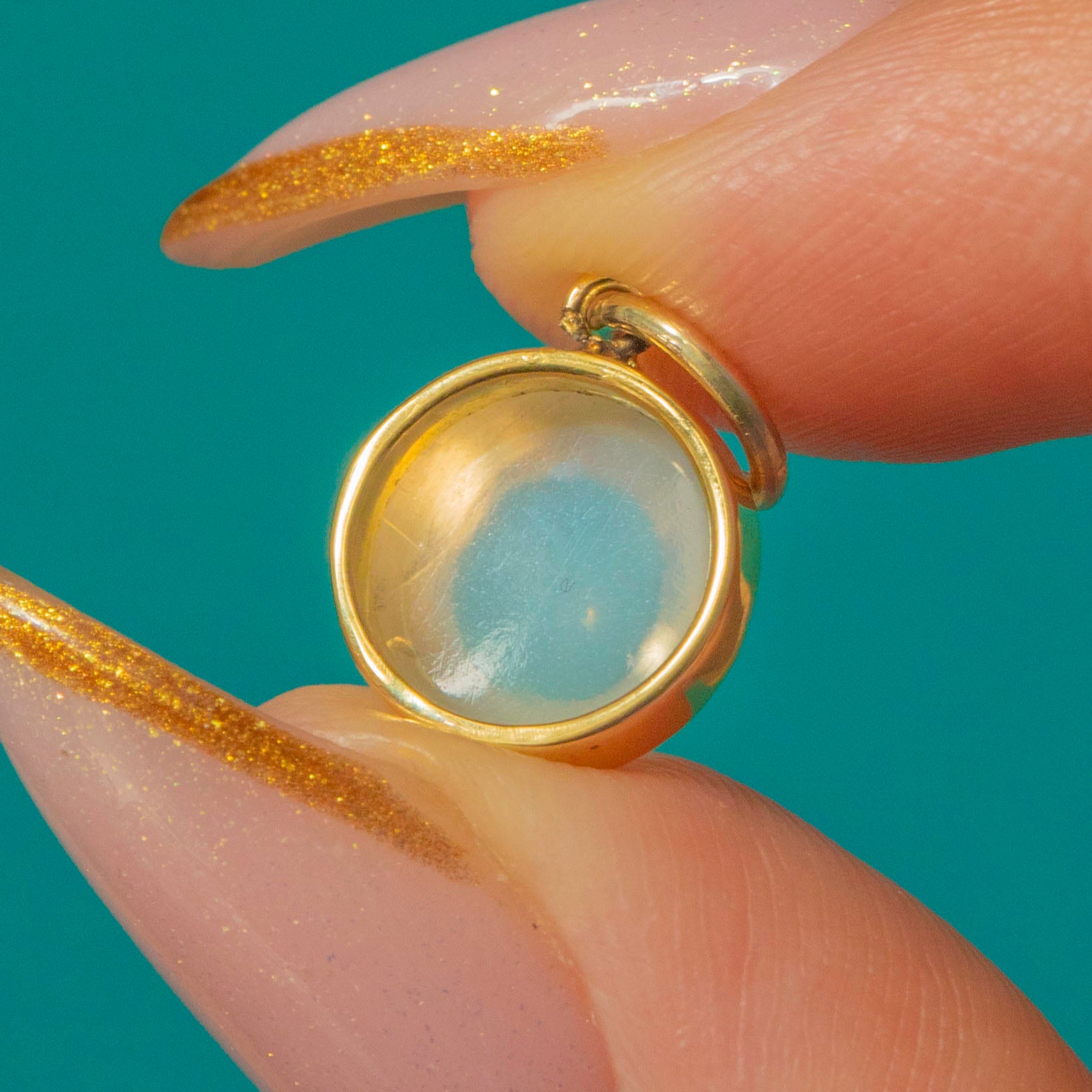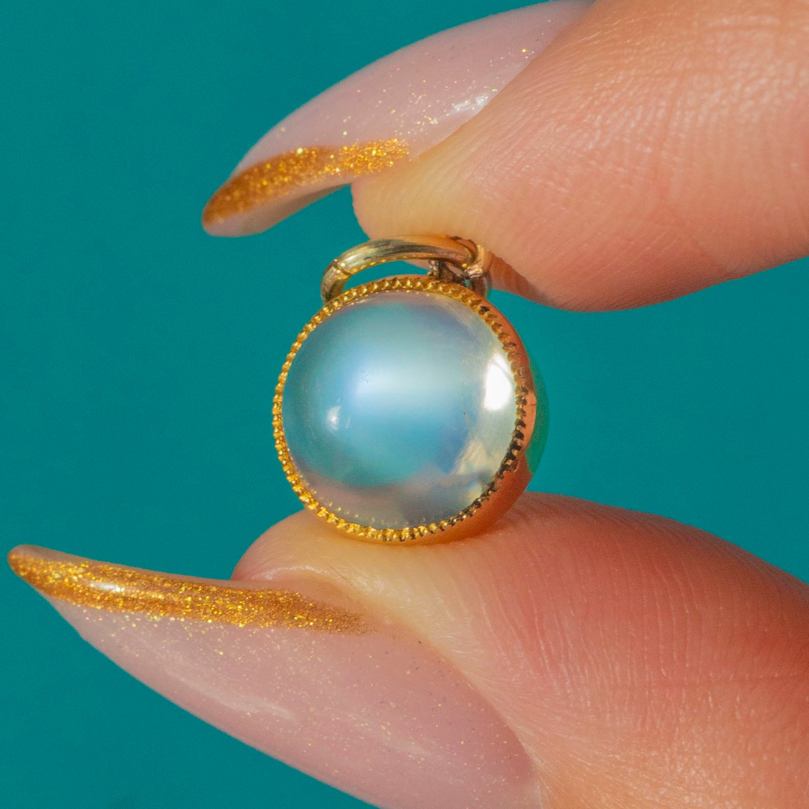 EXCELLENT: The Moonstone cabochon is smooth and glossy with no obvious chips, cracks or abrasions under normal viewing. The 9ct Gold bezel and jump ring are secure and well preserved with only light surface wear consistent with age. A charming antique pendant, ready to wear and enjoy.