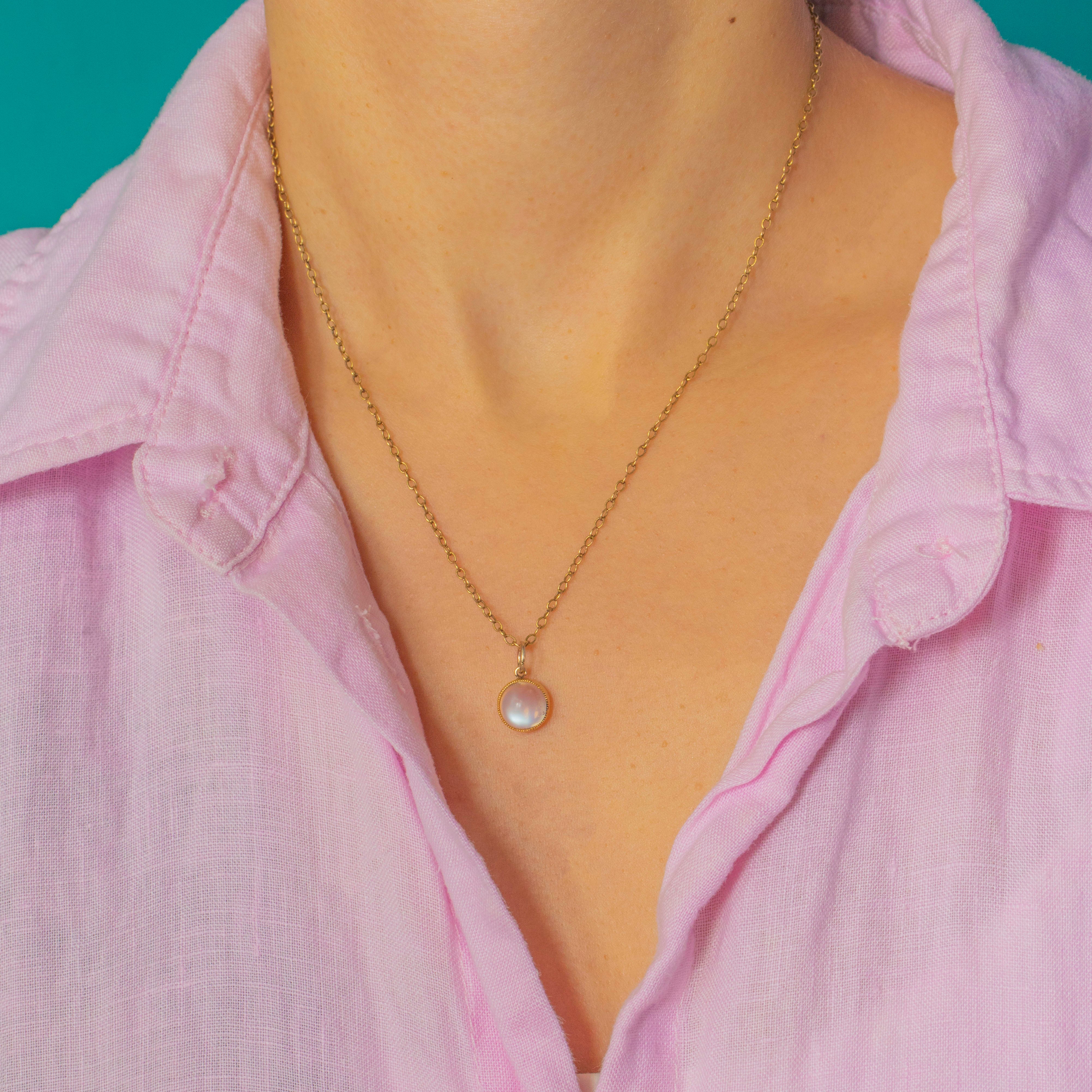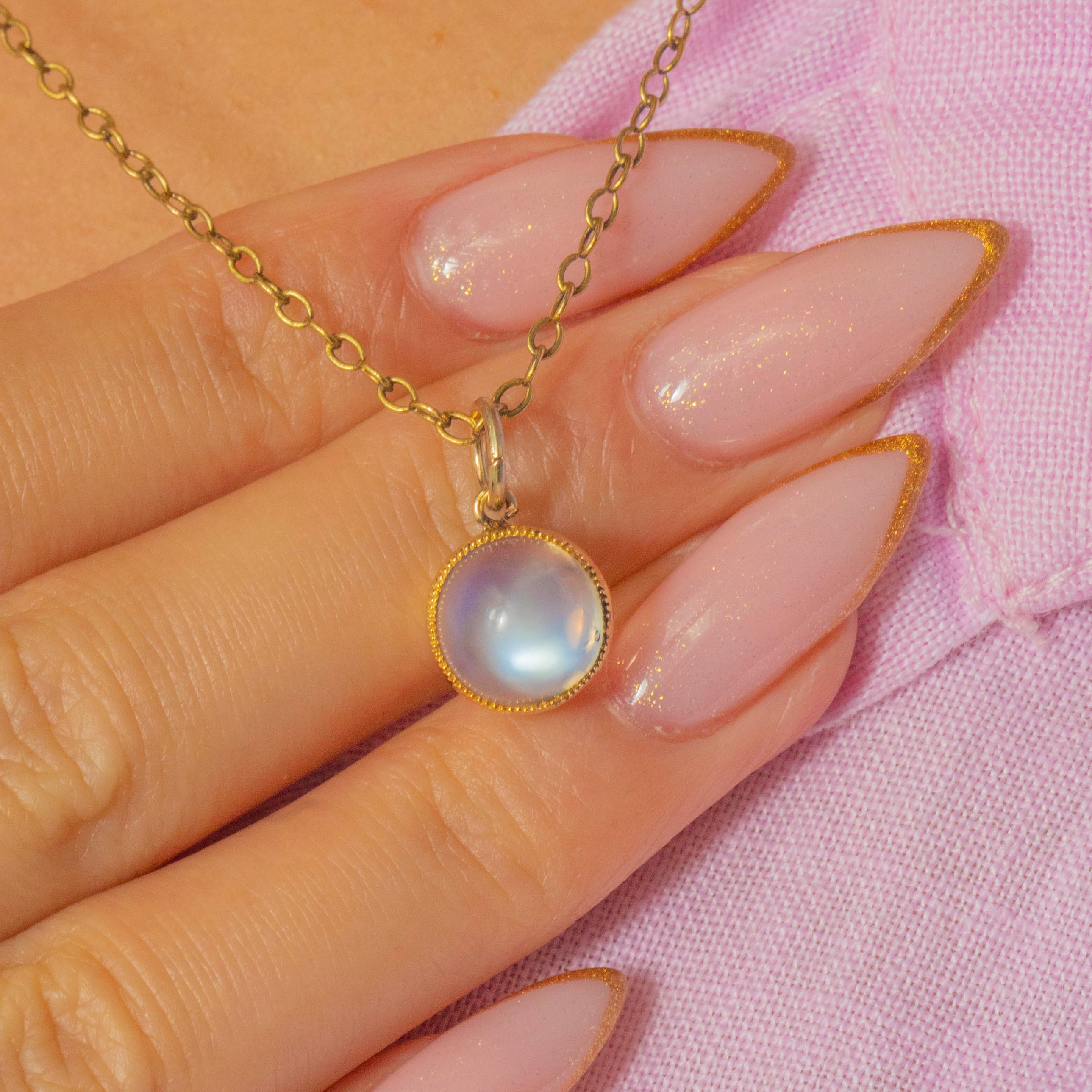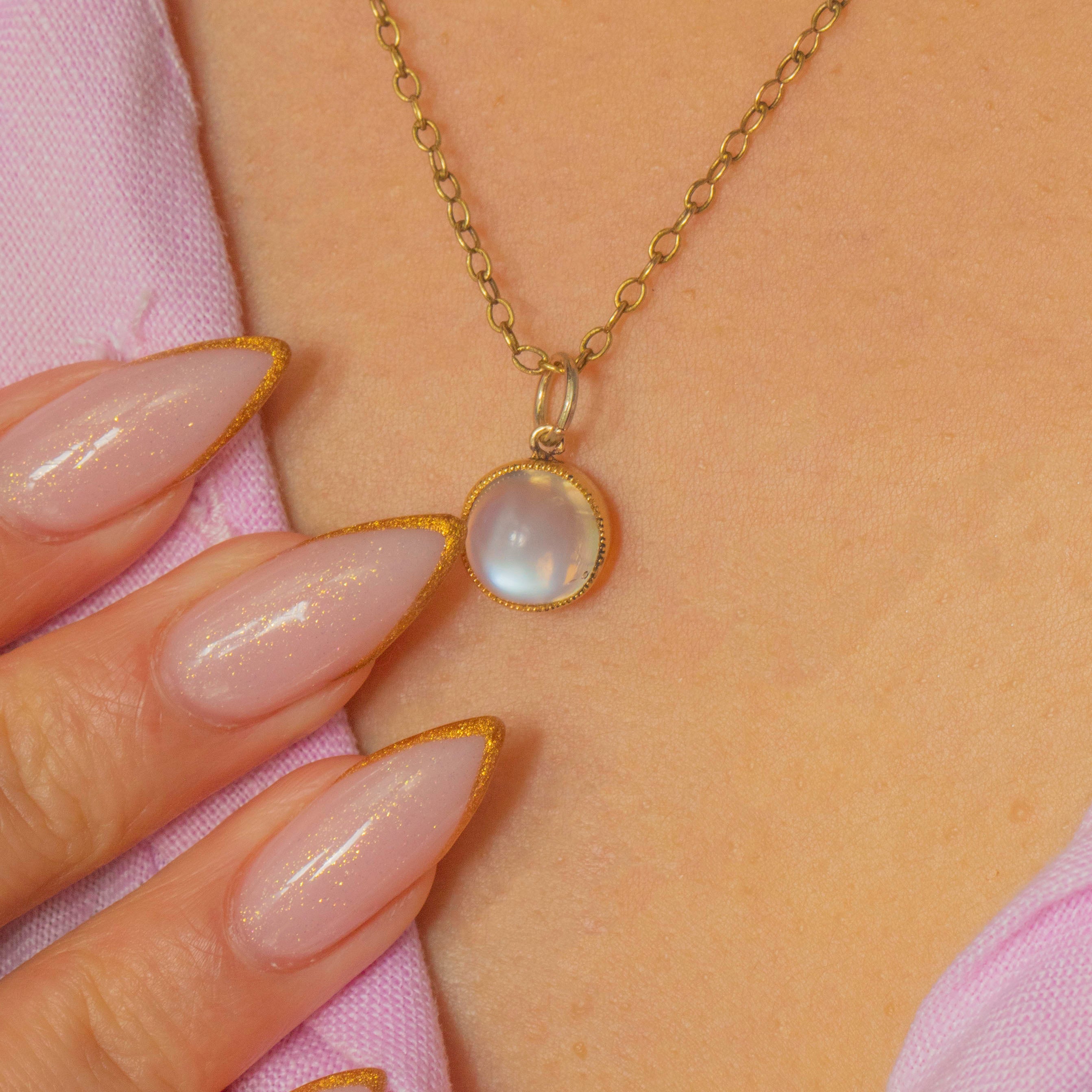A dreamy Victorian Moonstone pendant crafted in glowing 9ct Gold. The rounded 2.95ct Moonstone cabochon shows a gorgeous soft sheen, with that ethereal adularescence that shifts as it moves. Simple and elegant, it’s the perfect everyday charm to wear solo or layered with your favourite chains.